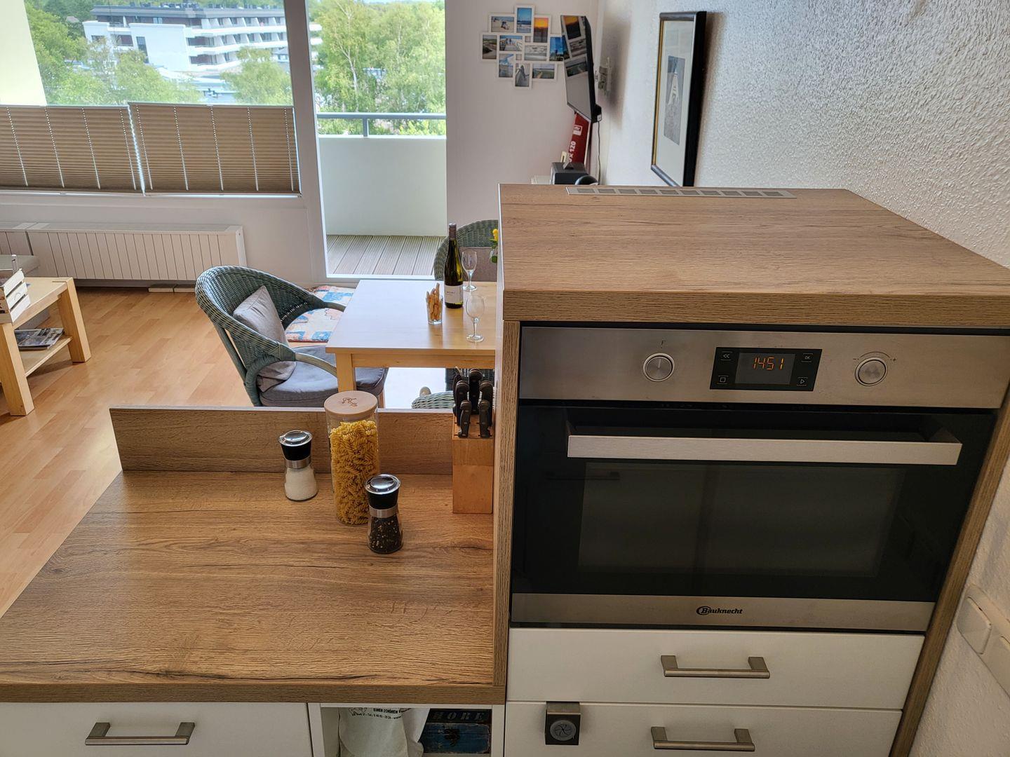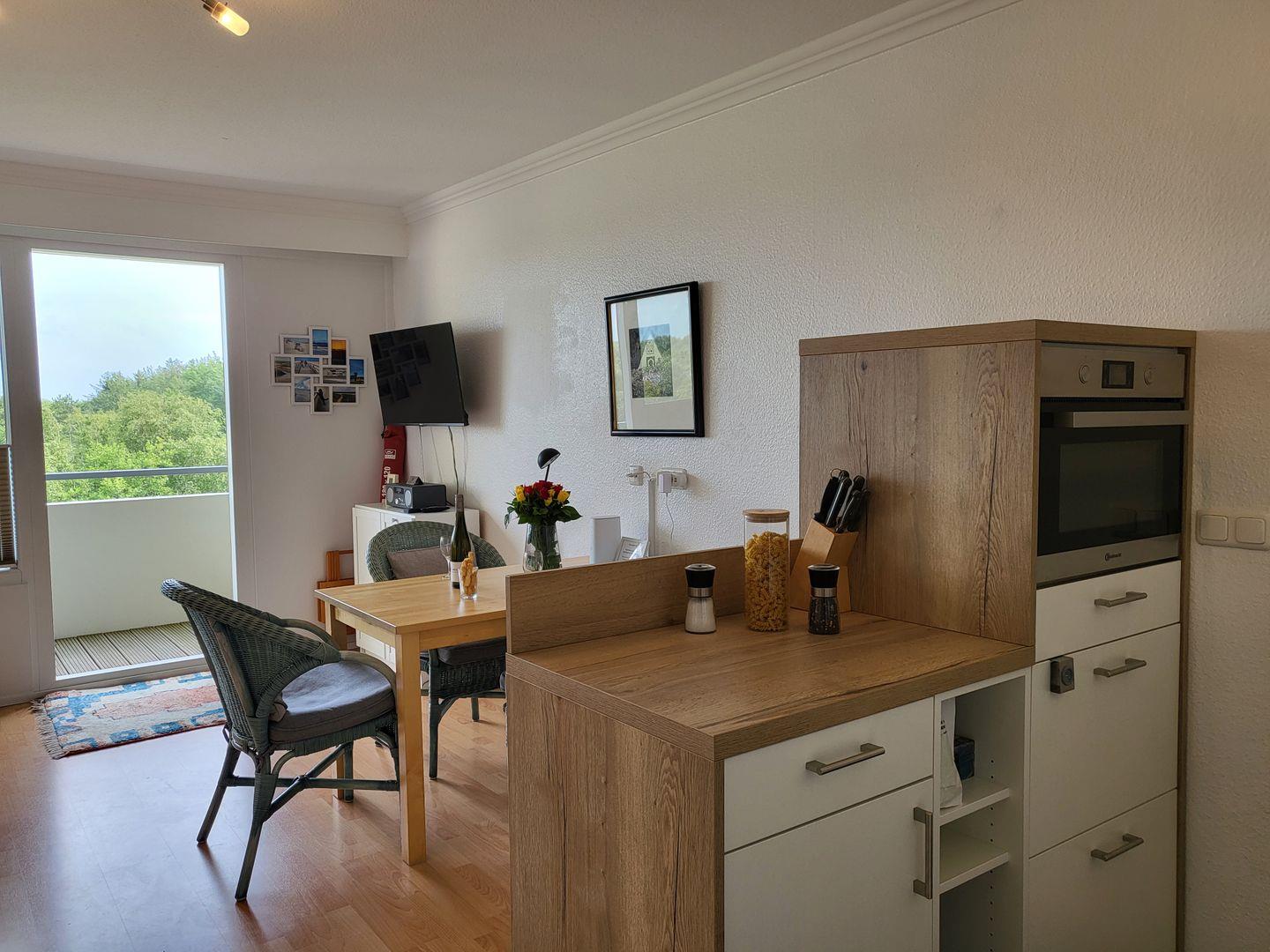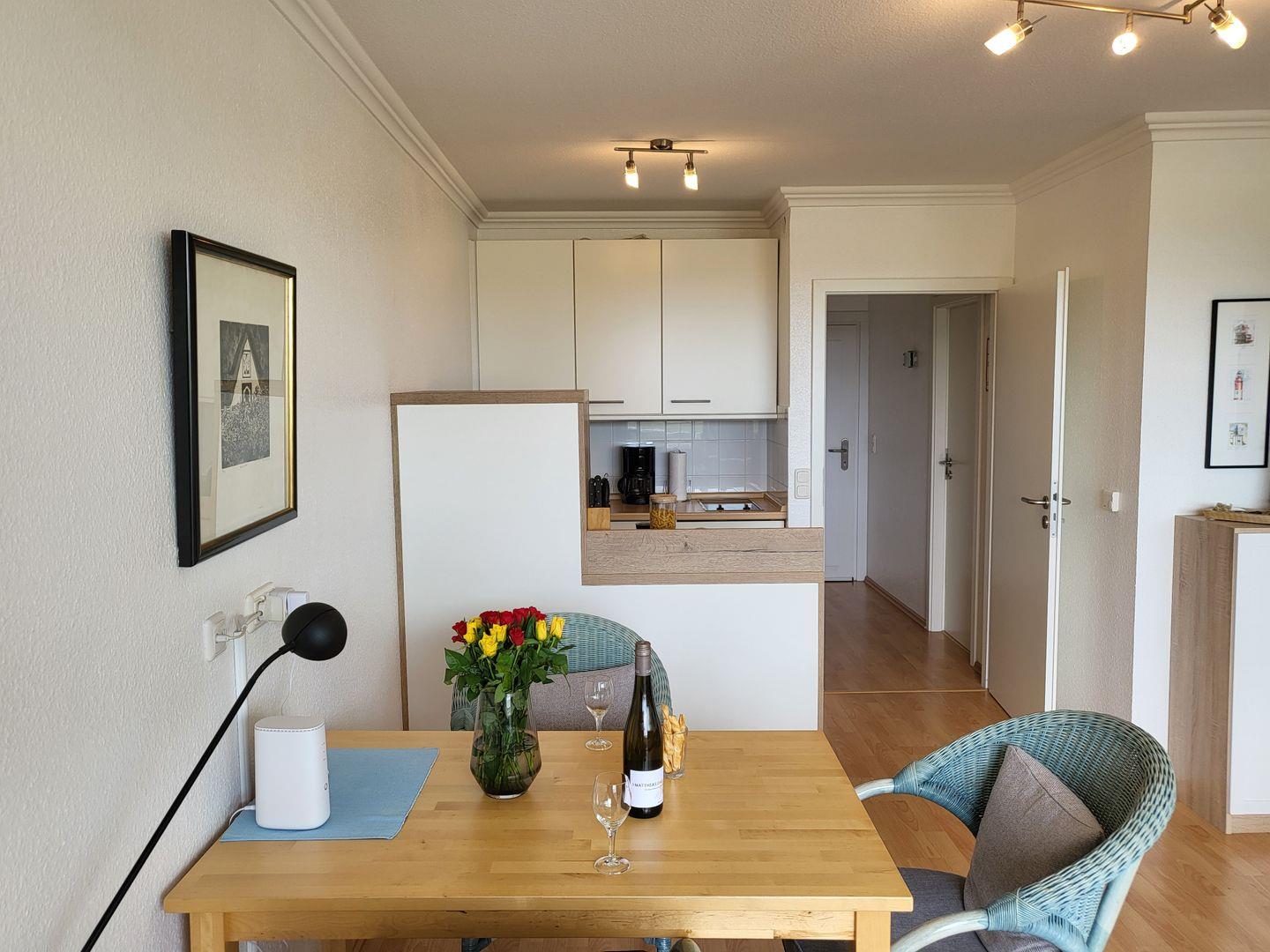 In den Raum integriert liegt die offene Küche der Ferienwohnung.