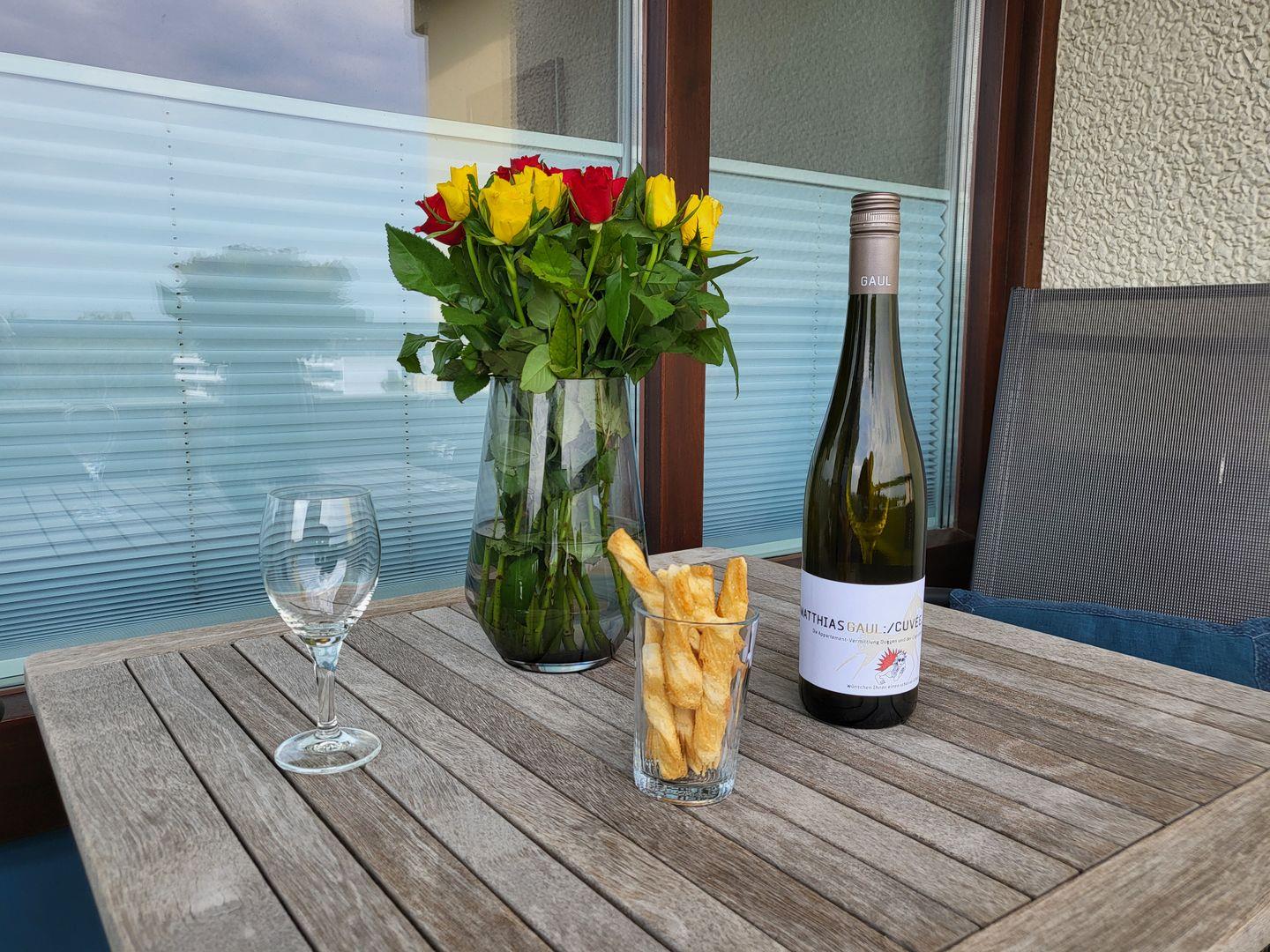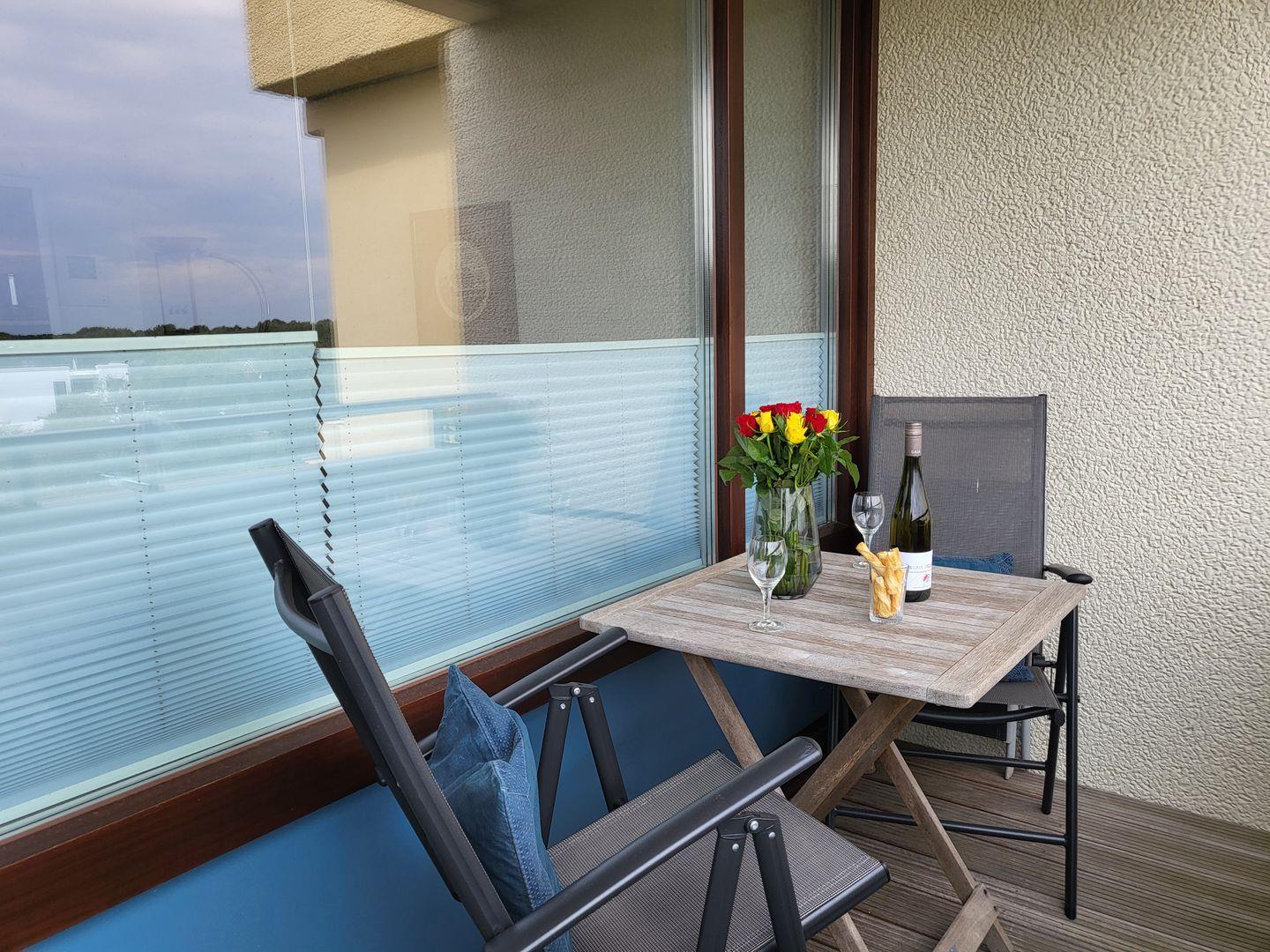 Zur Ferienwohnung gehört ein großer, möblierter Balkon. Auch der Urlaub mit Hund in St. Peter-Ording ist hier möglich.
