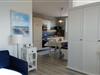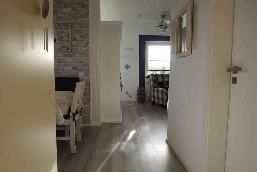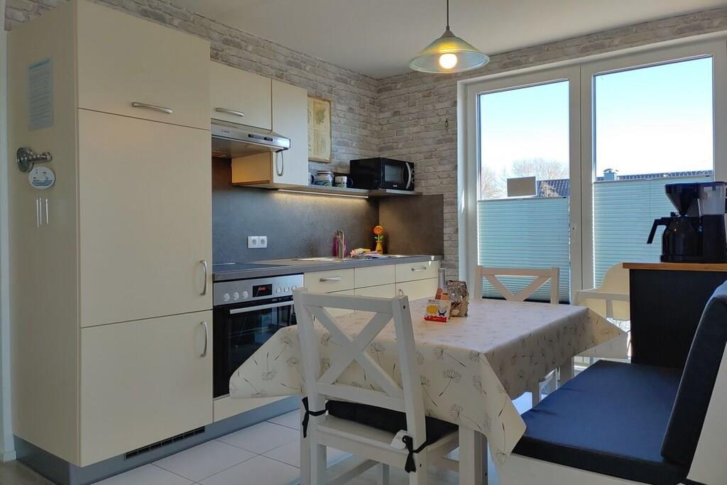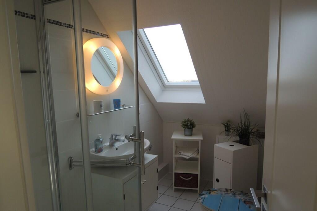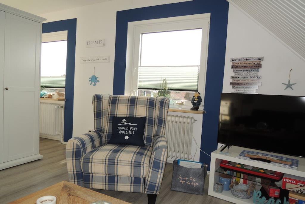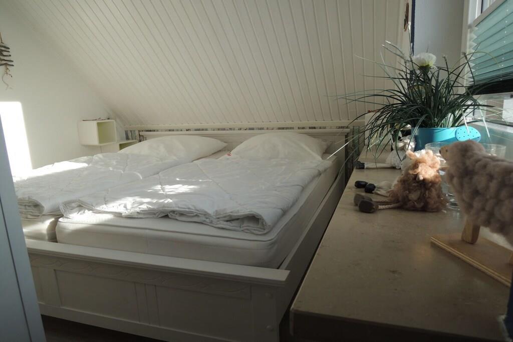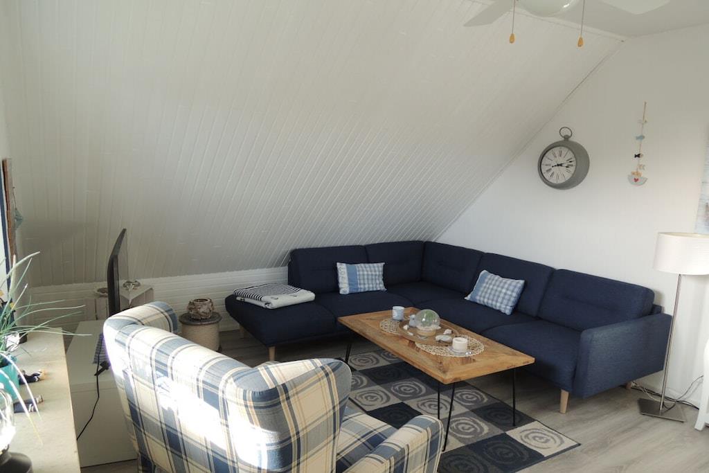 Im maritimen Style eingerichtete Fewo mit Dachloggia, ca.45 qm, Südwestlage, Gartenbenutzung. Ein Kleiderschrank als Raumteiler trennt den Wohnbereich vom Schlafbereich (Doppelbett 180/200 cm). Im separaten Schlaf- bzw. Kinderzimmer steht ein Doppelbett (140/200 cm). SAT-TV mit DVD. Kinderspielecke mit Velo-Spieltisch, Labyrinth, Tischflipper, Twister etc . Fenster mit Verdunkelungsrollo. Die Küchenzeile ist komplett ausgestattet: Kühlschrank mit Gefrierfach, Backofen, Herd mit Ceranfeld, Kaffeevollautomat, Kaffeemaschine, Wasserkocher, Toaster, Mikrowelle, ausreichend Geschirr, Gläser und Besteck. Duschbad mit Dachfenster, Reisefön ist vorhanden. Küche, Diele und Wohnraum sind offen gestaltet. 1 reservierter Pkw-Stellplatz. Waschmaschine gegen Gebühr in einem Gästewaschraum (2,50 Euro). Eigenes abschließbares Gartenhaus für Ihre Fahrräder. Gemeinschafts-Fahrradständer hinter dem Haus.