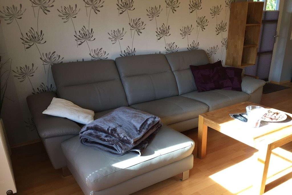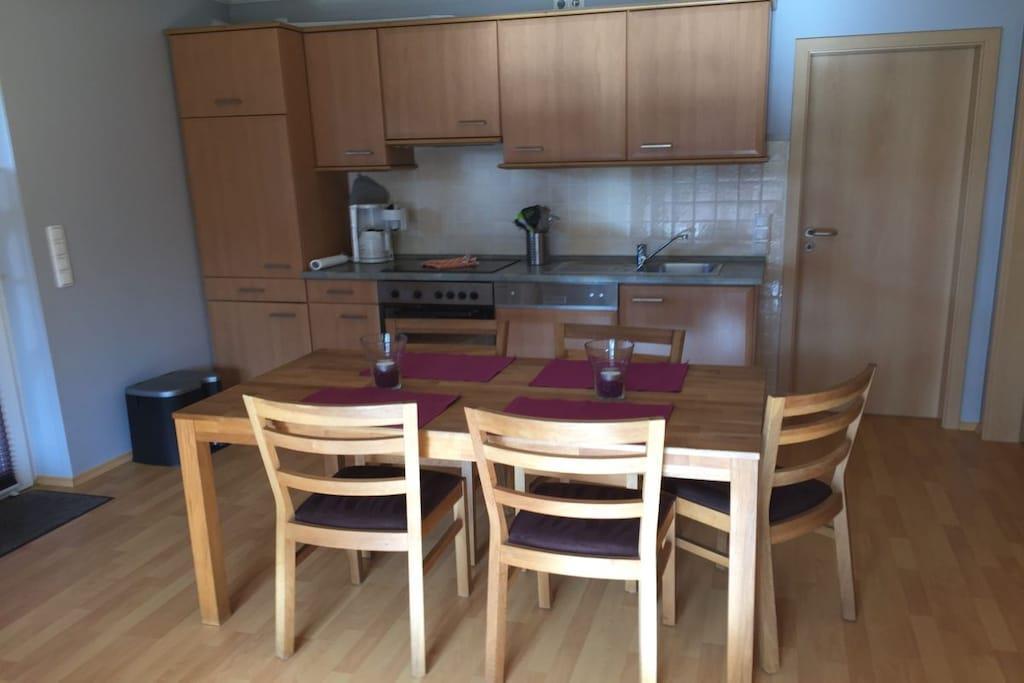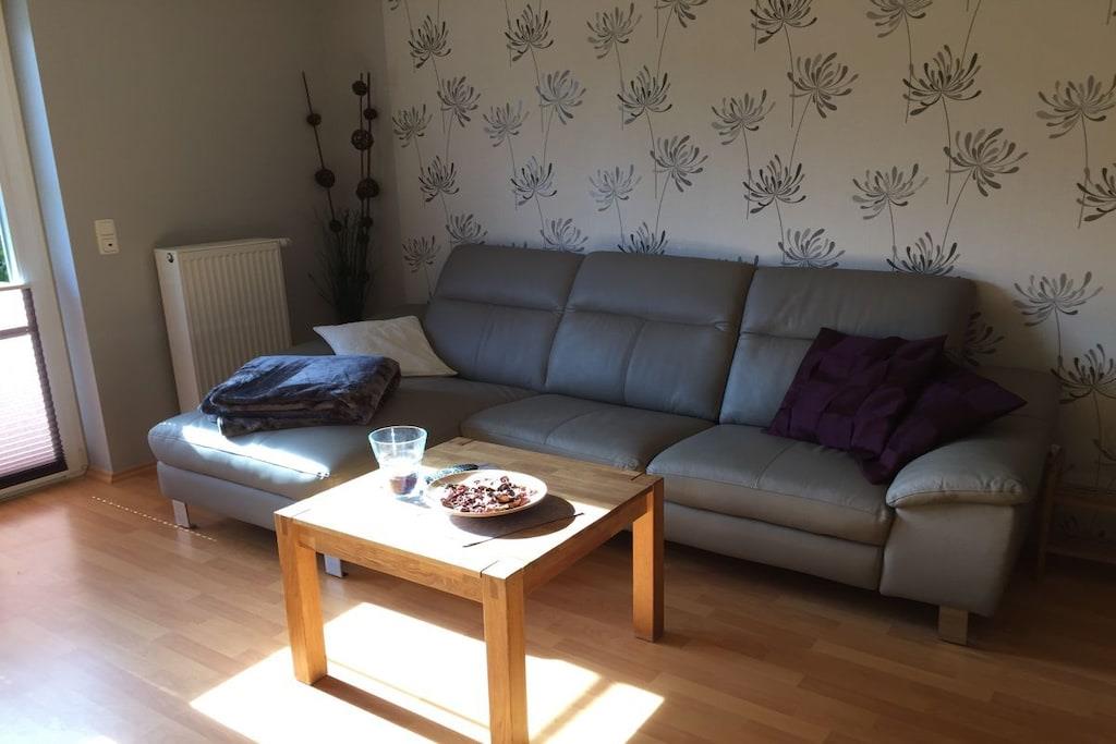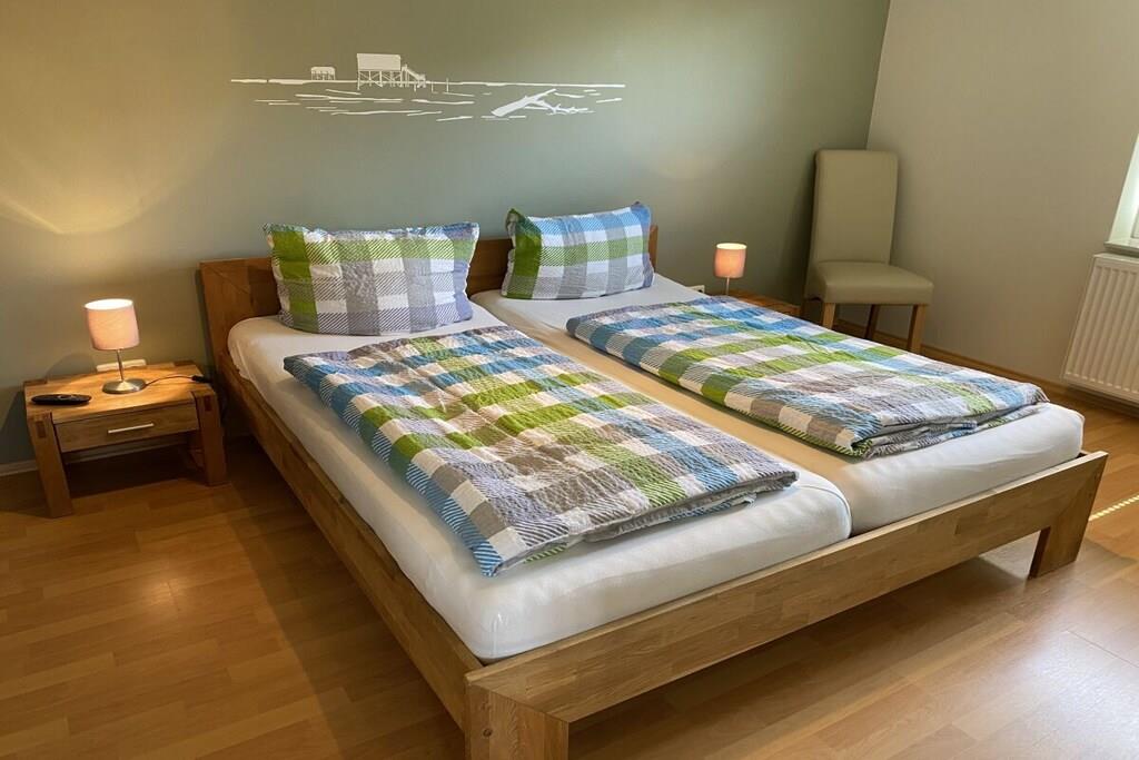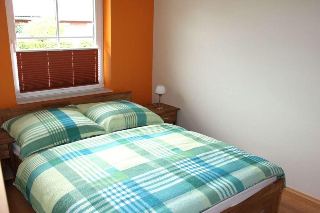 Unsere Terrassenwohnung hat eine Gesamtgröße von 70 qm und für bis zu 4 Personen eingerichtet. Sie bietet zwei Schlafzimmer mit je einem Doppelbett (180x200 und 140x200). Im großen Wohn-Essraum steht eine Leder- Eckgarnitur (Sat-TV, CD-MC, MP3, DVD). Die Küchenzeile ist komplett eingerichtet u. a. mit Ceranfeld, Umluftbackofen, Geschirrspülmaschine, Mixer, Toaster, Kaffeemaschine, Kühlschrank, Wasserkocher etc. Im Badezimmer befindet sind eine Dusche/WC (gefliest). und der Fußboden in den Wohnräumen ist mit Laminat ausgelegt. Im separaten Raum steht eine Waschmaschine und ein Gefrierschrank. Die große Terrasse lädt zum Sonnenbaden ein. Auf der Terrasse steht ein Tisch mit 6 Stühlen, Liegen und ein Sonnenschirm. Parkplatz vor dem Haus