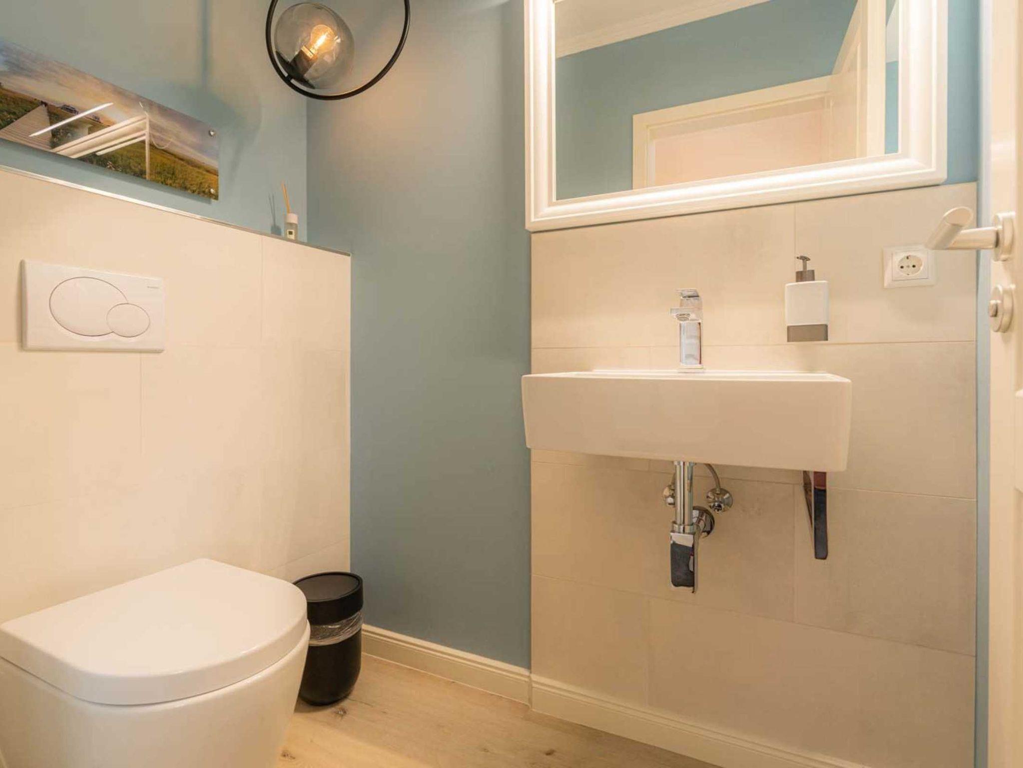Wohnzimmer mit Ecksofa (2-3 Personen), Sessel, Kaminofen, großem TV (Sat) und Esstisch mit 4 Stühlen nebst komfortabler Sitzbank. Direkter Zugang zur möblierten Gartenterrasse mit Strandkorb nach Südwesten. Offene Küche mit Backofen, Geschirrspüler, Kühlschrank mit Gefrierfach und Nespressomaschine. Eine Mikrowelle steht im Abstellraum unter der Treppe.