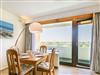 Wohnzimmer mit Sofa für 2-3 Personen, 2 Sesseln, TV (Sat), BluRay-Player, Stereoanlage und Esstisch mit vier Stühlen. Direkter Zugang zum möblierten Balkon nach Westen mit herrlichem Ausblick über den Wald. Halboffene Küche mit Backofen, Mikrowelle, Kühlschrank mit Gefrierfach, Philips Senseo Kapsel-Kaffeemaschine und Tresen zum Wohnbereich mit 2 Barstühlen.