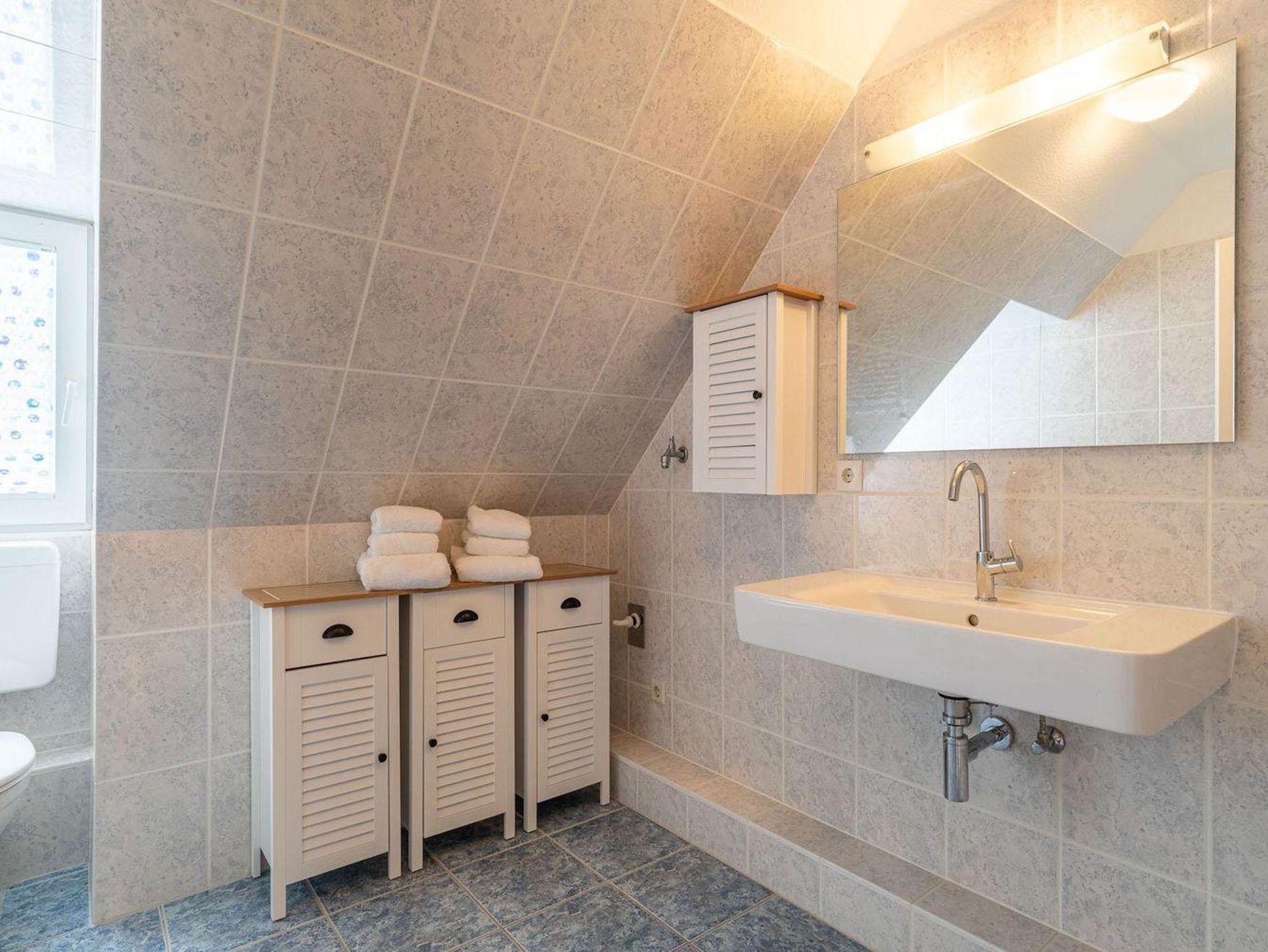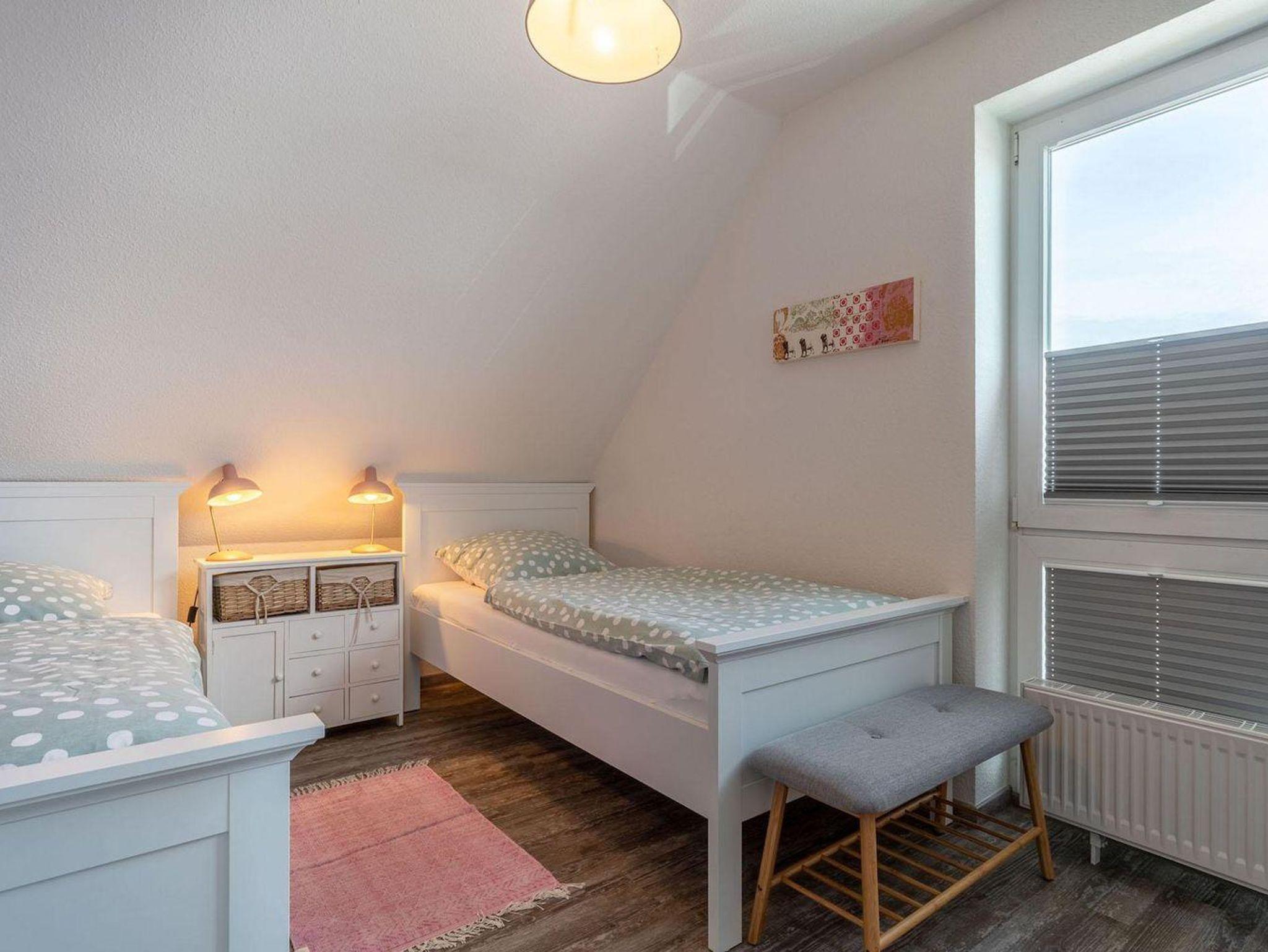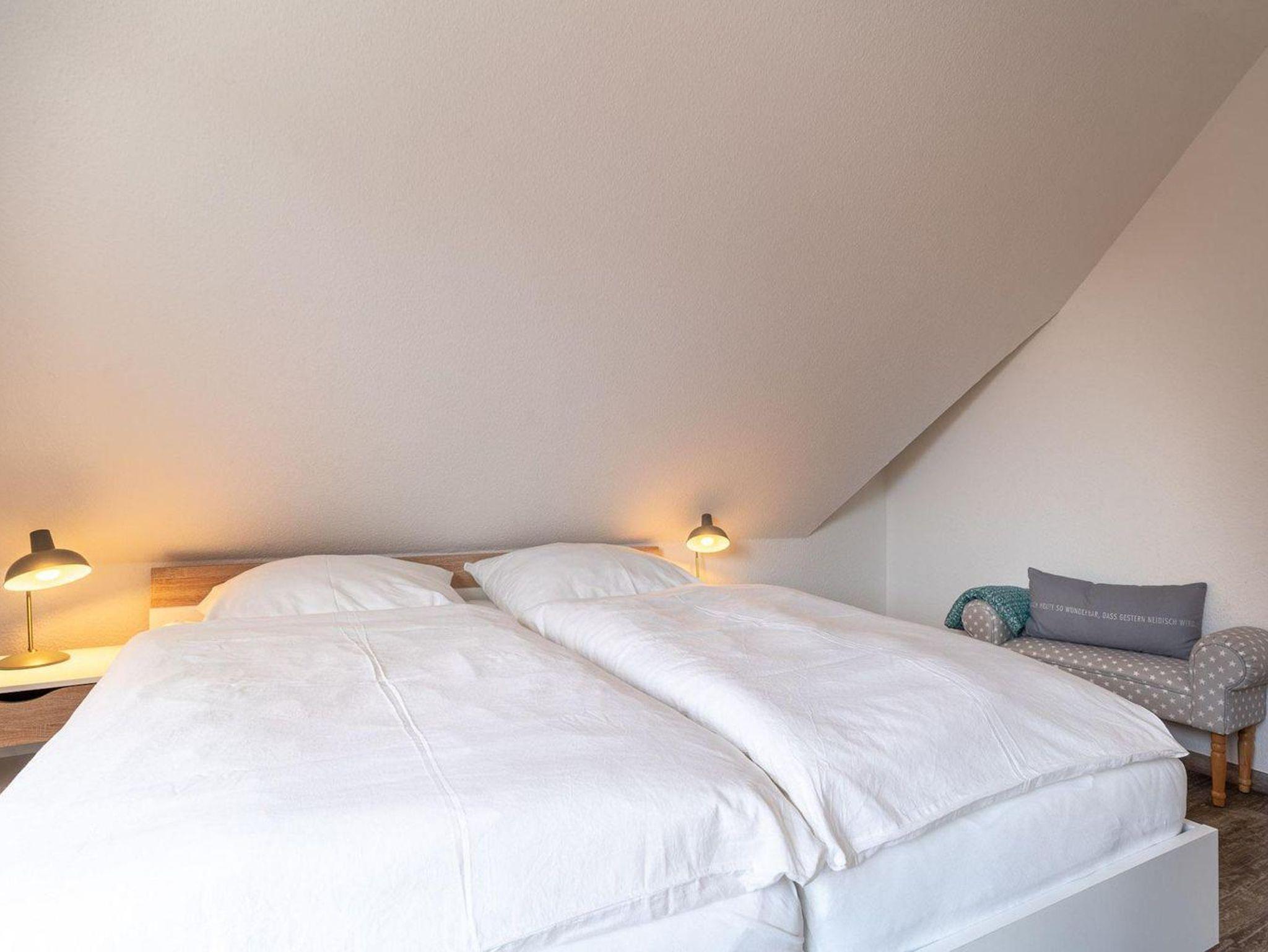 Das Duschbad ist großzügig gestaltet und bietet genügend Platz für Ihre Utensilien. Das Schlafzimmer mit 180er Doppelbett sorgt für ruhevolle Erholung. Aus dem weiteres Doppelzimmer mit 2 Einzelbetten haben Sie einen einzigartigen Blick bis zum Westerhever Leuchtturm.