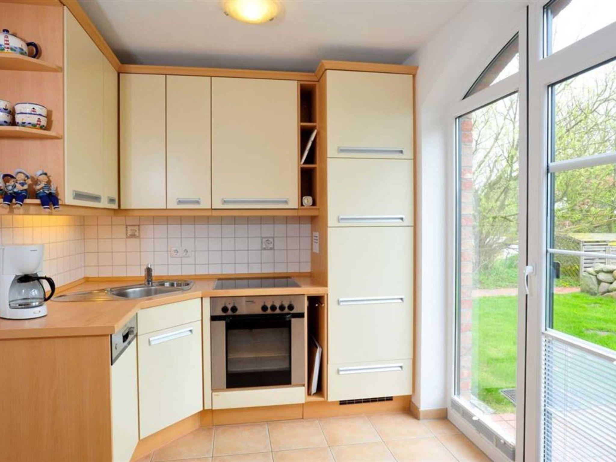 Helles Wohnzimmer mit Sofa (3er), 2 Sesseln, TV (Sat), DVD-Player, Hifi-Anlage, Kamin, Esstisch mit 6 Stühlen und 2 Austritten auf die beiden möblierten Gartenterrassen nach Nordosten und Osten mit Strandkorb. Offene Küche mit Backofen, Mikrowelle, Kühlschrank, separatem Gefrierschrank und Geschirrspüler.
