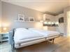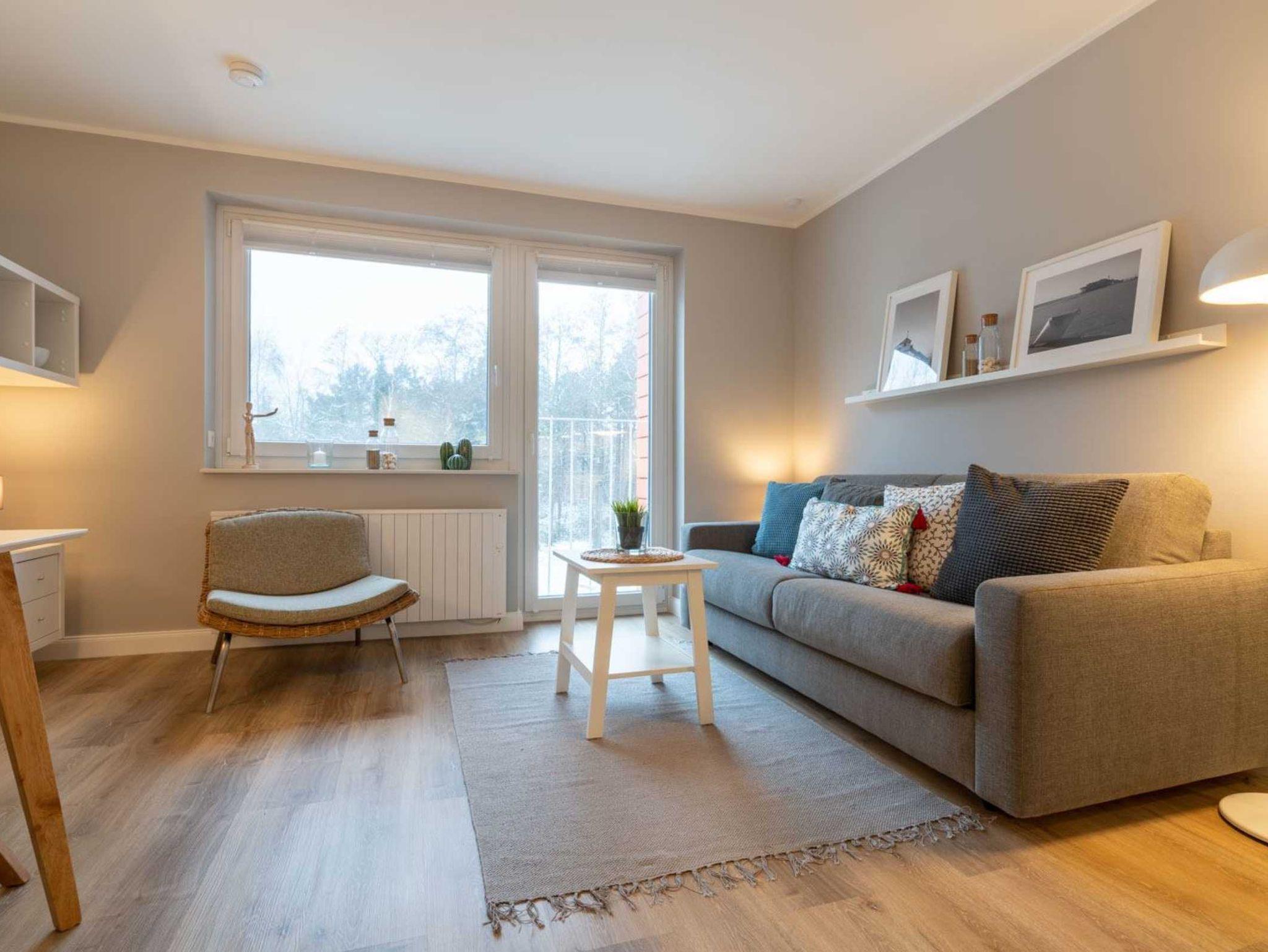 Wohn- und Schlafzimmer mit ausklappbarem Schlafsofa (160x195cm, mit rückenfreundlichem Ergoflex-Lattenrost und Matratze), Sessel, Esstisch für 2 Pesonen, TV (Sat) und CD-Player mit Radio. Französischer Balkon. Offene Küche mit Herd mit 2 Kochstellen, Backofen, Geschirrspüler und Kühlschrank mit Gefrierfach.