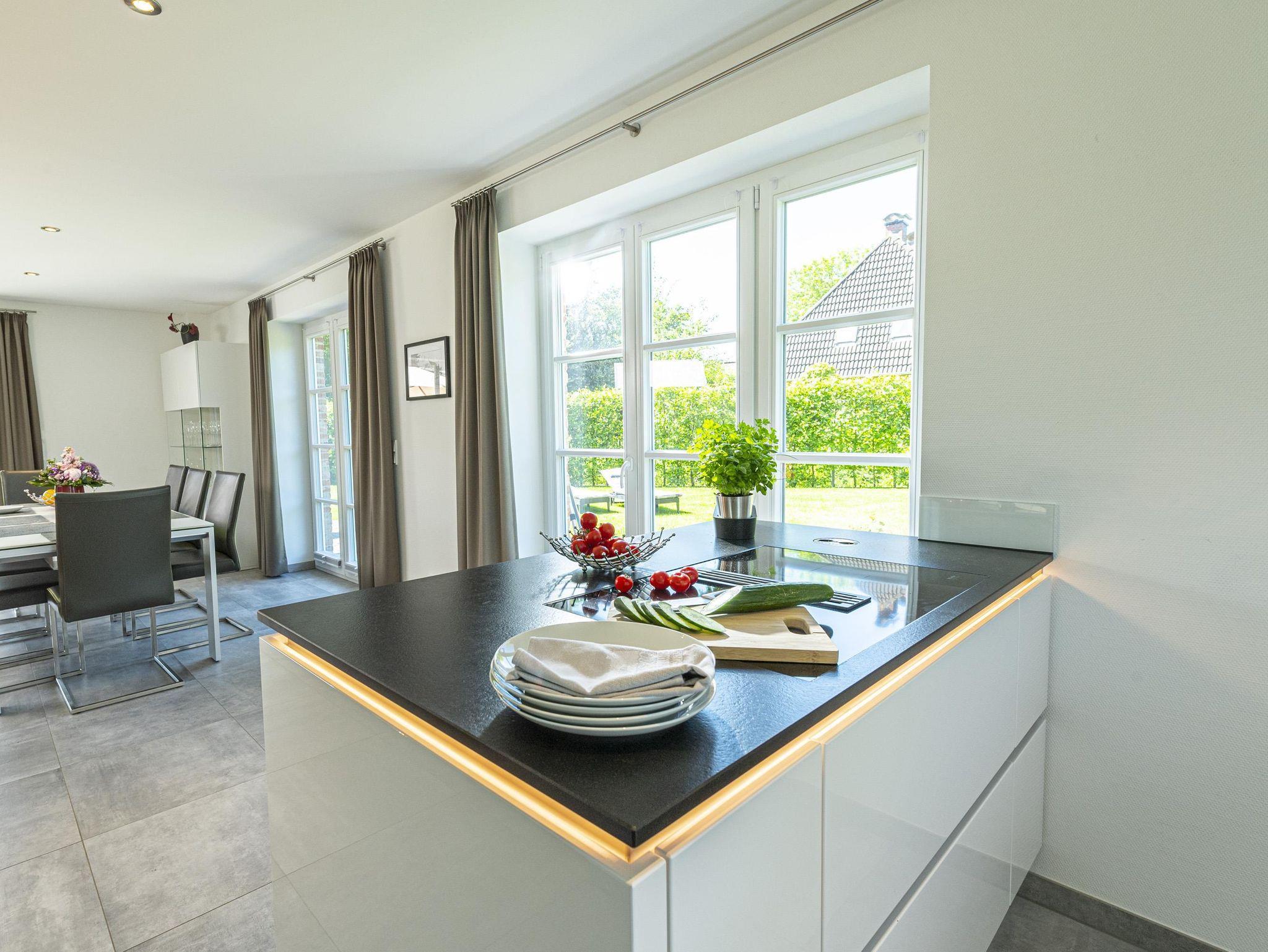 Angrenzend finden sich die luxuriös ausgestattete offene Küchenzeile mit modernen Geräten - hier wird gemeinsames Kochen im Urlaub zu einem besonderen Erlebnis! Neben einem Induktions-Kochfeld mit Dunstabzug, bietet die Küche sowohl Backofen als auch Dampfgarofen, Spülmaschine, Kaffeemaschine uvm. Vom Wohnbereich aus gelangt man auf die große Südterasse mit Strandkorb. Hier lässt sich der Urlaub zu jeder Tageszeit genießen. Egal ob in der gemütlichen Sitzecke oder im Strandkorb kann man seinen Blick über den großen Garten streifen lassen und sich vom Alltag erholen.