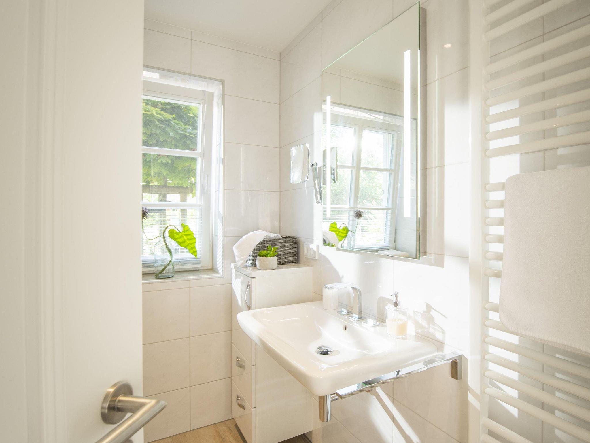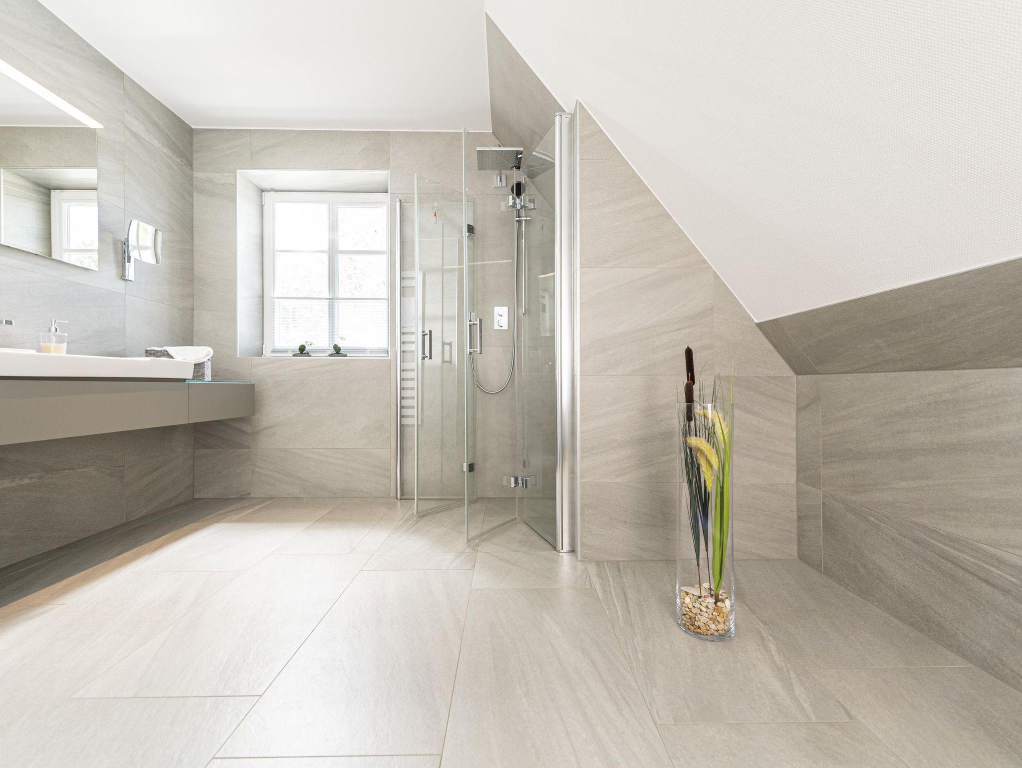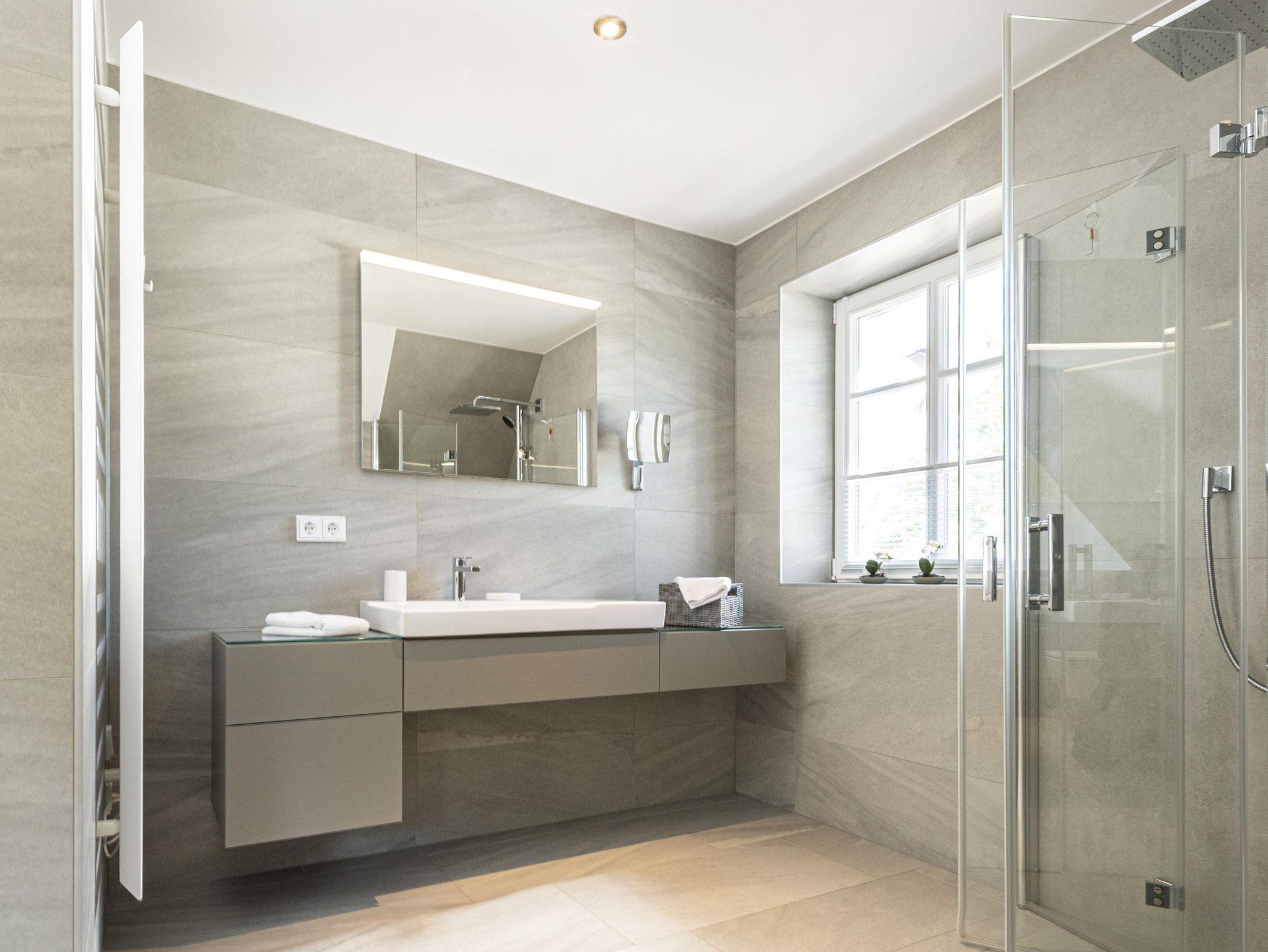 In der ersten Etage befinden sich zwei weitere Schlafzimmer, welche ebenfalls durch Großzügigkeit und Qualität überzeugen. Auch das große Badezimmer im Obergeschoss ist allein durch seine Größe und den luxuriösen Fließenspiegel ein Hingucker. Neben einer ebenerdigen Regendusche, befindet sich hier auch eine Badewanne.