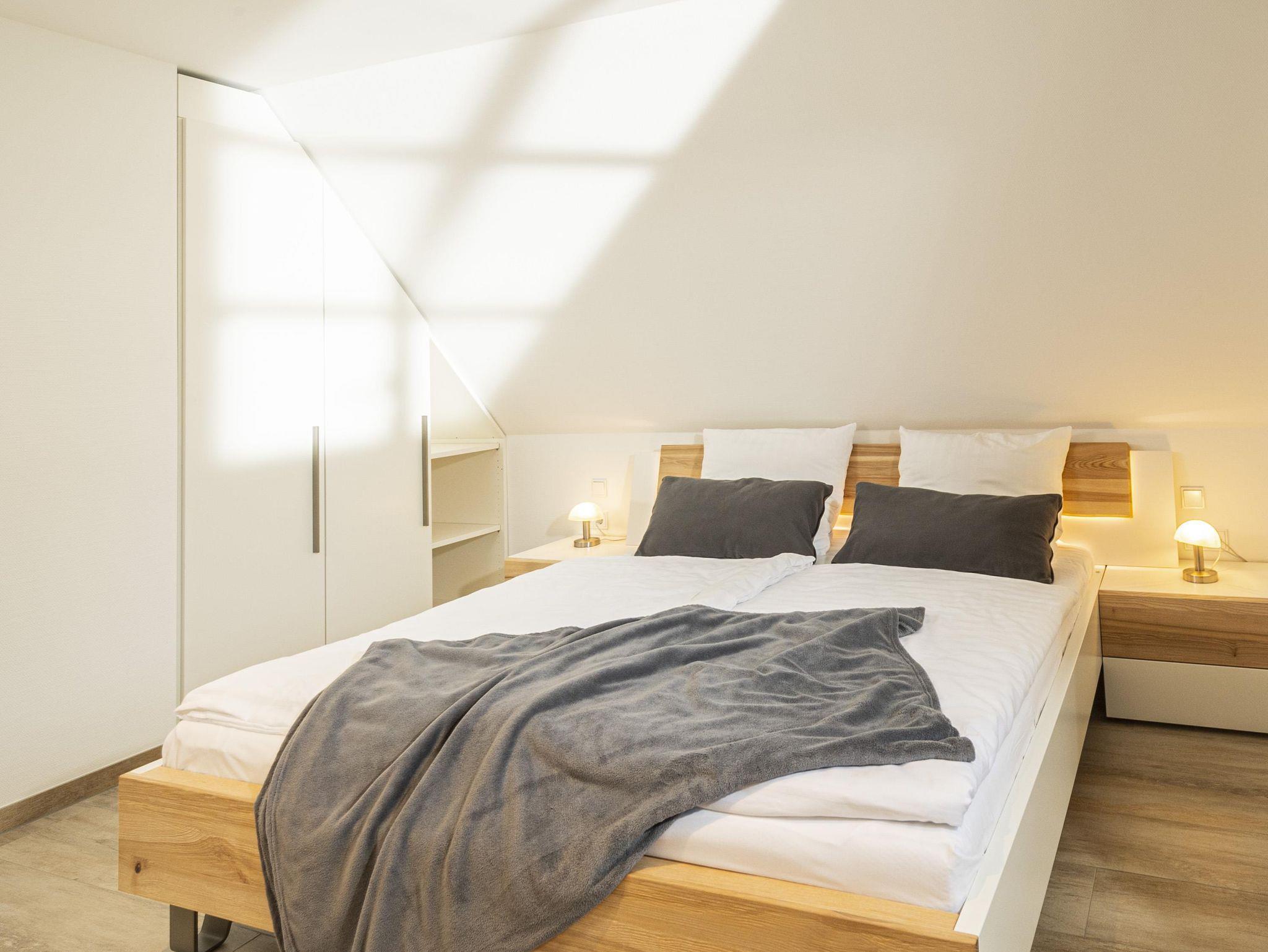 Im Dachgeschoss des KOELLER Hus befindet sich ein weiteres Doppelbett romantisch unter dem Giebel gelegen. Außerdem findet sich hier unter dem Dach ein weiterer kleiner Aufenthaltsbereich zum Sitzen, Spielen und Entspannen, sodass wirklich jeder in diesem Haus einen ganz eigenen Wohlfühlort finden kann und man auch mit acht Personen genug Freiraum findet.