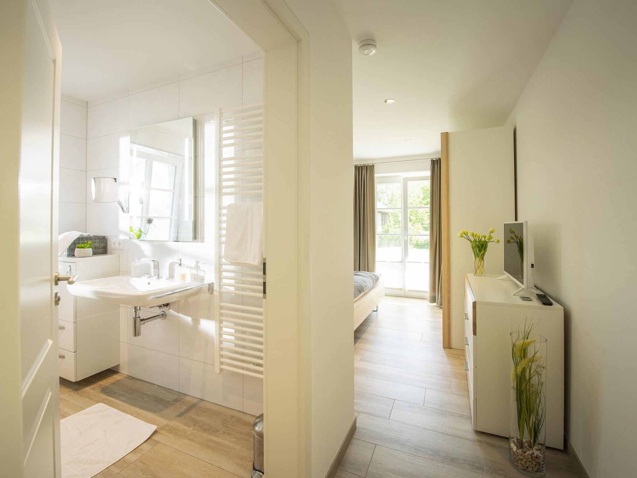 Außerdem befindet sich im Erdgeschoss ein geräumiges Schlafzimmer mit Doppelbett und TV. Aus diesem Schlafzimmer hat man ebenfalls direkten Zugang zur sonnigen Terasse. Das Schlafzimmer besticht nicht nur durch eine hochwertige Ausstattung, sondern auch durch seine Großzügigkeit und das en suite Badezimmer. Im Badezimmer befindet sich eine ebenerdige Dusche, sowie ein unterfahrbares Waschbecken.
