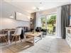 Wohnzimmer mit Sofa (2er), 1 Sessel, TV (Kabel), Radio und Esstisch mit 2 Stühlen. Direkter Zugang zur möblierten Gartenterrasse nach Süden. Komfortable offene Küche mit Backofen, Mikrowelle, Kühlschrank mit Gefrierfach und Geschirrspüler.