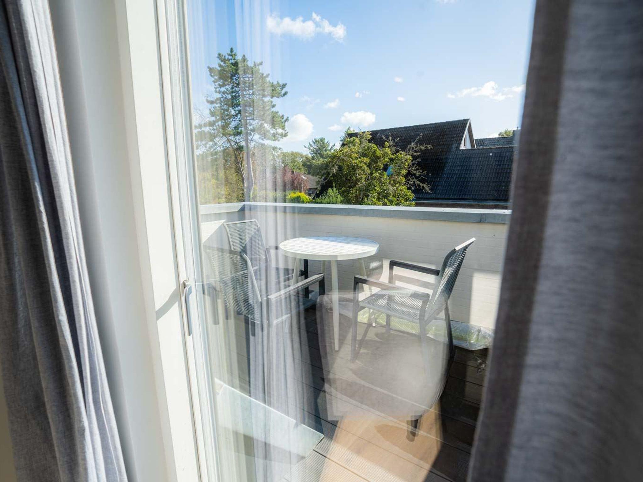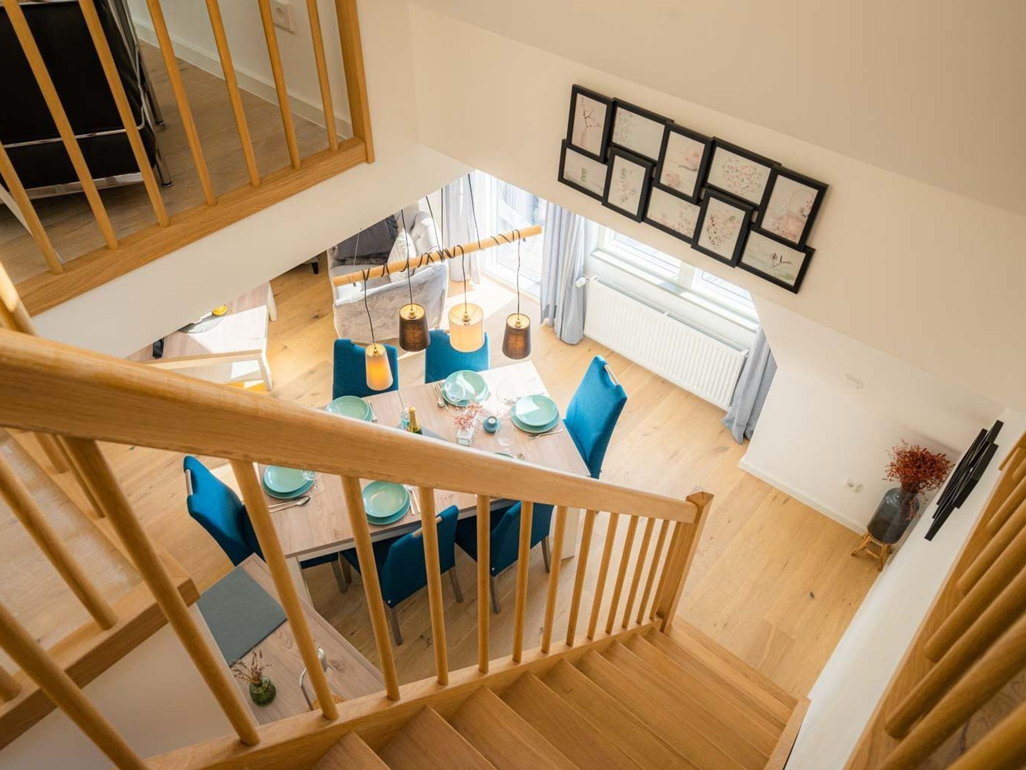 Wohnzimmer mit Sofa für 2 Personen, 2 Sesseln, SMART-TV (waipu), Bluetooth-Soundanlage und Esstisch mit 6 Stühlen. Direkter Zugang zum möblierten Balkon nach Südwesten mit schönem Blick in grüne Gärten. Vom Wohnzimmer führt eine Treppe zum 3. Schlafzimmer.