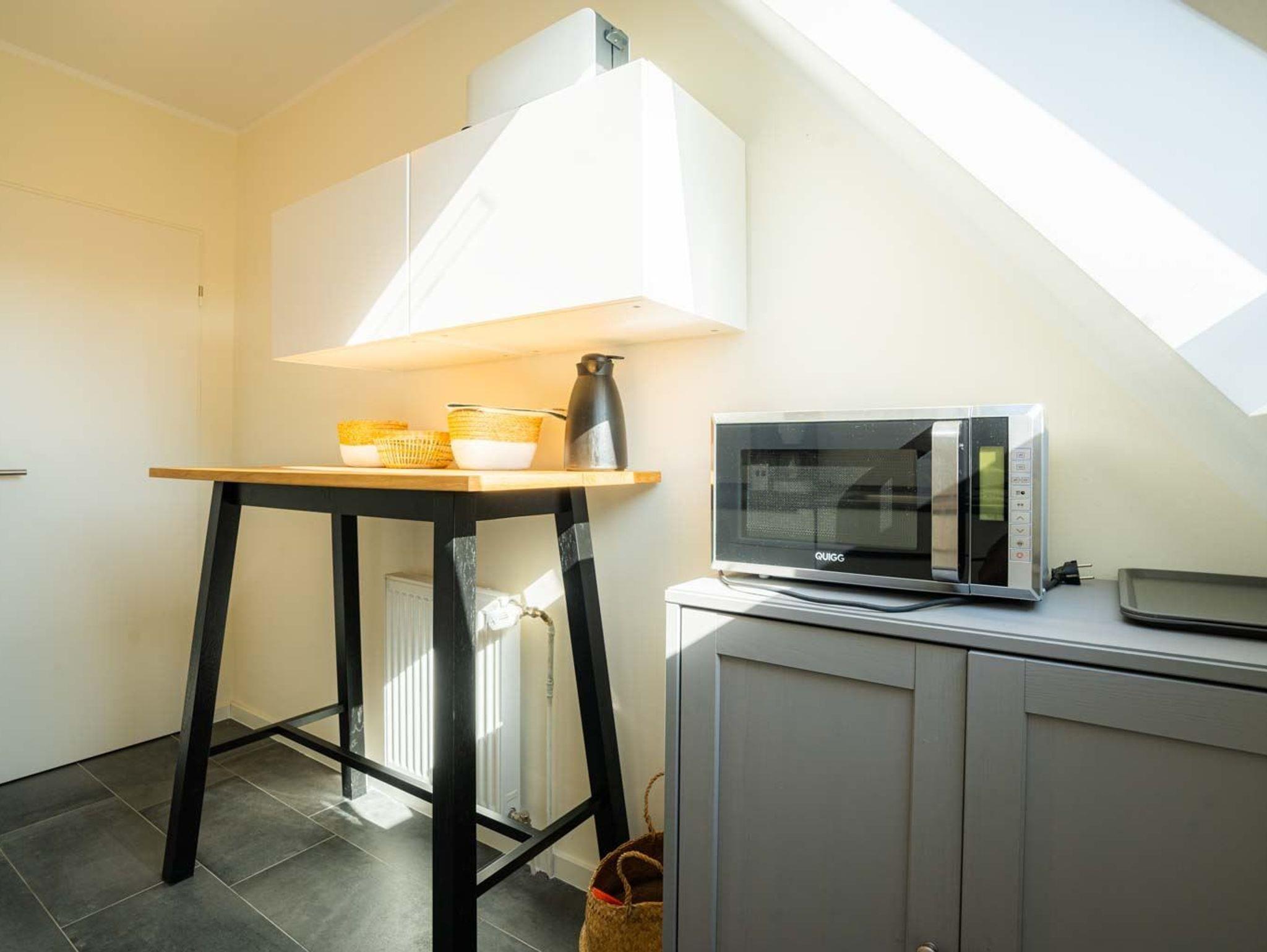 Separate Küche mit Backofen, Mikrowelle, Geschirrspüler und Kühl-Gefrier-Kombination.