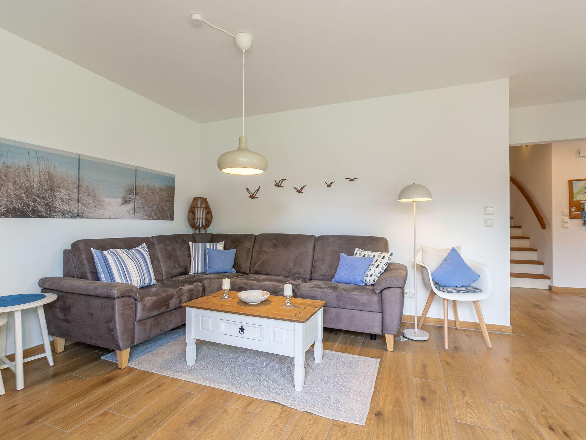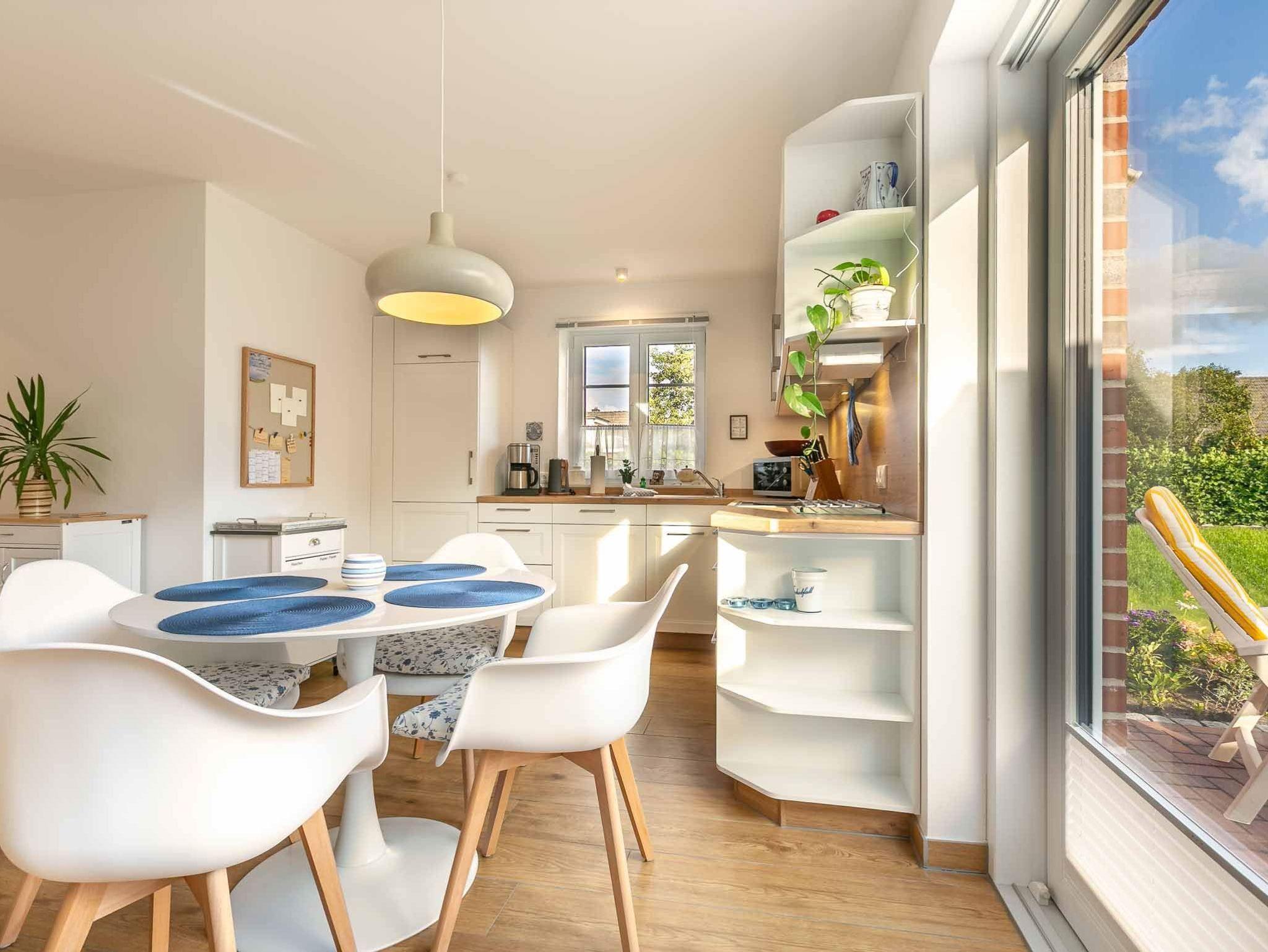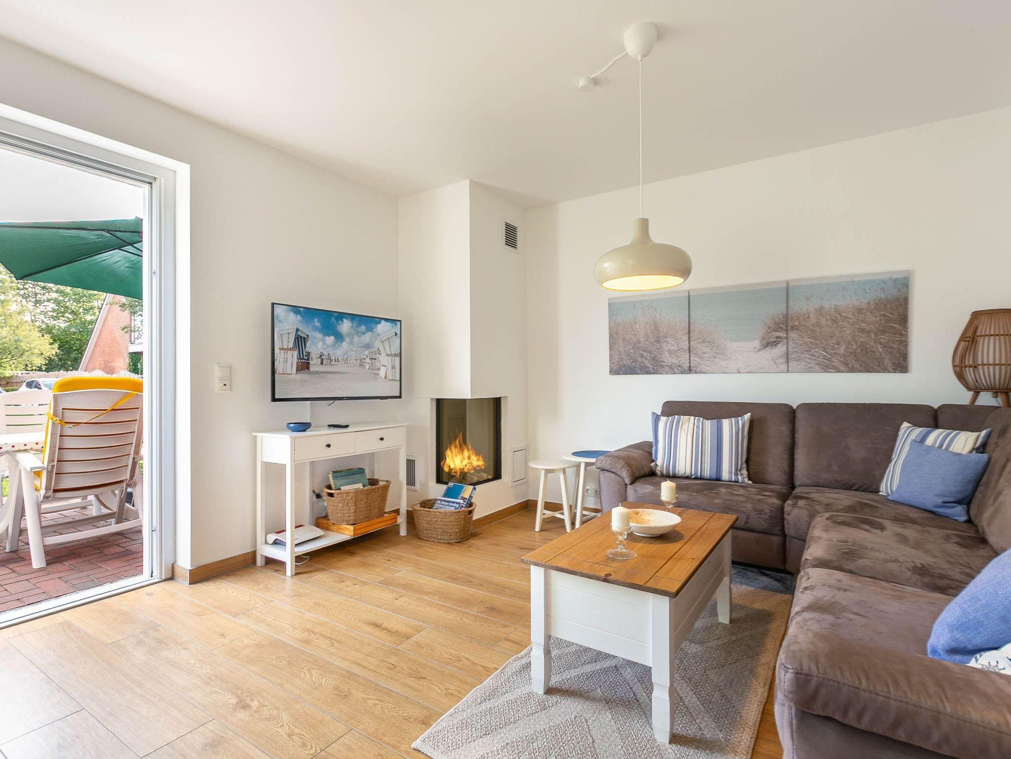 Wohnzimmer mit Ecksofa, Smart-TV, Gas-Kamin und Esstisch für 5 Personen. Offene Küche mit Backofen, Mikrowelle, Geschirrspüler sowie Kühlschrank mit Gefrierfach. Vom Wohnbereich gelangen Sie auf die sonnige Süd-Terrasse mit Gartenmöbeln und Strandkorb.