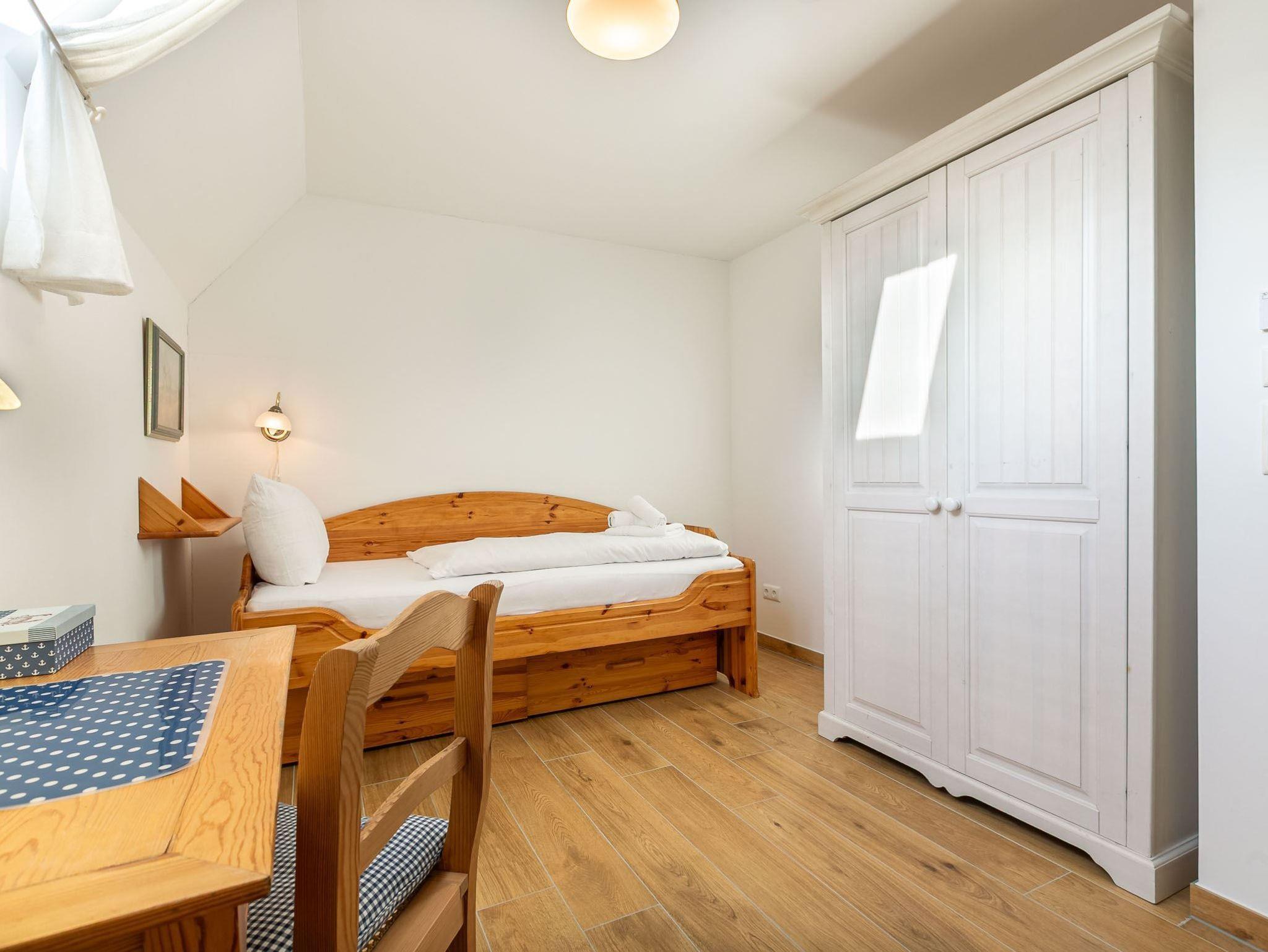 3. Schlafzimmer mit Einzelbett (90x200 cm), Sessel, kleinem Schreibtisch und Kleiderschrank.