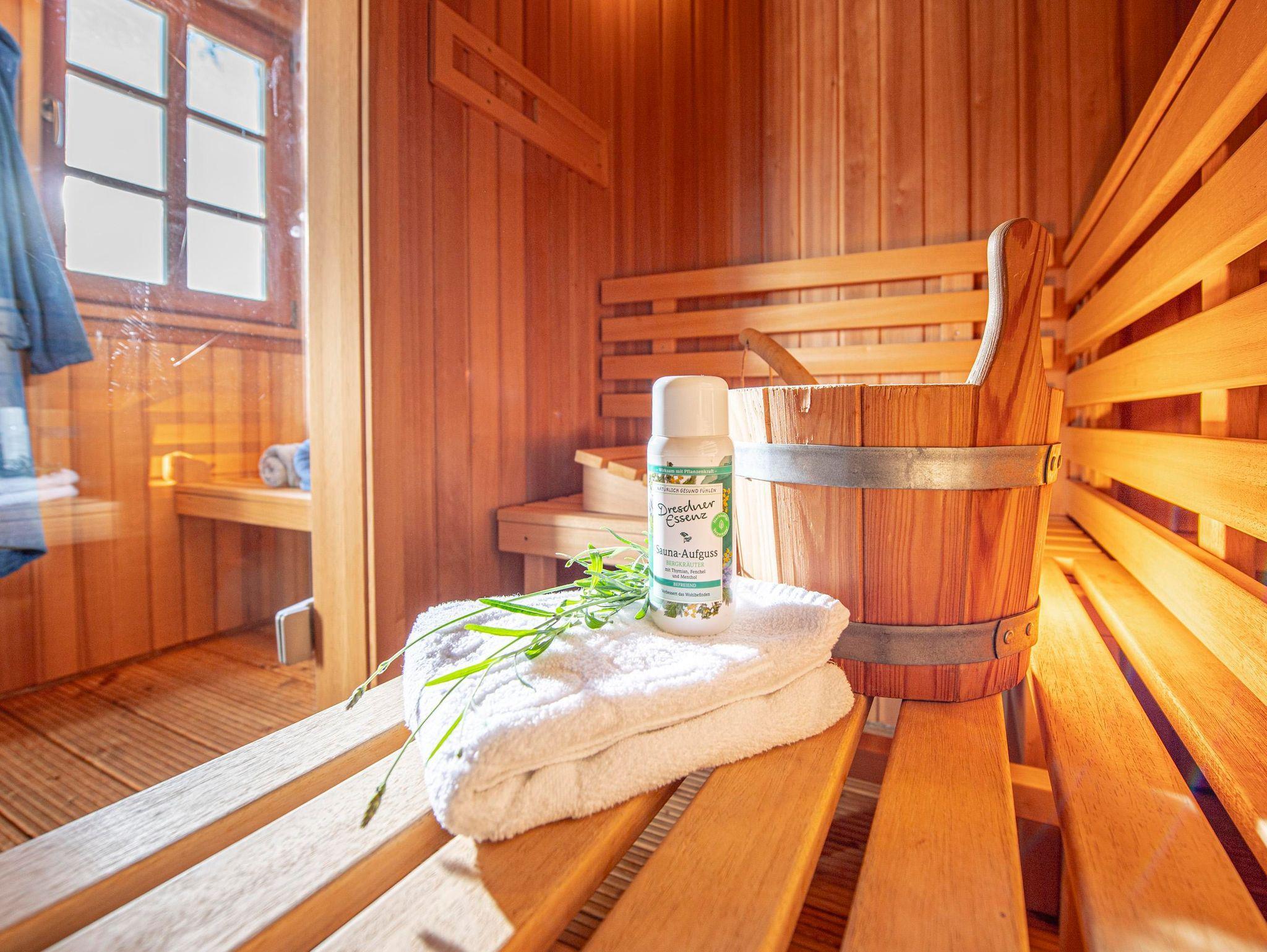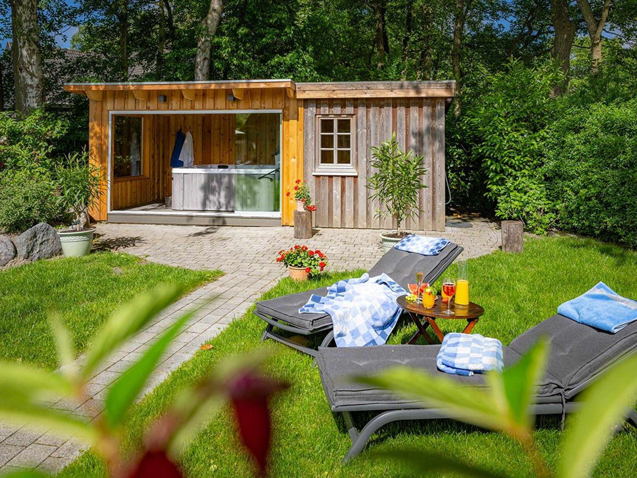 Die umläufige Terrasse (Süd- bzw. Westausrichtung) ist mit Terrassenmöbeln und einem Strandkorb ausgestattet ist. Im Garten erwartet Sie das besondere Highlight. Hier finden Sie geschützt, einen abgetrennten Bereich mit Blockhaus-Sauna, Außendusche und Terrasse mit Liegestühlen. Es gibt eine Unterstellmöglichkeit für Fahrräder.