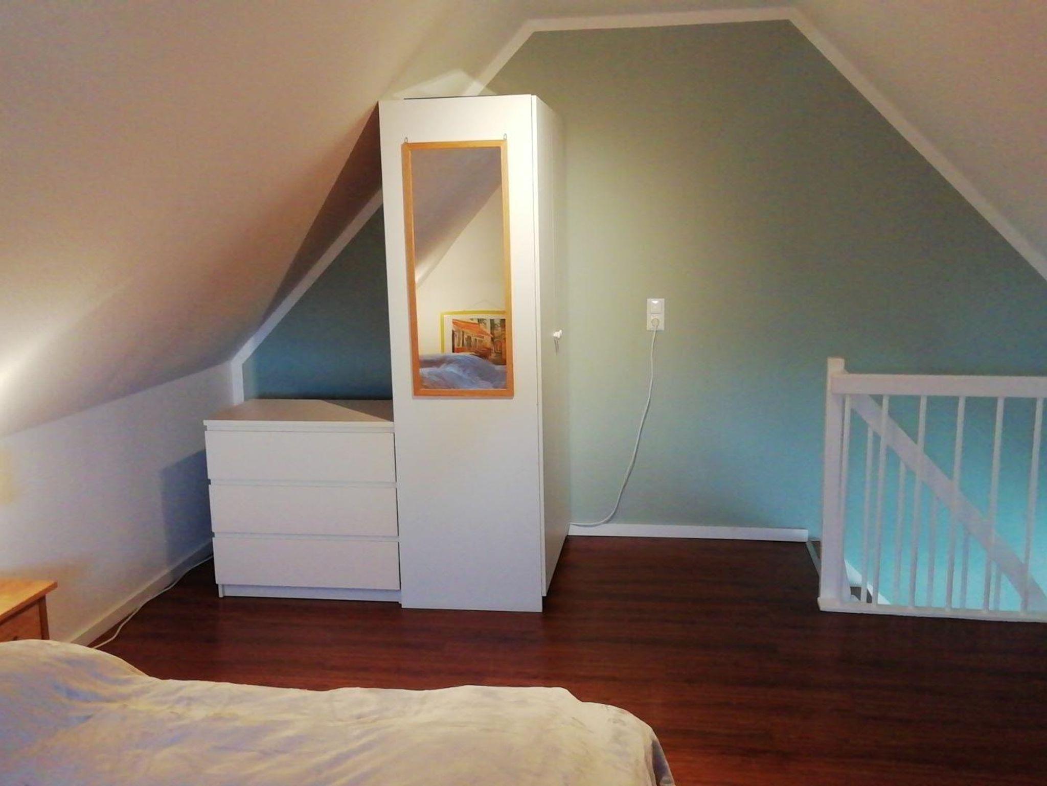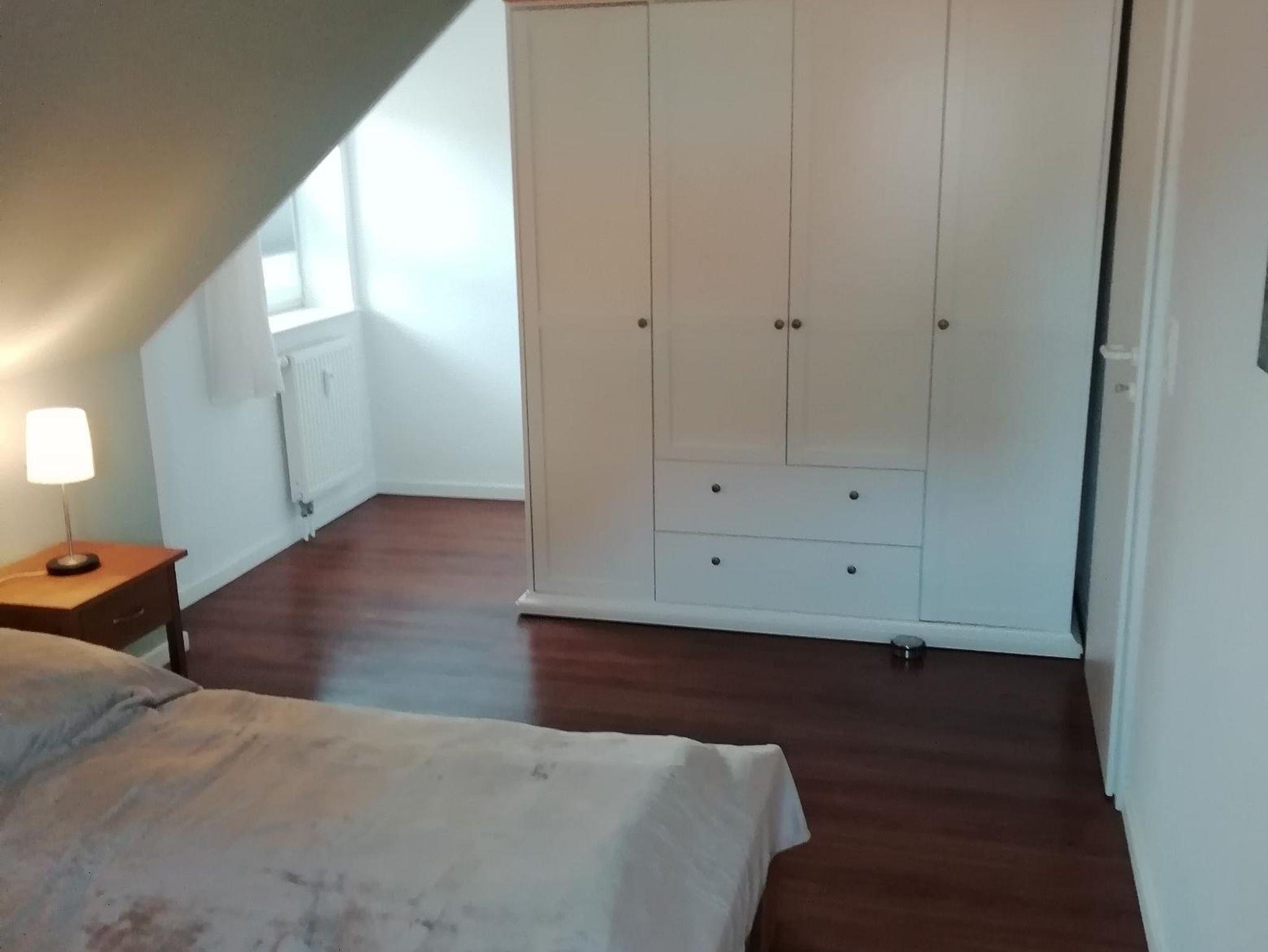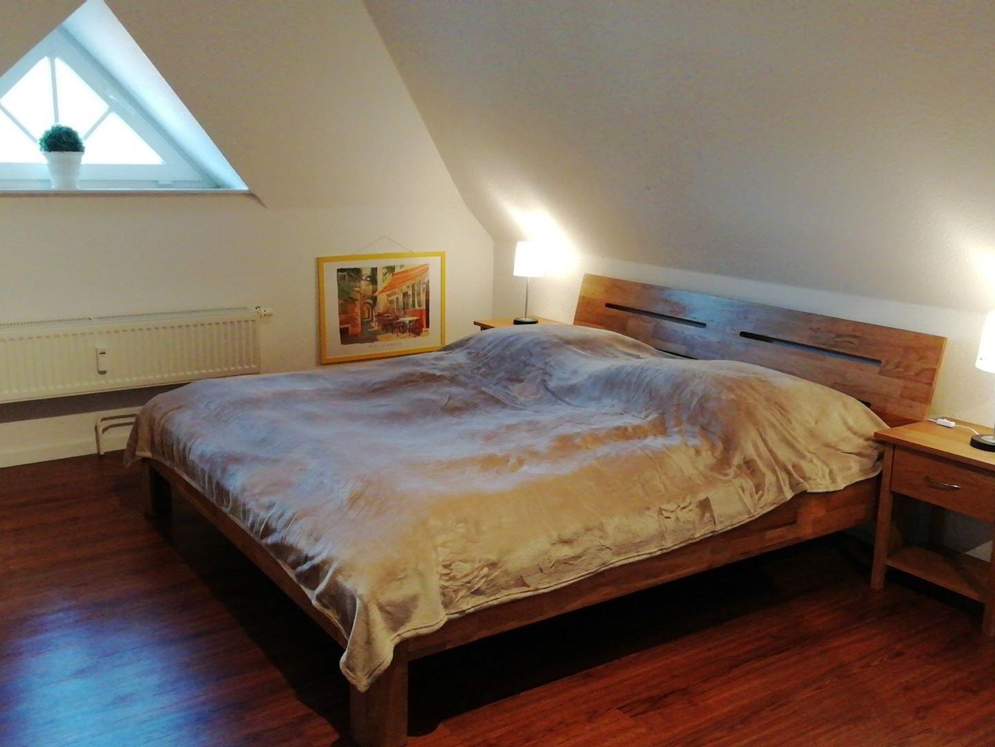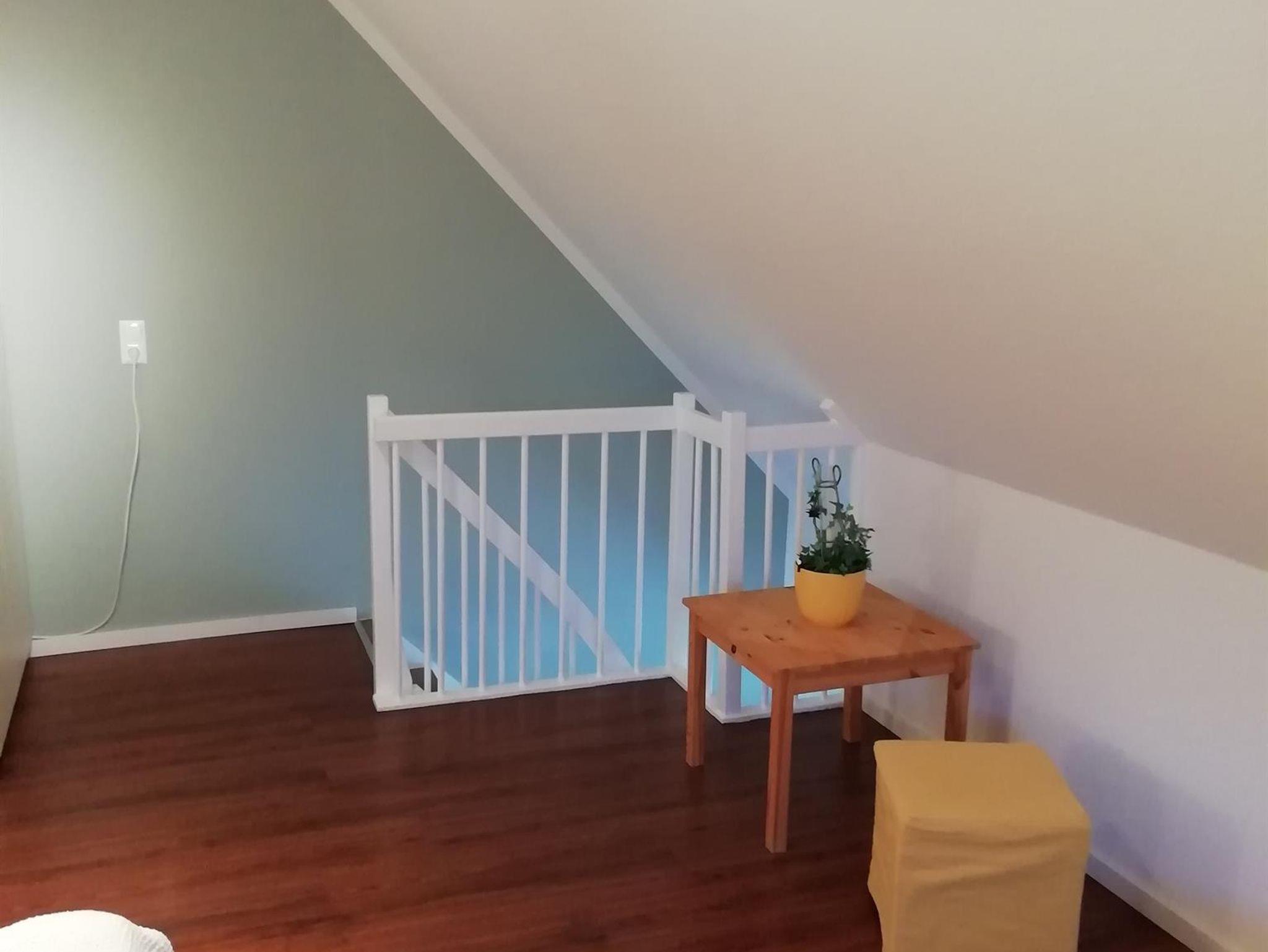 Die Ferienwohnung ist hell, freundlich und liebevoll eingerichtet. Sie ist ausgestattet mit einer Einbauküche mit Backofen, Mikrowelle, Geschirrspüler, Toaster, Wasserkocher und Kaffeemaschine, einer kleinen Essecke und einem gemütlichen Wohnbereich mit Radio und Kabel-TV und einem Zugang zum Balkon. Es steht auch eine Internetnutzung per WLAN zur Verfügung. Die Wohnung verfügt über ein Schlafzimmer mit Doppelbett und einem großen Schlafzimmer ebenfalls mit Doppelbett im Spitzboden. Für Kleinkinder stehen ein Reisebett und ein Kinderhochstuhl zur Verfügung. Im hellem Badezimmer ist eine Dusche vorhanden. Einen Fön stellen wir Ihnen ebenfalls zur Verfügung. Zur Ferienwohnung gehört auch ein gemeinschaftlicher Fahrradkeller und eine gemeinsame Waschmaschine. Die Wohnung und die Umgebung ist kinderfreundlich. Es handelt sich um eine Nichtraucherwohnung. Haustiere sind nicht erlaubt.