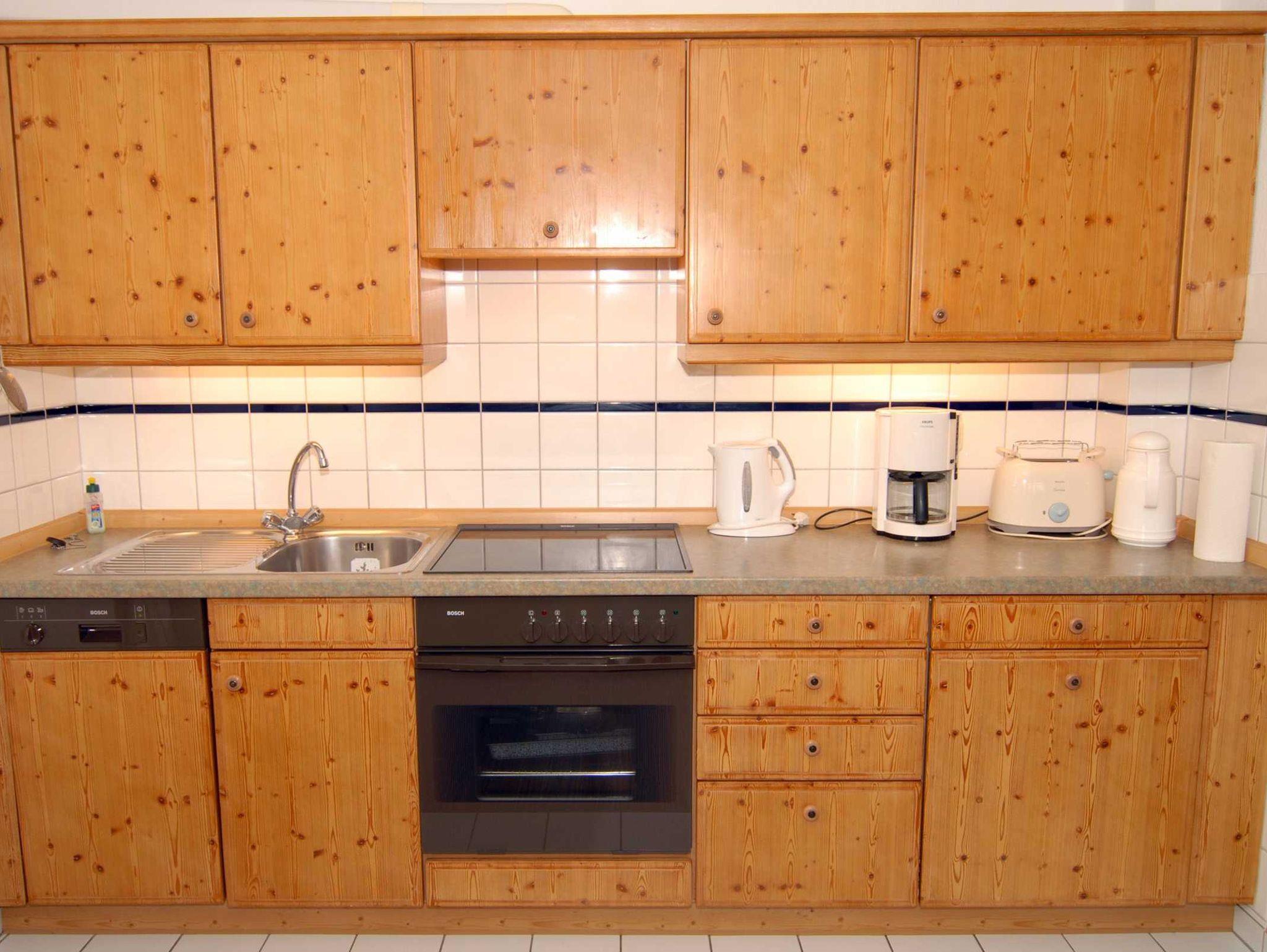 Helle Küchenzeile: Kochen Sie in der charmanten Kiefernholz-Küche mit Cerankochfeld und Backofen ? perfekt für gesellige Abende!
