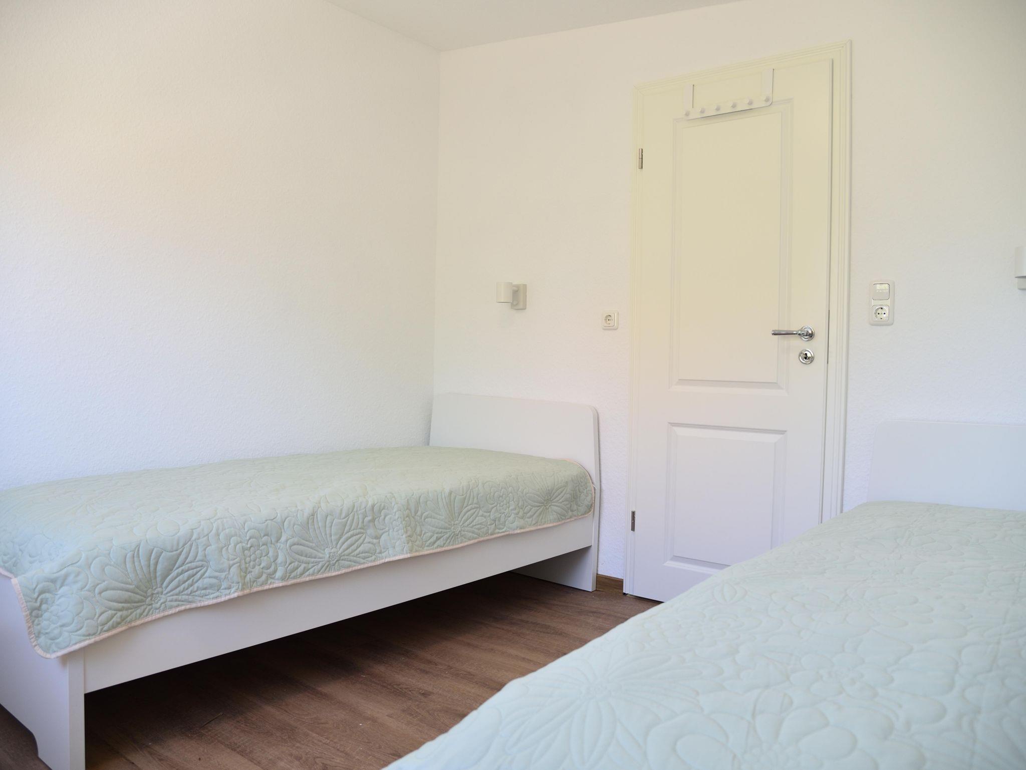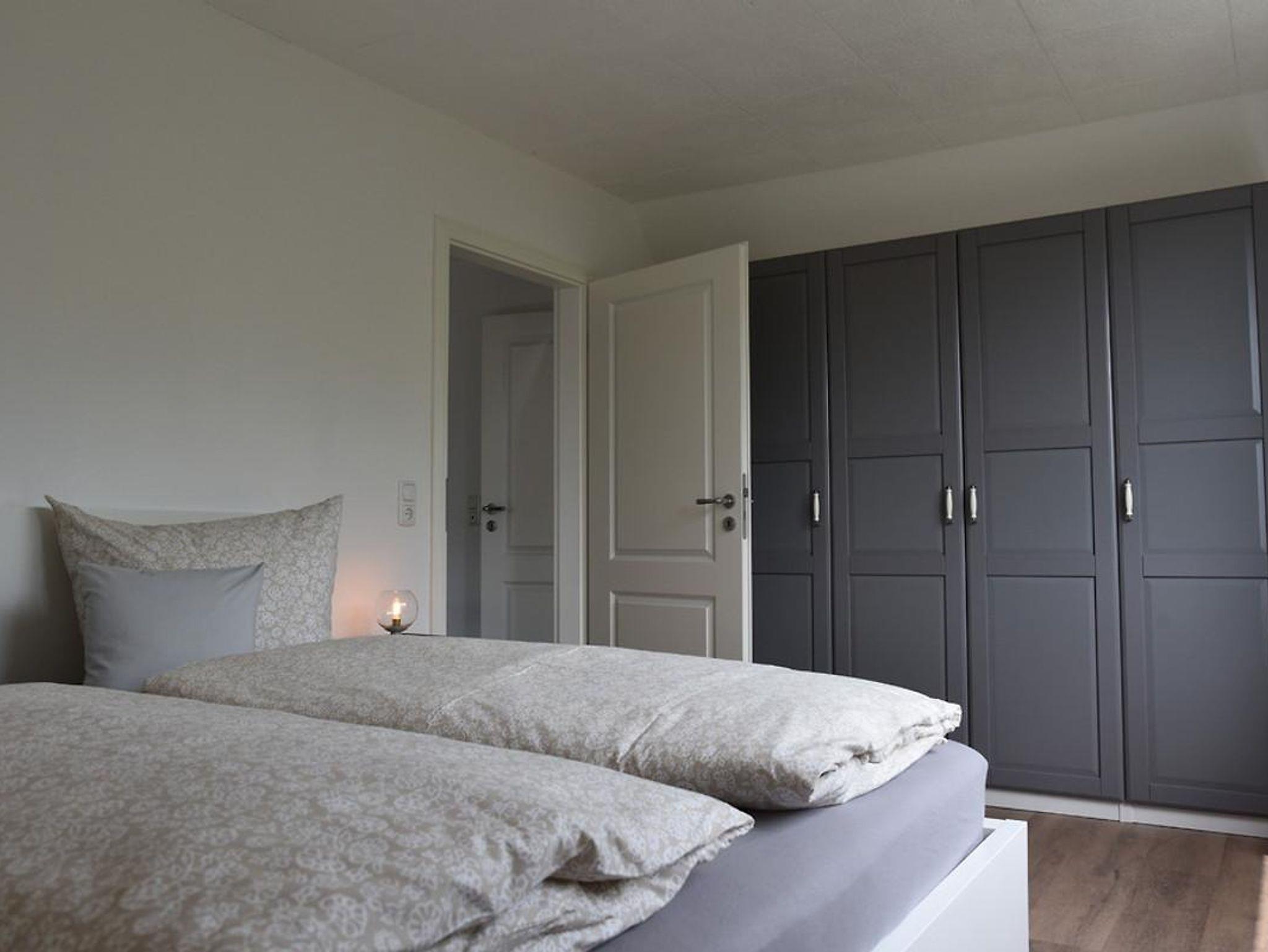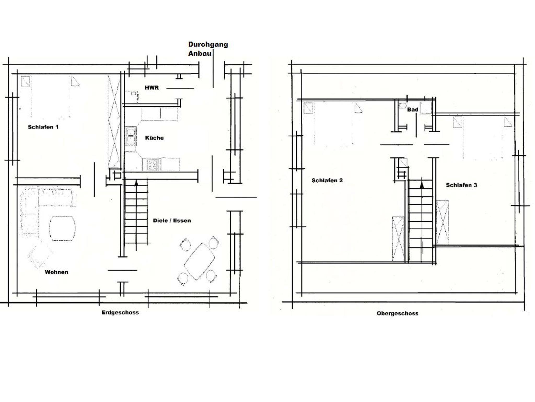 Den Anbau betreten Sie entweder über den Durchgang vom Essplatz in der Küche aus oder über den separaten Außeneingang. Im Anbau finden Sie einen weiteren Wohnbereich (mit riesigem Fernseher und großer Eckcouch) sowie vom Flur abgehend einen zusätzlichen Schlafraum und ein eigenes großzügiges Duschbad. Alle vier Schlafräume bieten entweder ein Doppelbett (EG und einer im OG Haus) oder je zwei Einzelbetten und Schränke.