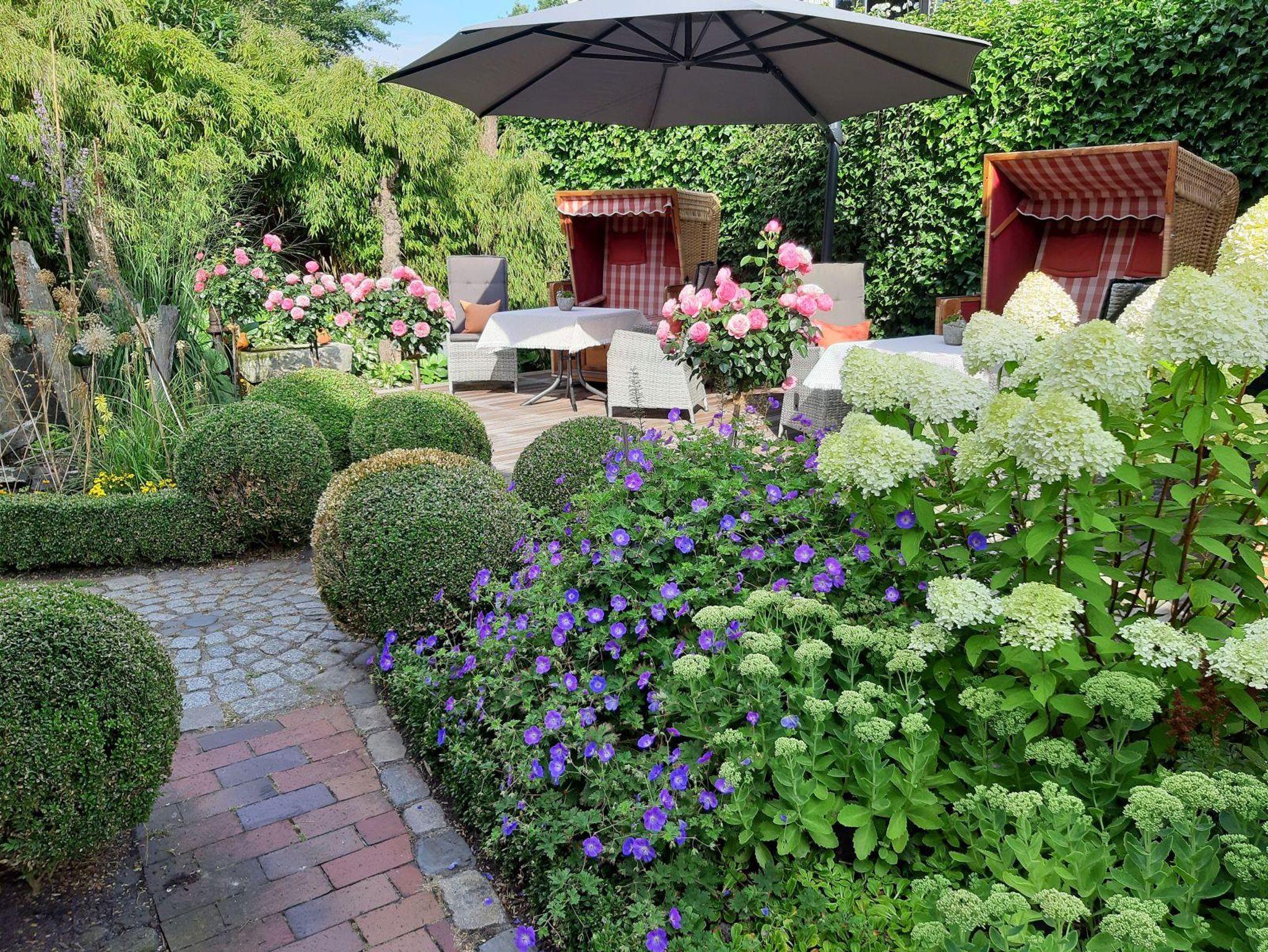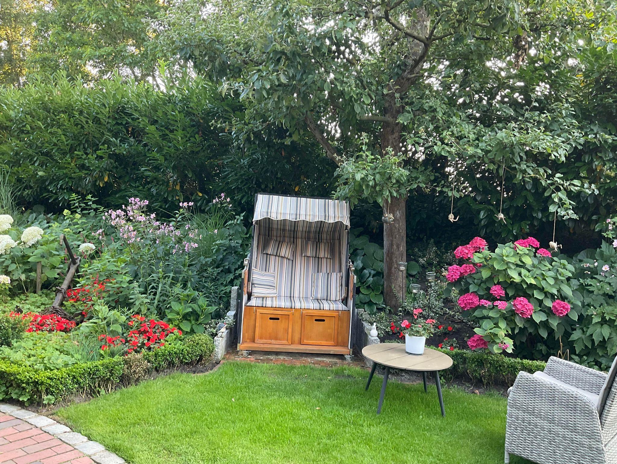 Der bezaubernde, gepflegte Bauerngarten mit Sonnenterasse und Strandkörben lädt zum Verweilen ein