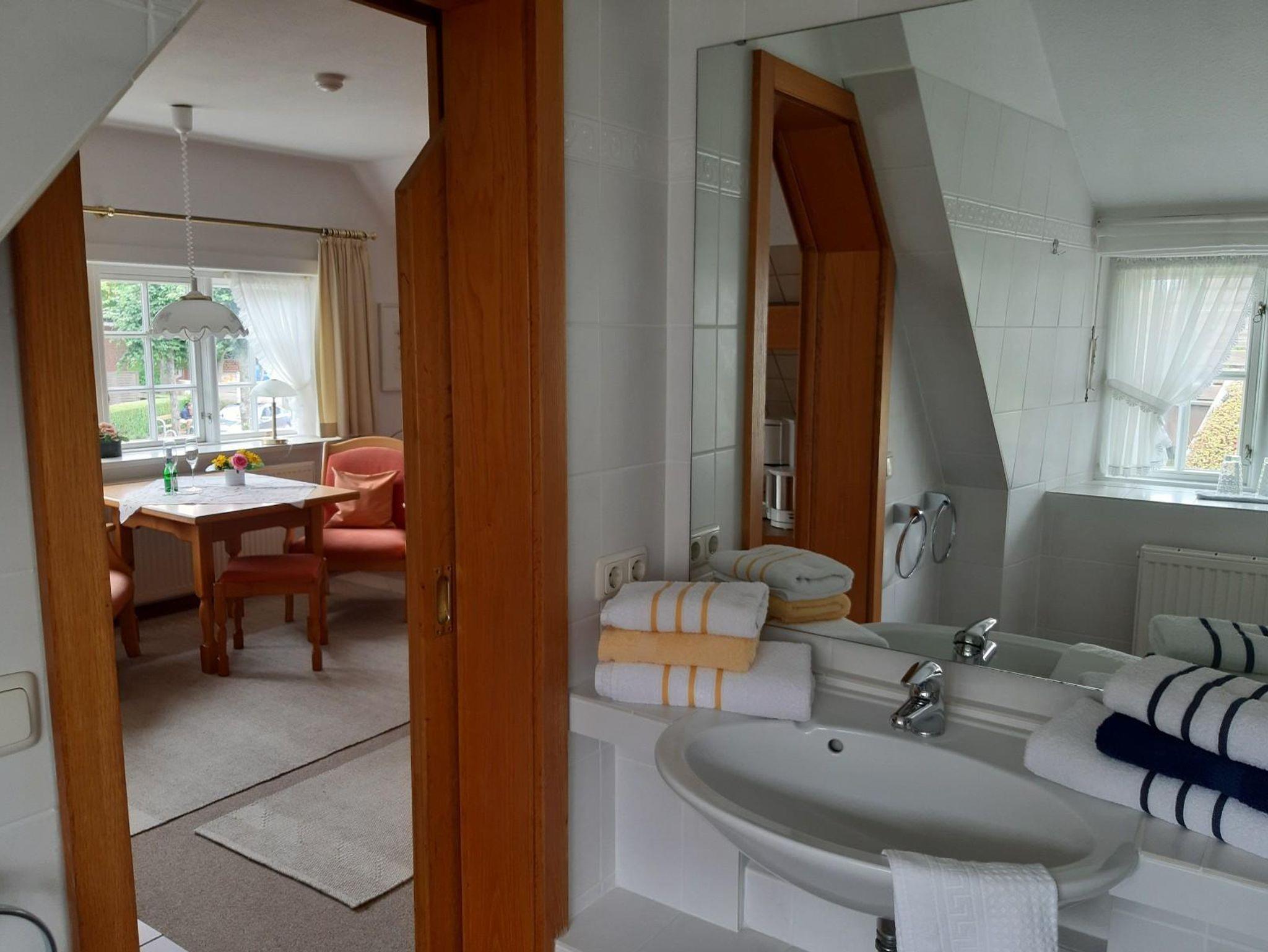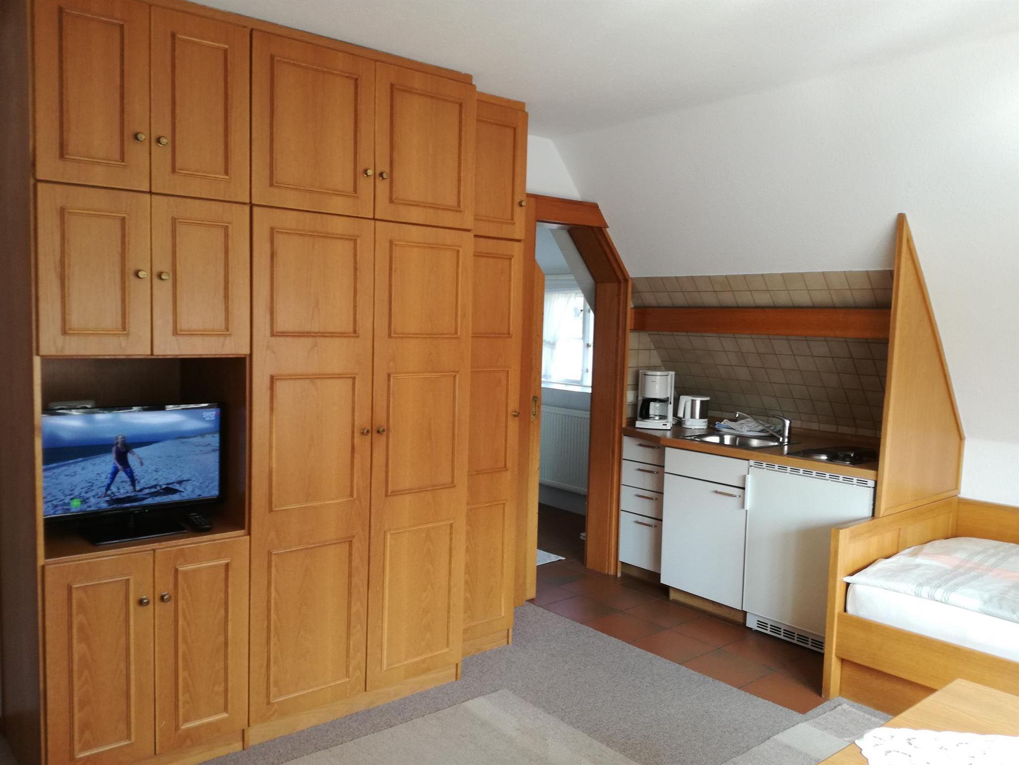 befindet sich in der 1. Etage zur Westseite, mit Blick auf den historischen Deich und den Garten. Es verfügt über eine Sitzgruppe, einen großen Flachbild-TV, 2 Einzelbetten mit LED-Leselampen, eine Küchenzeile sowie ein Duschbad / WC.