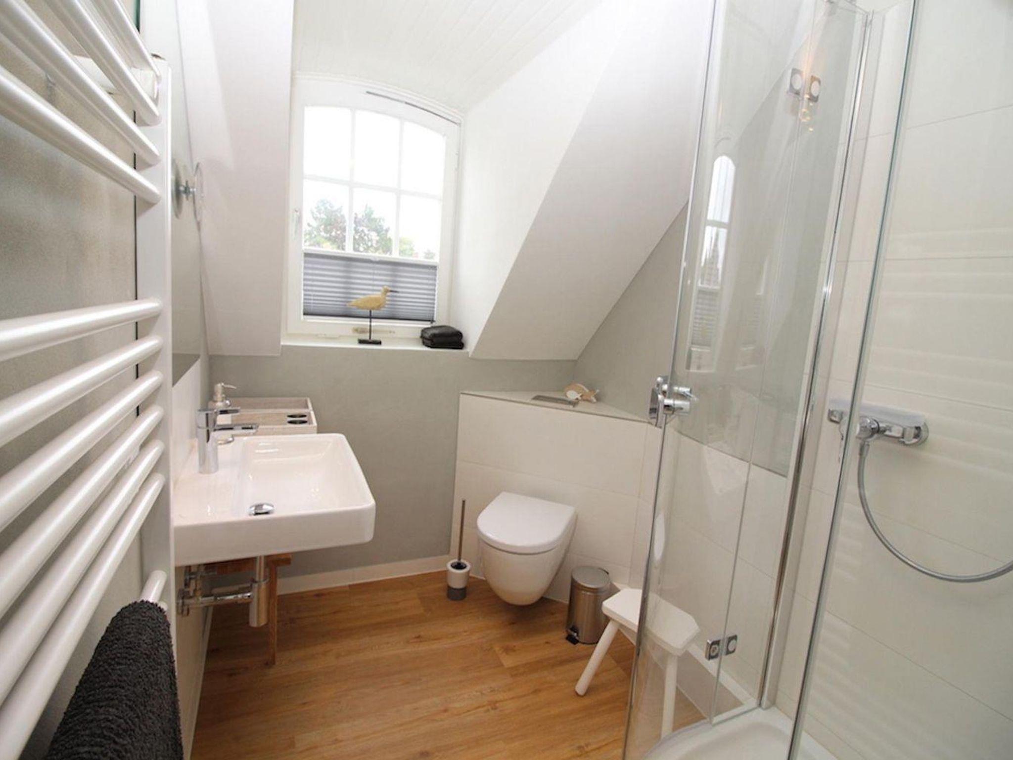Vom Flur aus gelangen Sie in das helle Duschbad.