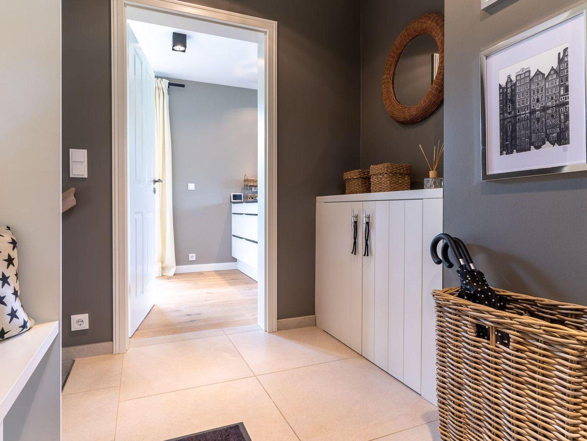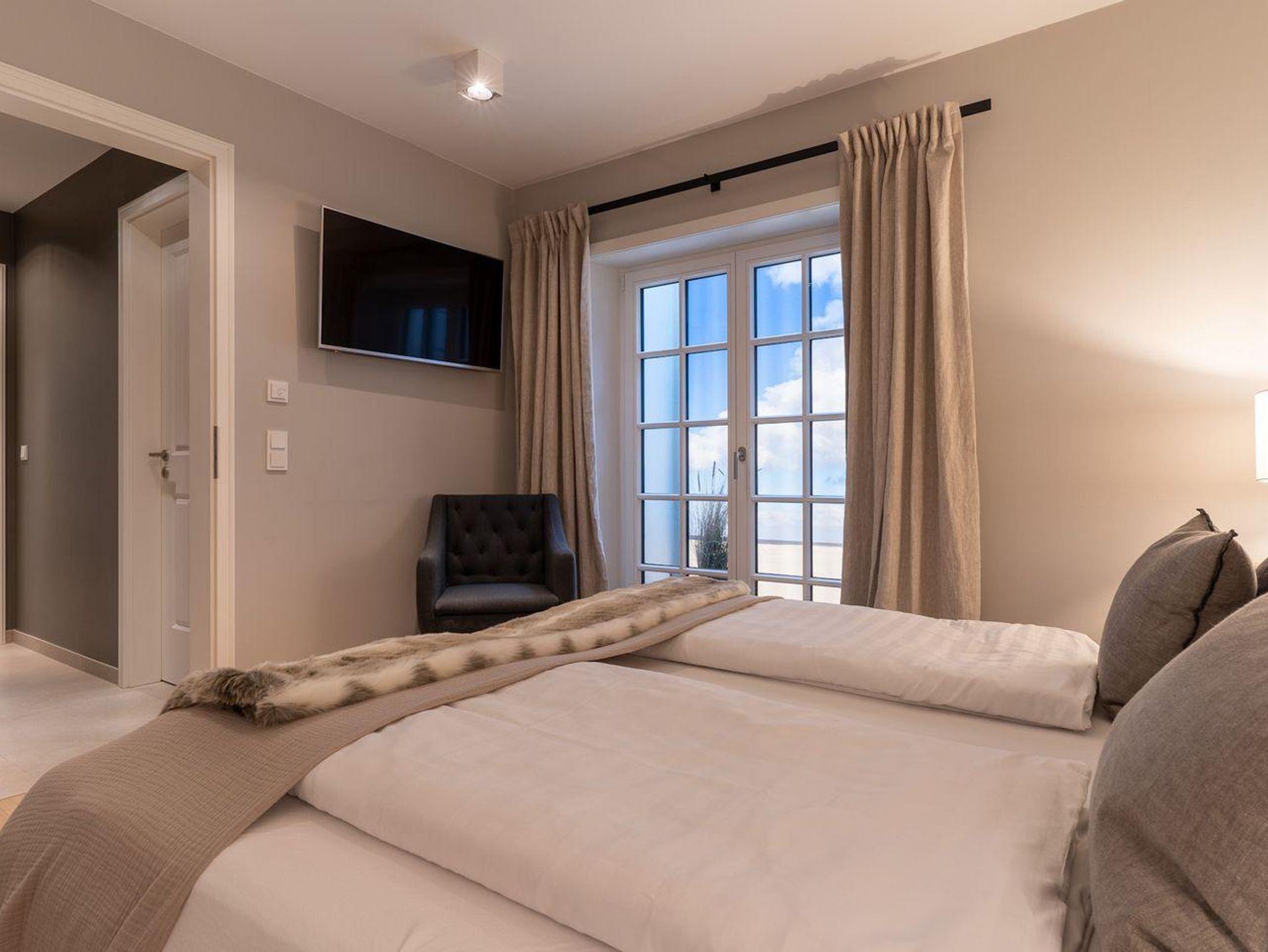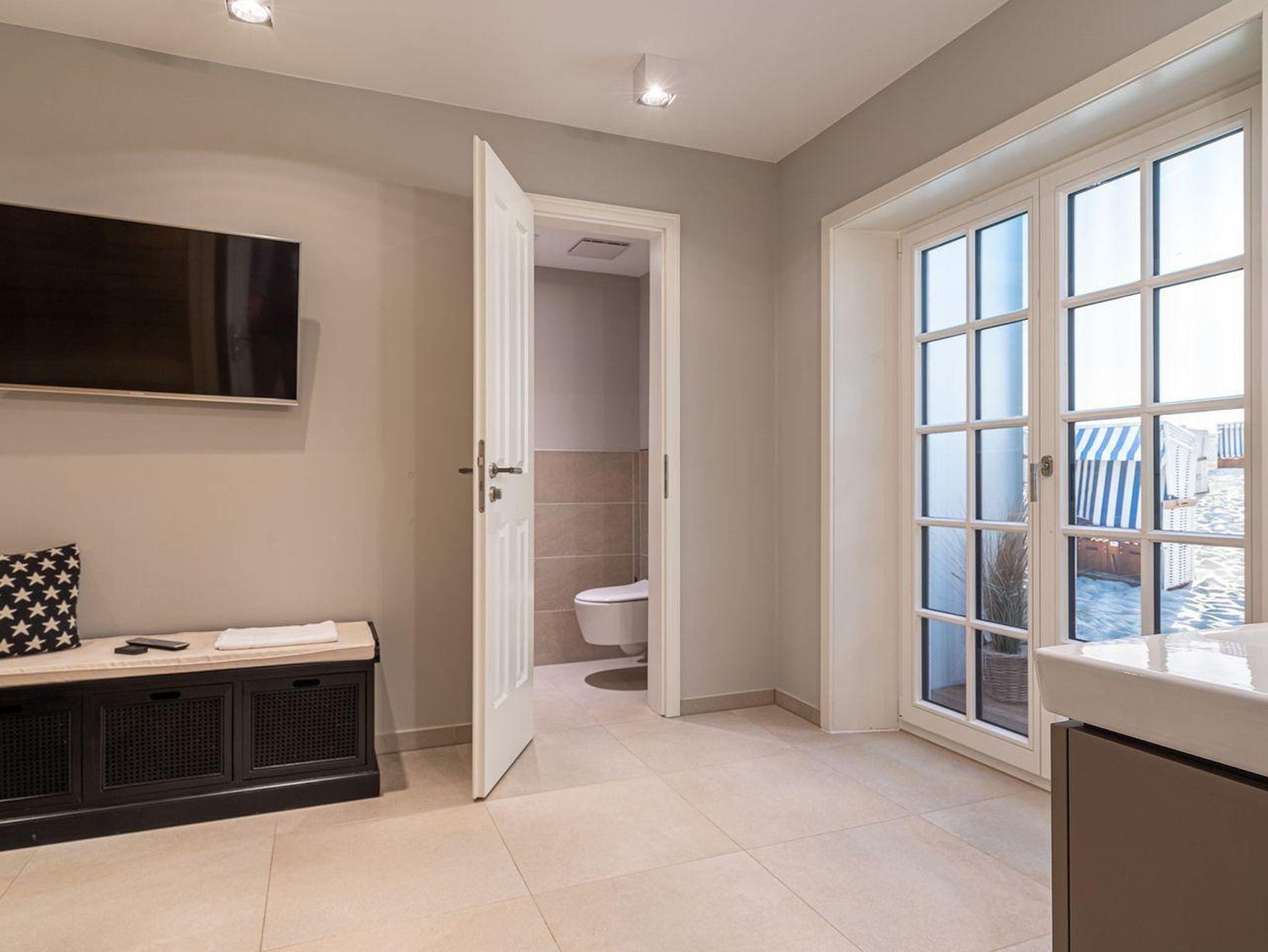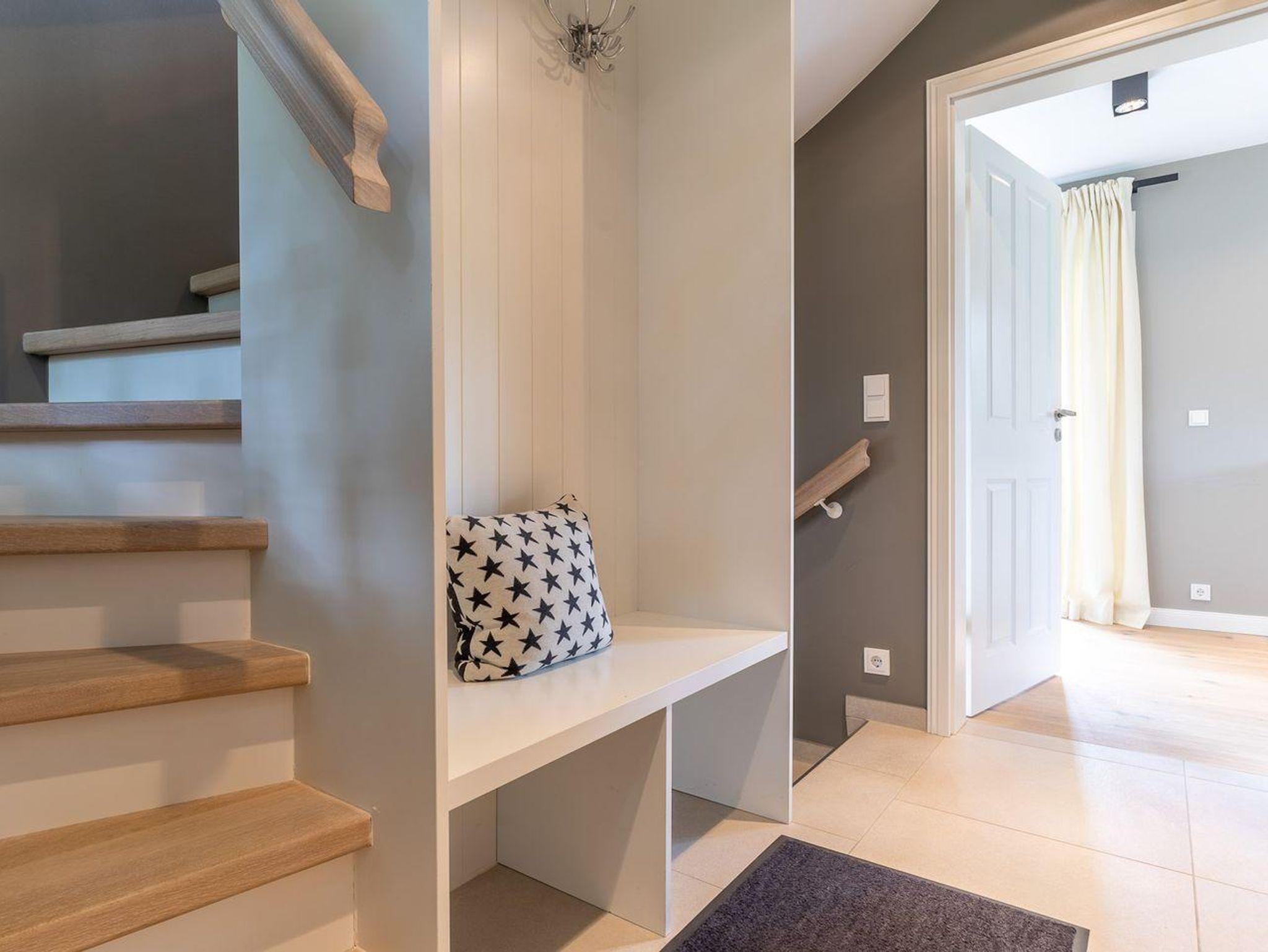 Im Erdgeschoss erwartet Sie ein lichtdurchflutetes Wohnzimmer mit Gaskamin und TV, eine offene Küche sowie ein integriertes gemütlichen Esszimmer. In diesem Bereich - wie auch in den Schlafzimmern - ist das Haus mit Eichenparkett ausgestattet. Die Küche verfügt über hochwertige Elektrogeräte und genügend Platz zum gemeinsamen Kochen. An den Wohnbereich schließt sich ein Flur sowie ein Gäste-WC an. Über eine Holztreppe gelangt man in das Obergeschoss. Die zwei Schlafzimmer, jeweils mit einem Doppelbett ausgestattet, sind bis unter das Dach geöffnet. Dies gibt den Räumen viel Luft und abends durch die indirekte Beleuchtung eine besondere Gemütlichkeit. Die Schlafzimmer sind ebenfalls mit TV ausgestattet. Kleiderschränke und Kommode gewähren Ihnen viel Stauraum. Darüber hinaus befindet sich im Obergeschoss ein geräumiges Badezimmer mit Raindance-Dusche. Das volle Wohlfühlprogramm erwartet Sie im Untergeschoss, das sowohl durch natürliches Tageslicht, als auch durch eine Strandbilder-Beleuchtung illuminiert wird. Sie gelangen direkt in den großzügigen Entspannungsbereich mit Sauna, freistehender Badewanne, großer Raindance-Dusche und TV. Auf dieser Ebene befindet sich das dritte Schlafzimmer, das auch mit einem Doppelbett, Kleiderschrank und TV ausgestattet ist.