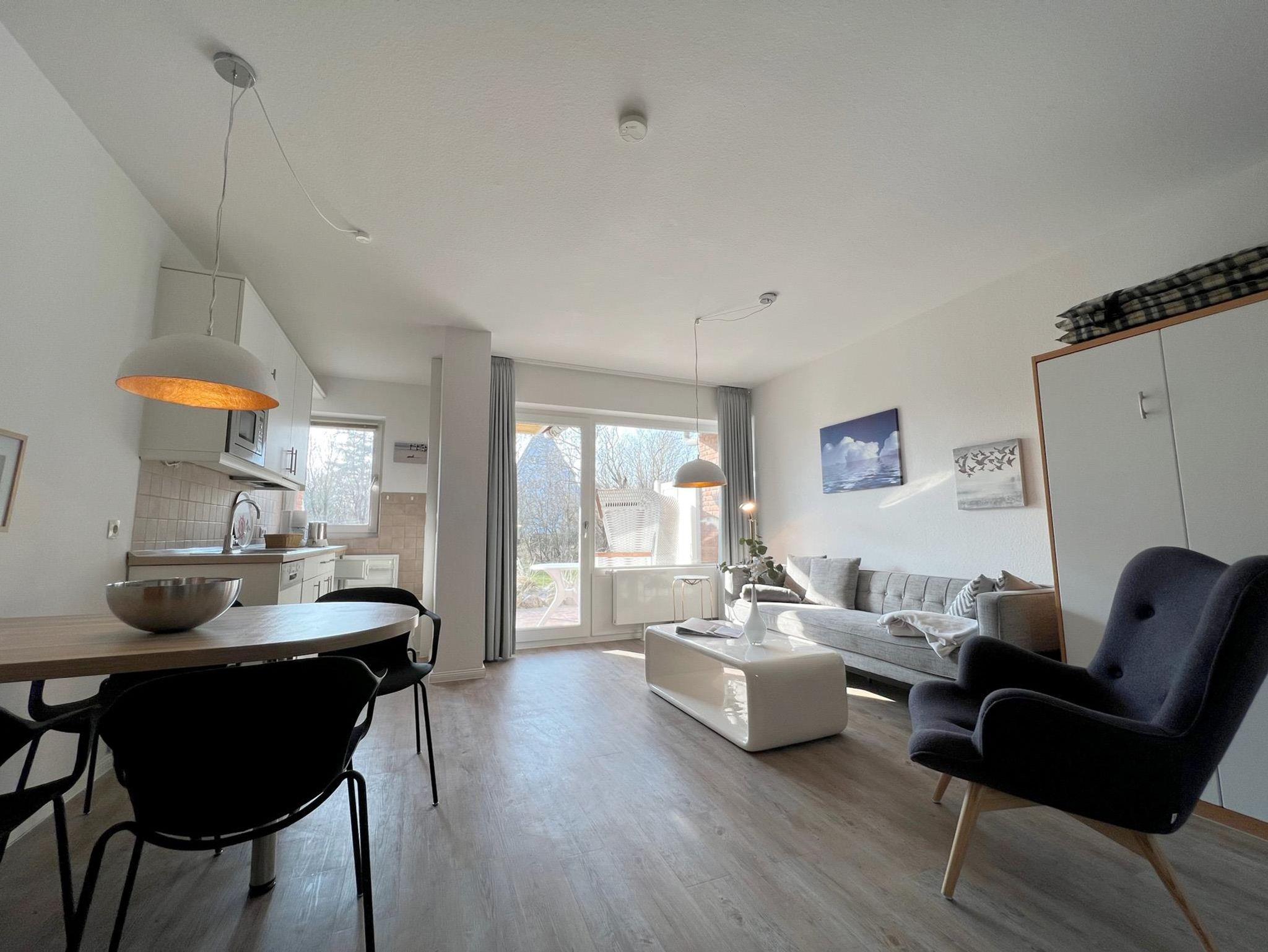 Die Wohnungteilt sich wie folgt auf: Eingangsdiele mit Garderobe, Schlafzimmer mit 2 Einzelbetten, (90x200cm) Duschbad mit WC. Der großzügige Wohnraum mit direktem Zugang zur Terrasse und Garten überzeugt mit seiner gemütlichen Sitzecke und dem direktem Blick nach draußen, der modernen, weißen Küche, der Essecke und als weitere Schlafmöglichkeit 1 Doppelschrankbett. Parkplatz vorhanden.