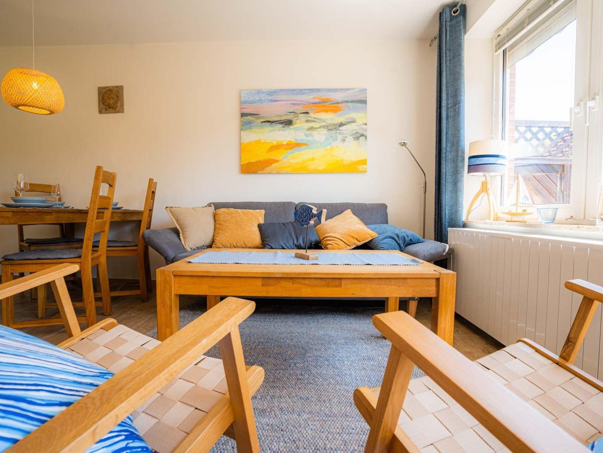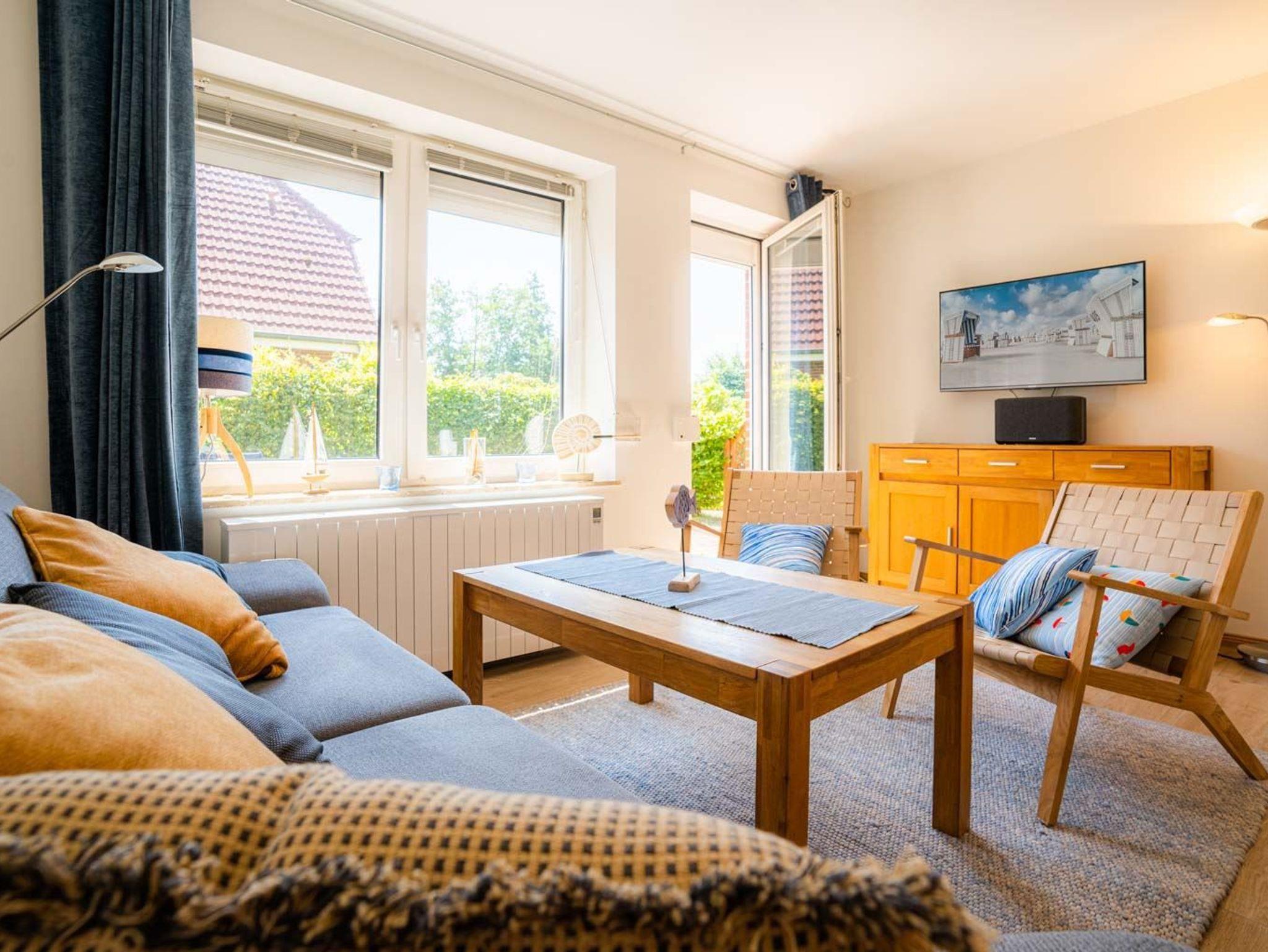 Wohnzimmer mit Sofa (2er), 2 Sesseln, Kommode, TV (Kabel), Hifi-Anlage und Esstisch mit 4 Stühlen. Direkter Zugang zur möblierten Gartenterrasse nach Südwesten. Offene Küche mit Backofen, Mikrowelle, Geschirrspüler und Kühlschrank mit Gefrierfach.