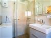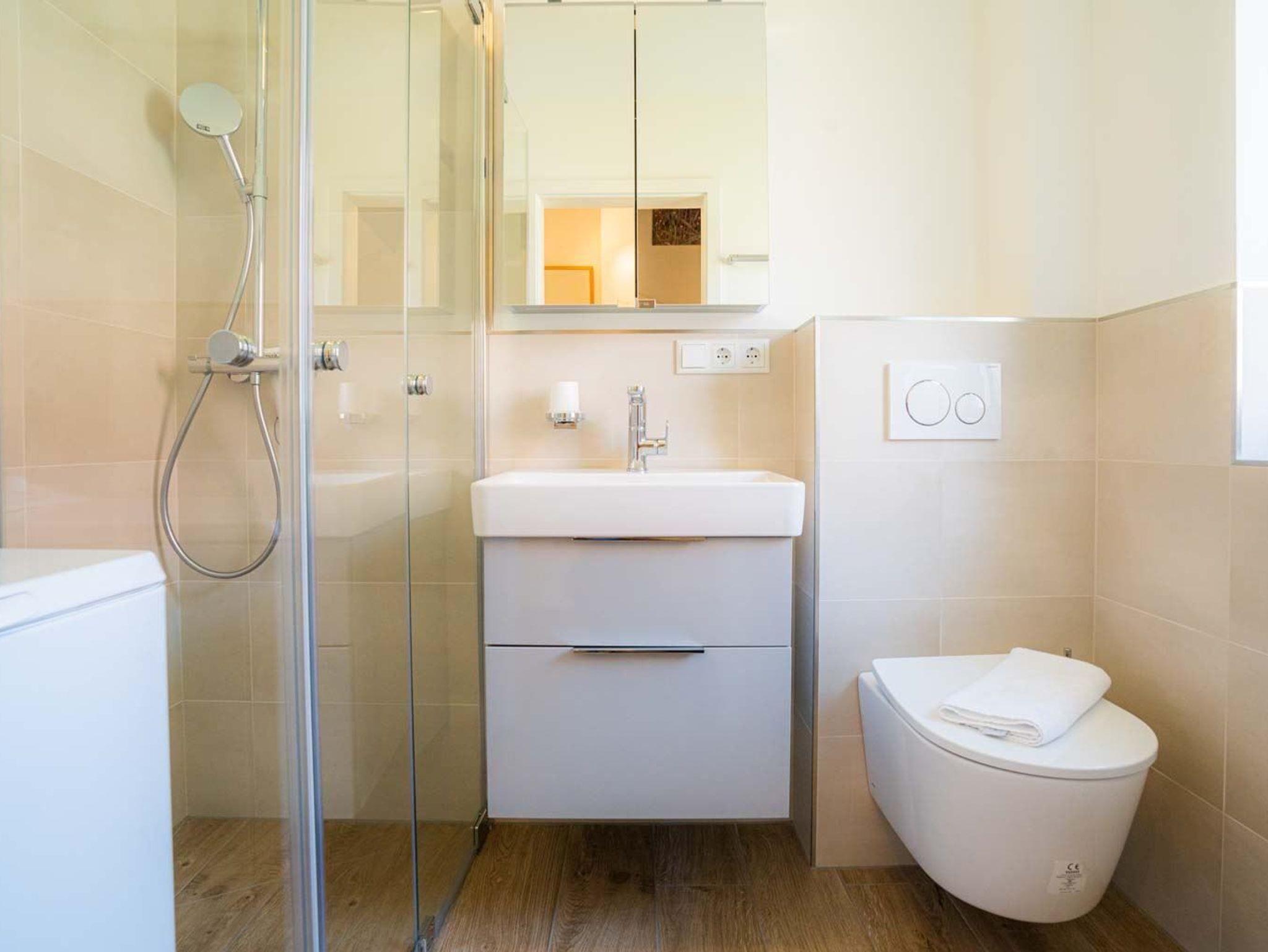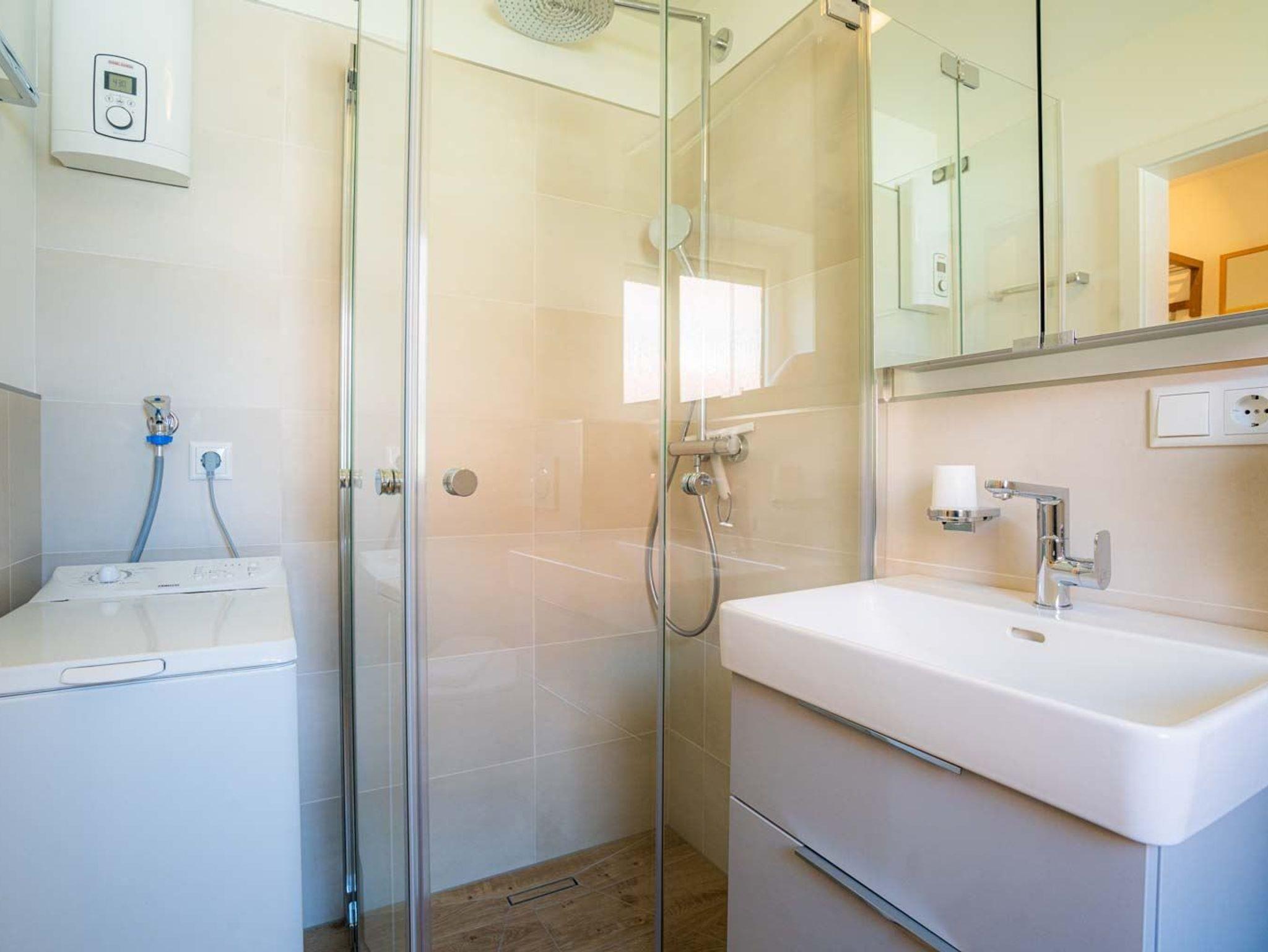 Badezimmer (Duschbad) mit Dusche, WC, Waschmaschine, Tageslicht und Föhn.
