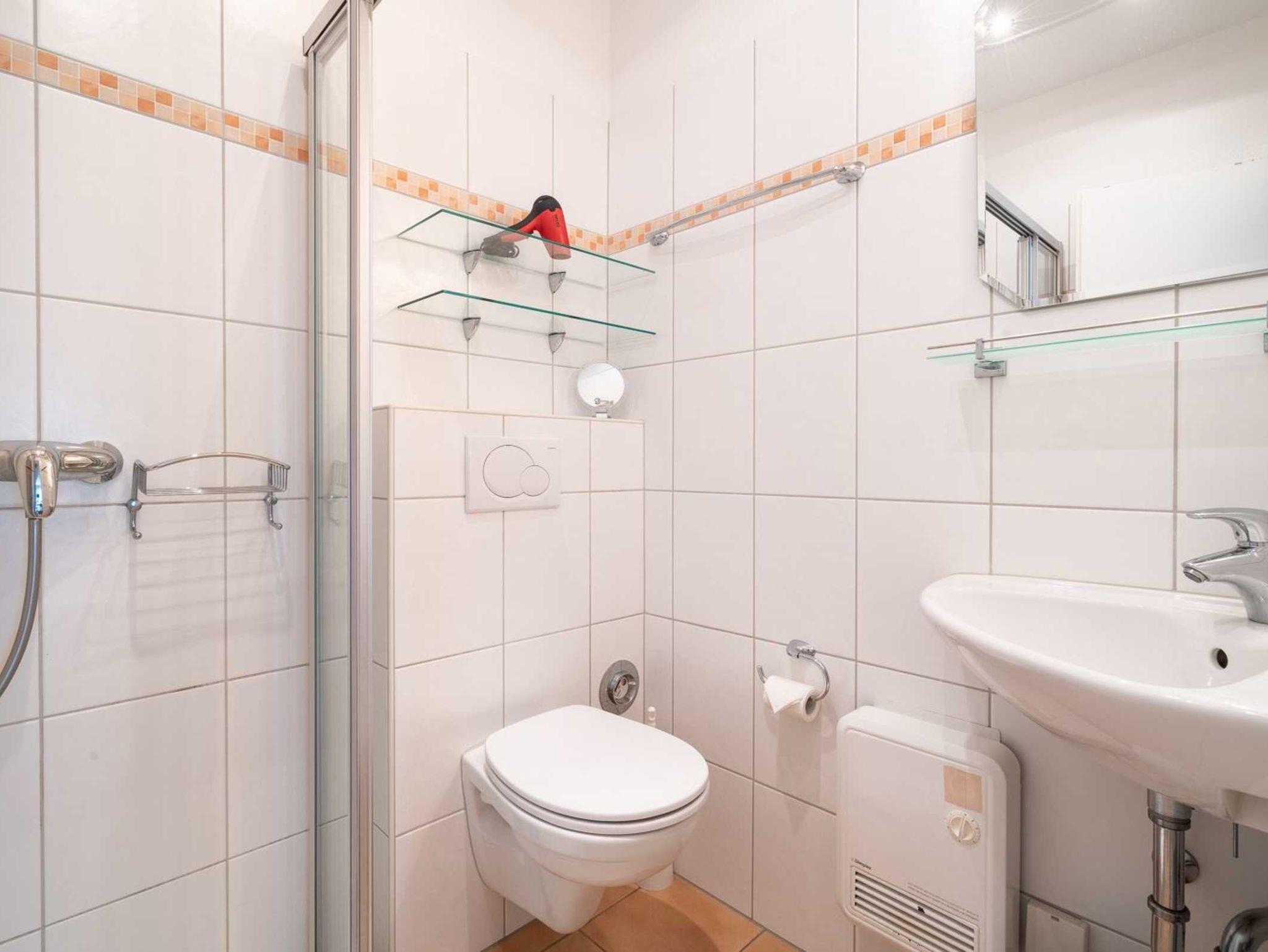 Badezimmer (Duschbad) mit Dusche mit niedrigem Eintritt (ca. 5cm), WC, Heizlüfter und Föhn.