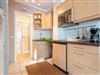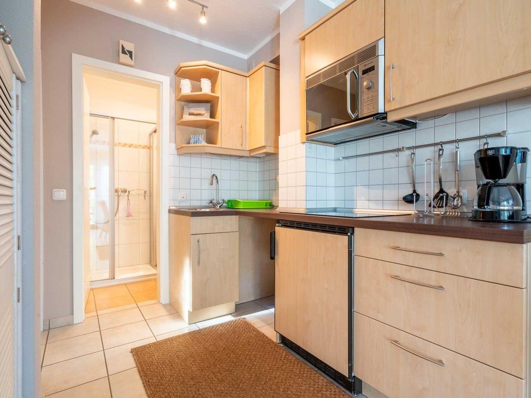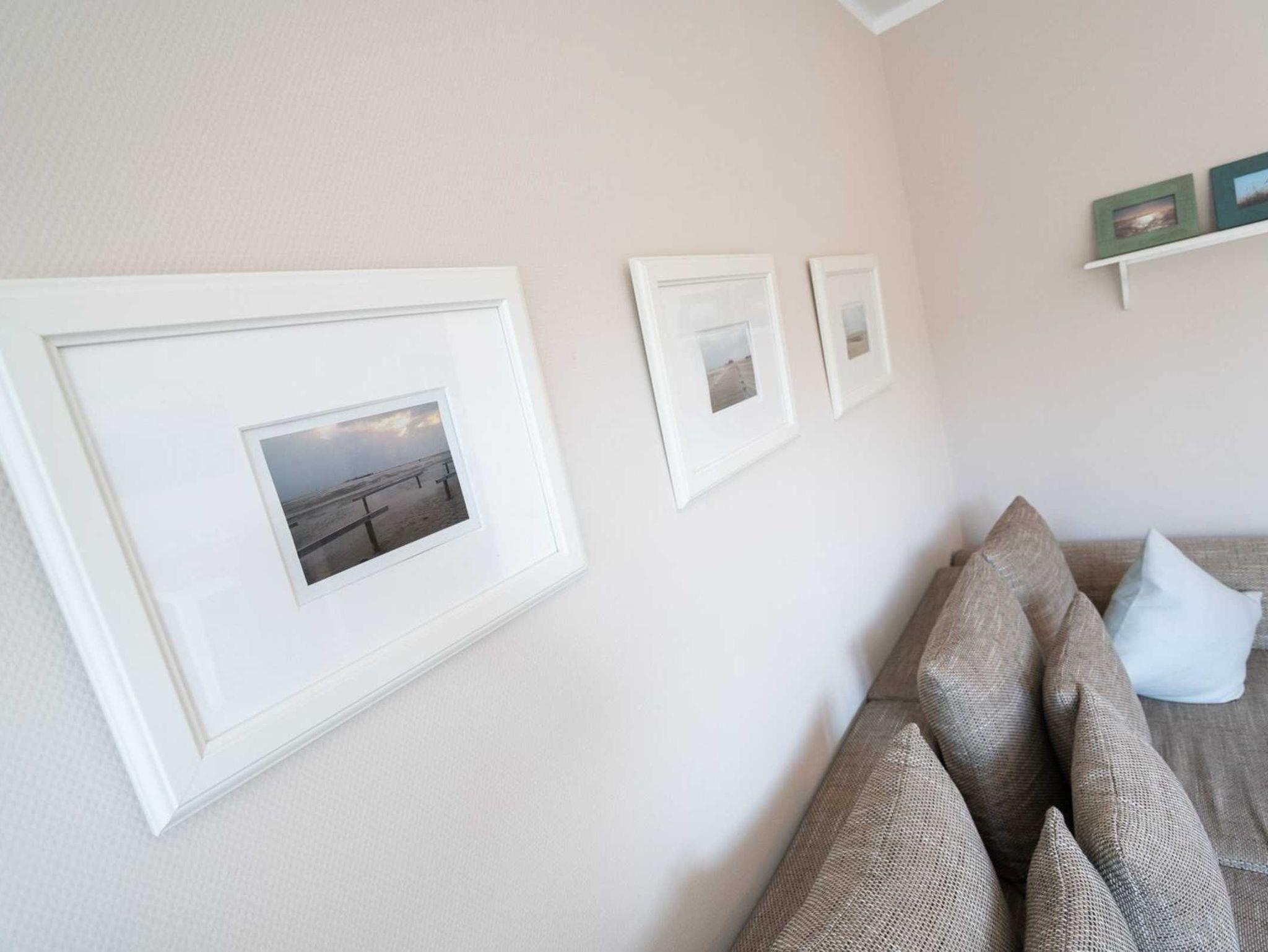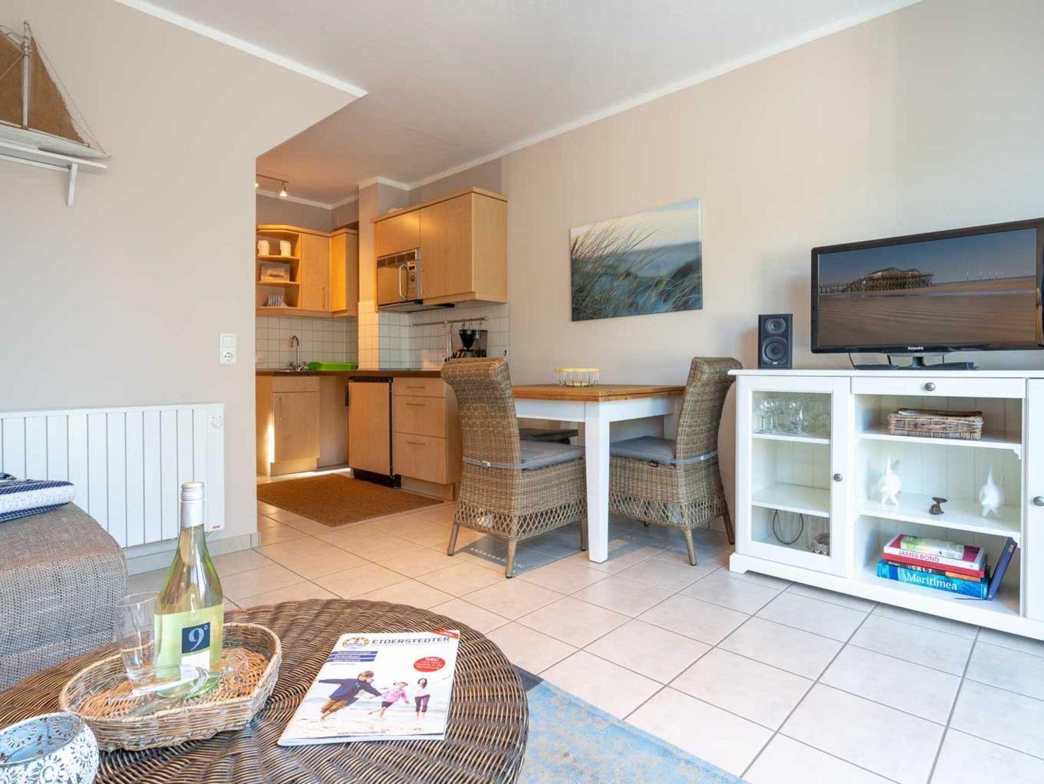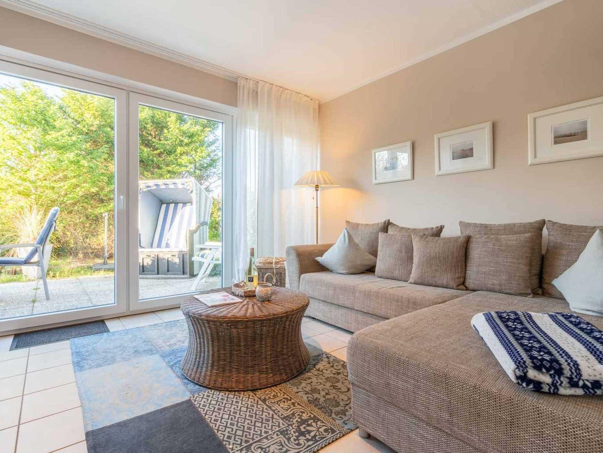 Wohnzimmer mit großem (Schlaf-) Ecksofa (120x220cm), TV (Kabel), Stereoanlage und Esstisch mit 3 Stühlen. Direkter Zugang zur möblierten, windgeschützten Terrasse nach Südwesten mit Strandkorb. Offene Küche mit Kühlschrank mit Gefrierfach und Mikrowelle mit Grillfunktion.