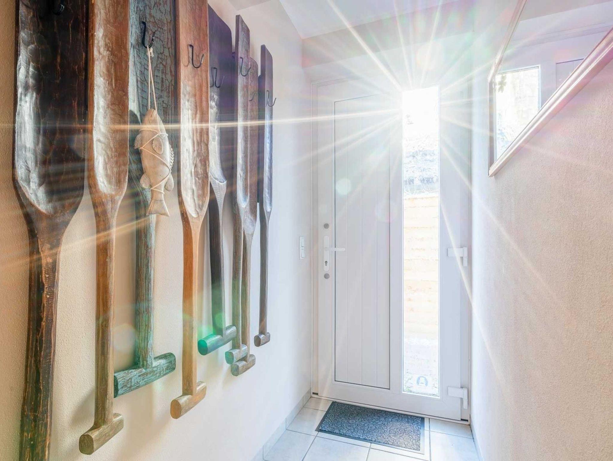 Flur mit Garderobe und Spiegel im Eingangsbereich. Abstellnische mit Staubsauger vorhanden.