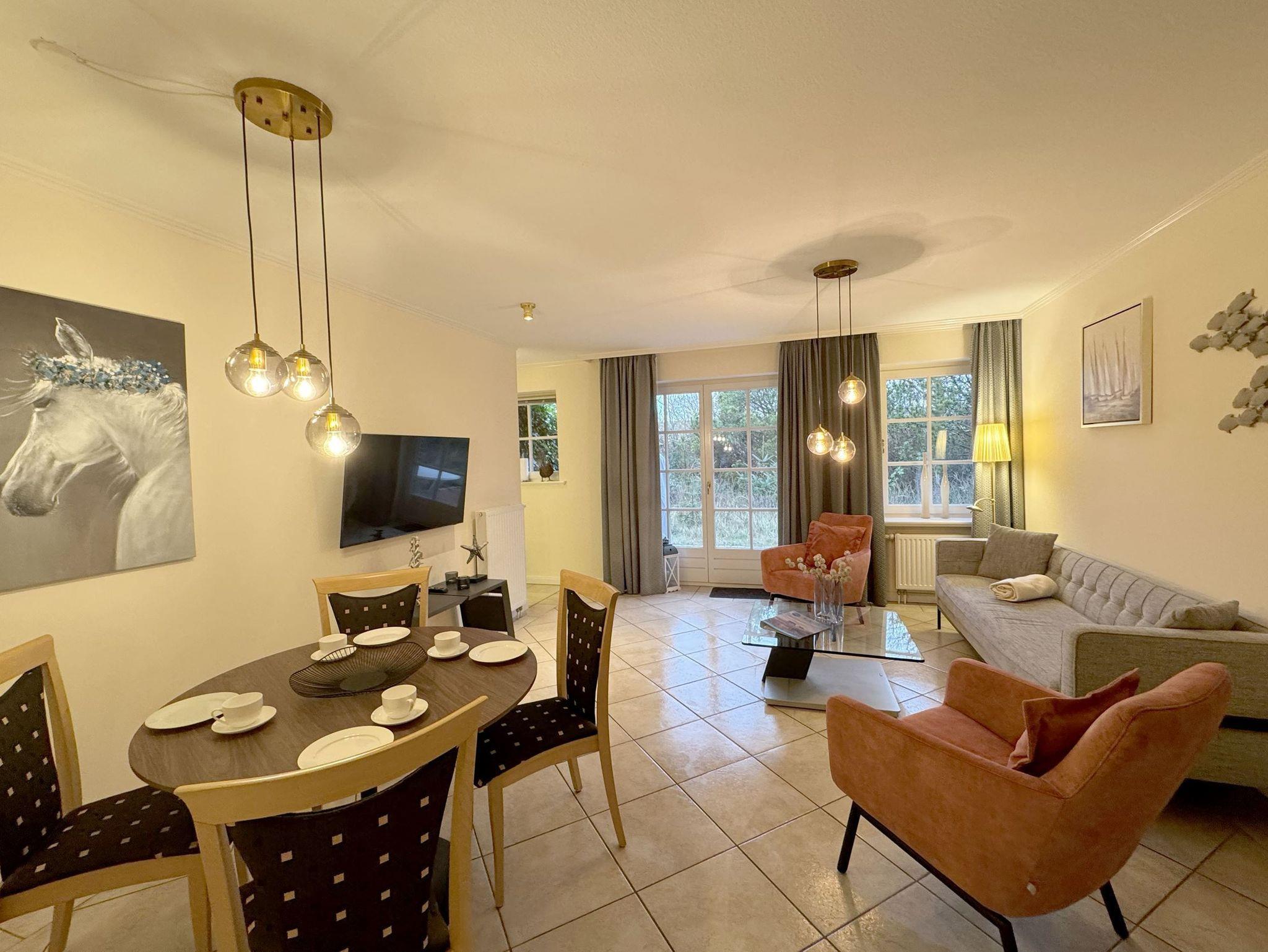 Die 75 qm große Ferienwohnung ist für 4 Pers. geplant und teilt sich wie folgt auf: Eingangsbereich; Eingangsdiele mit Garderobe; großzügiger Wohn-Essbereich mit direktem Zugang auf eine große, durch Friesenwälle und Gehölze abgeschirmte Terrasse mit Gartenmöbeln und einem Strandkorb. Zwei Schlafzimmer mit Doppelbetten, zwei Duschbäder/WC. Separate Küche. Im Untergeschoss befindet sich eine Gemeinschaftssauna, Ruheruam, verschiedene Duschen, Fußbäder, Solarium, Fitnessraum, Tischtennis. Im Außenbereich: ein Spielplatz für die Kleinsten, Stellplatz, Fahrradständer