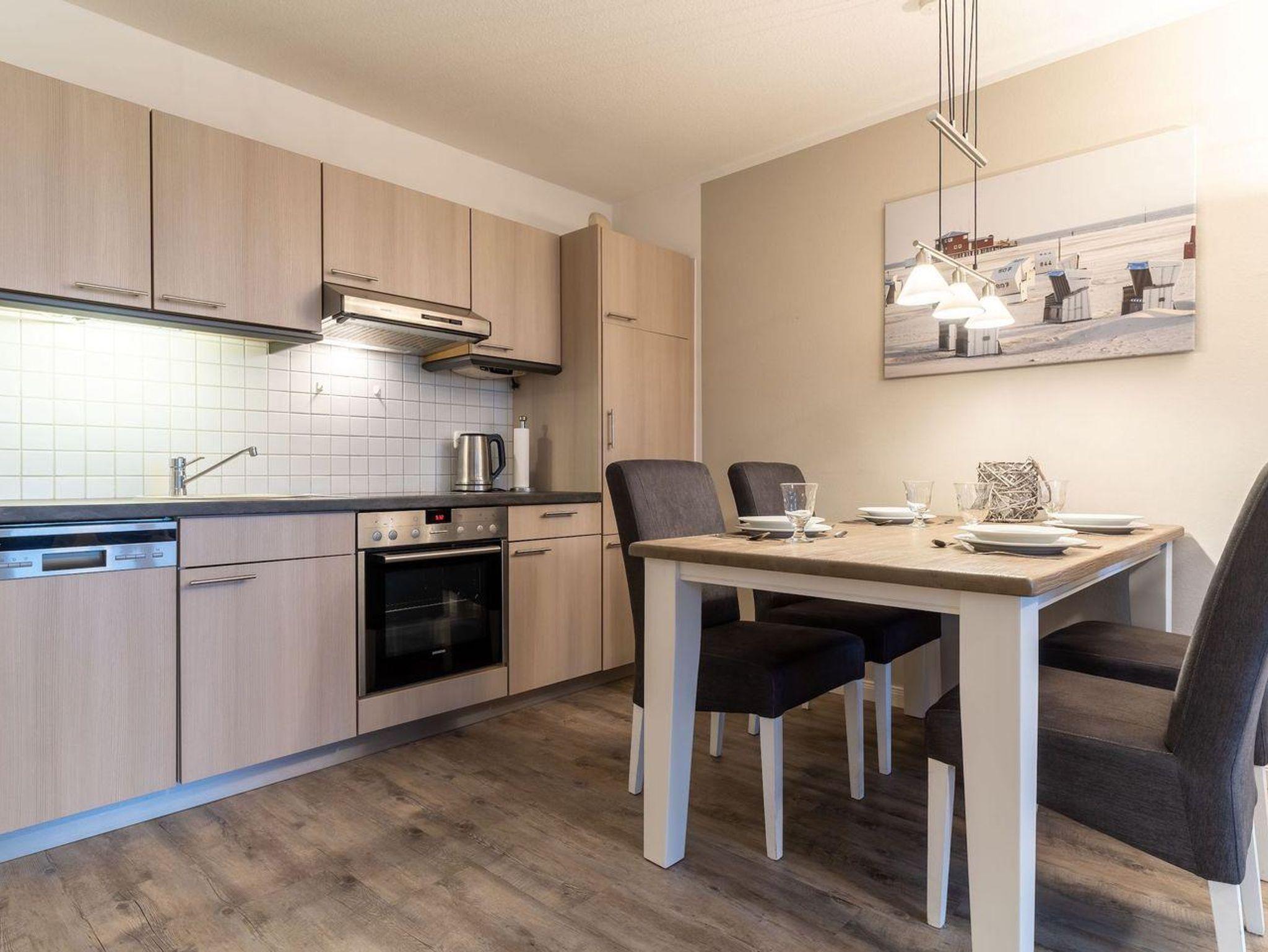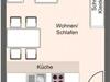 Der Wohnbereich zum wohlfühlen besteht aus einer Couch, einem Sessel und einem Couchtisch. Des weiteren ist ein Esstisch mit 4 Stühlen vorhanden. Die Küche wurde 2020 renoviert und ist ausgestattet mit Cerankochfeld, Backofen, Dunstabzugshaube, Spülmaschine, Geschirr, Kaffeemaschine und einer Tschibo Cafissimo Kapselmaschine, Kochtöpfe, Kühlschrank, Toaster sowie einem Wasserkocher.
