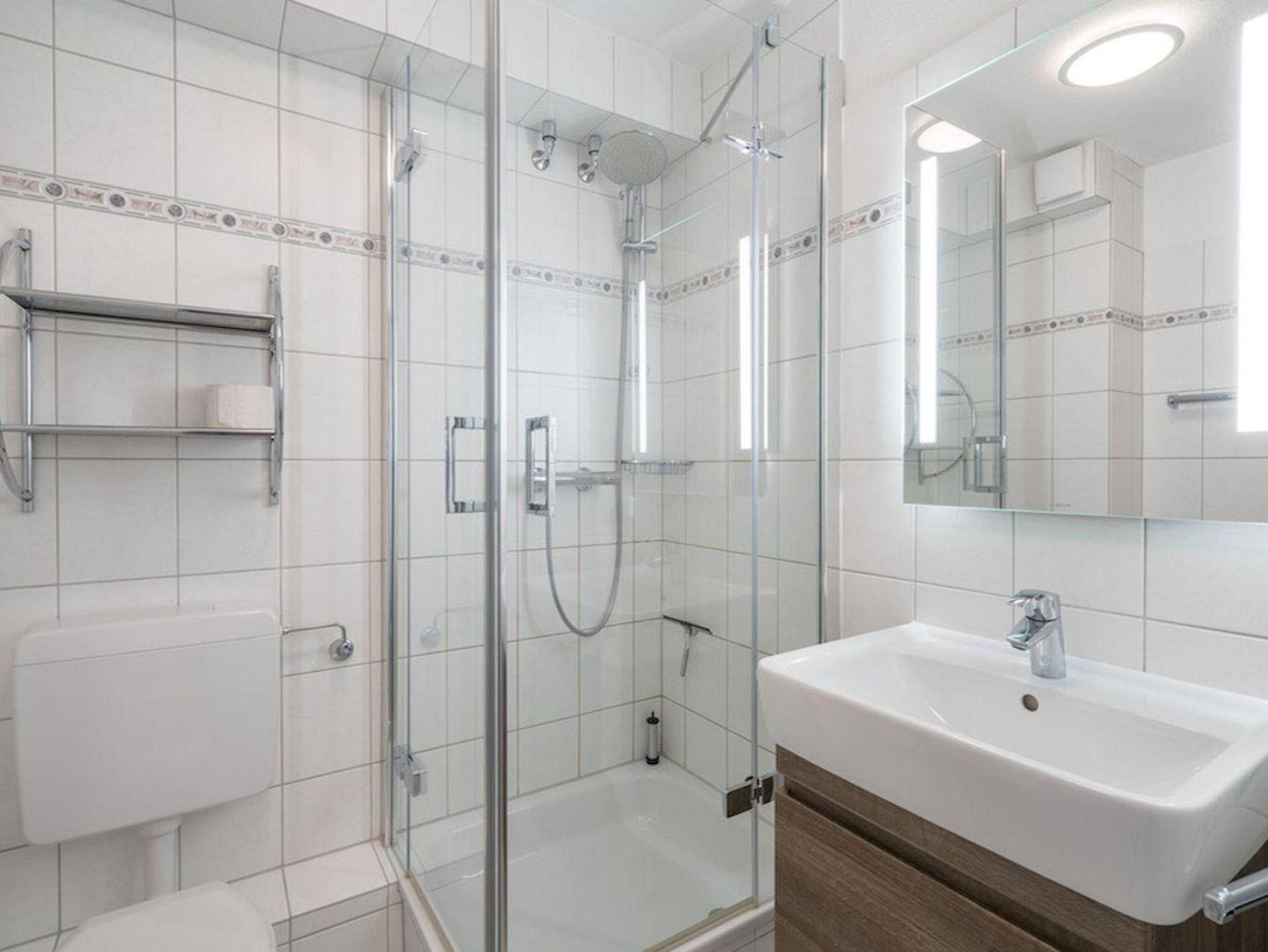 Das Badezimmer besteht aus einer Dusche, Waschbecken und WC.