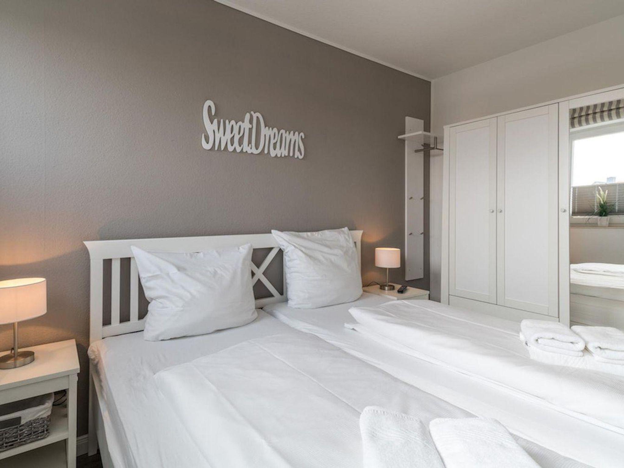 Das Schlafzimmer mit 2 Nachttischen und Kleiderschrank bietet Ihnen ein Doppelbett (2,00 x 1,80 m) und einen Sat TV Flachbildschirm.