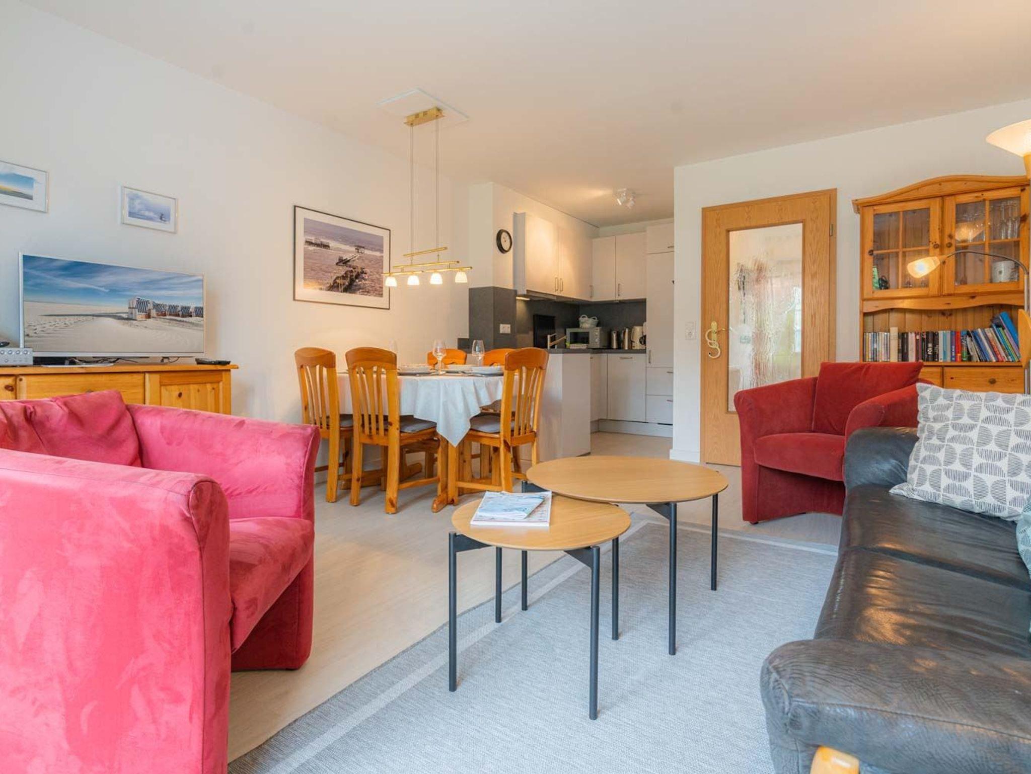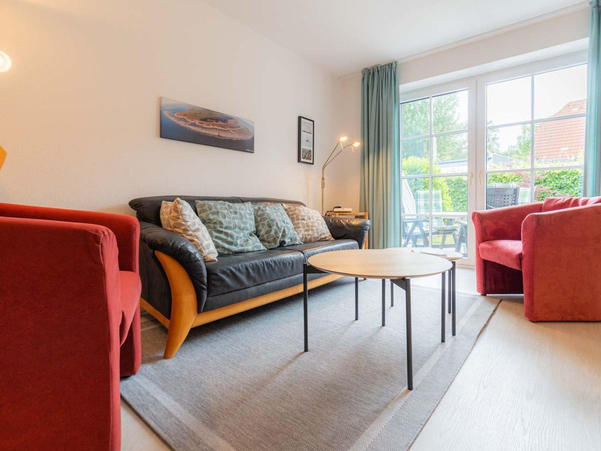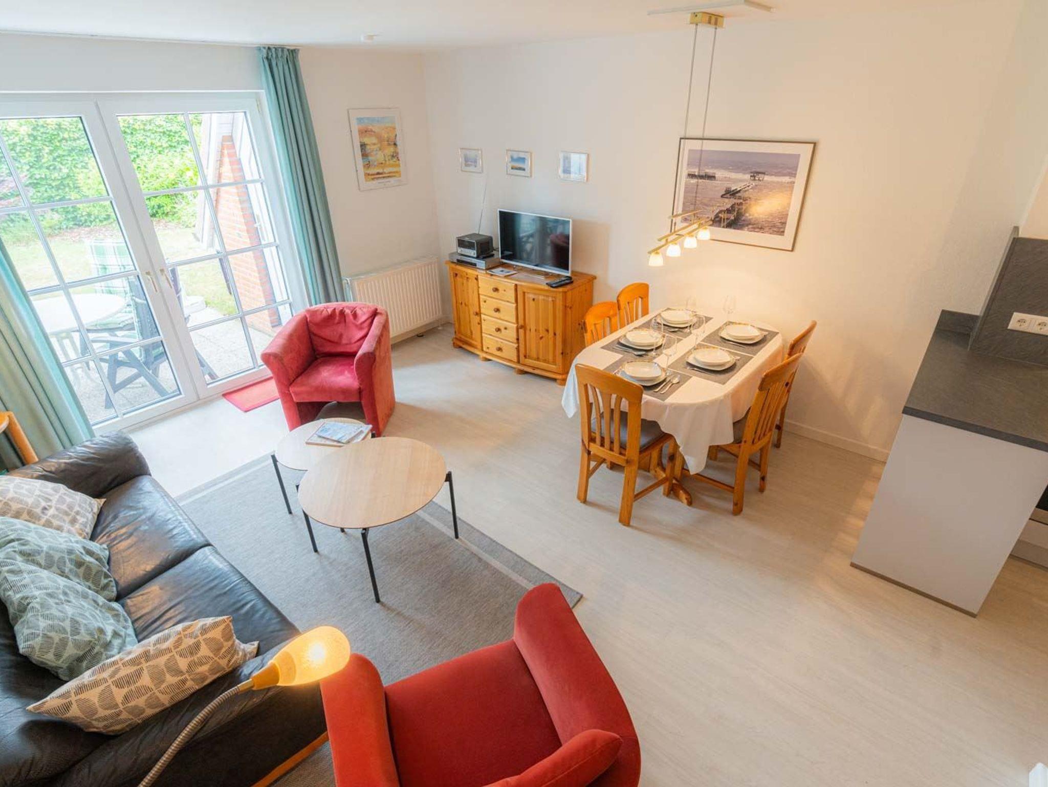 Wohnzimmer mit Sofa (3er), 2 Sesseln, TV (Kabel) und Esstisch mit 5 Stühlen. Direkter Zugang zur windgeschützten, möbierten Terrasse nach Süden mit gemeinschaftlichem Garten. Offene Küche mit Backofen, Mikrowelle, Kühlschrank mit Gefrierfach und Geschirrspüler.