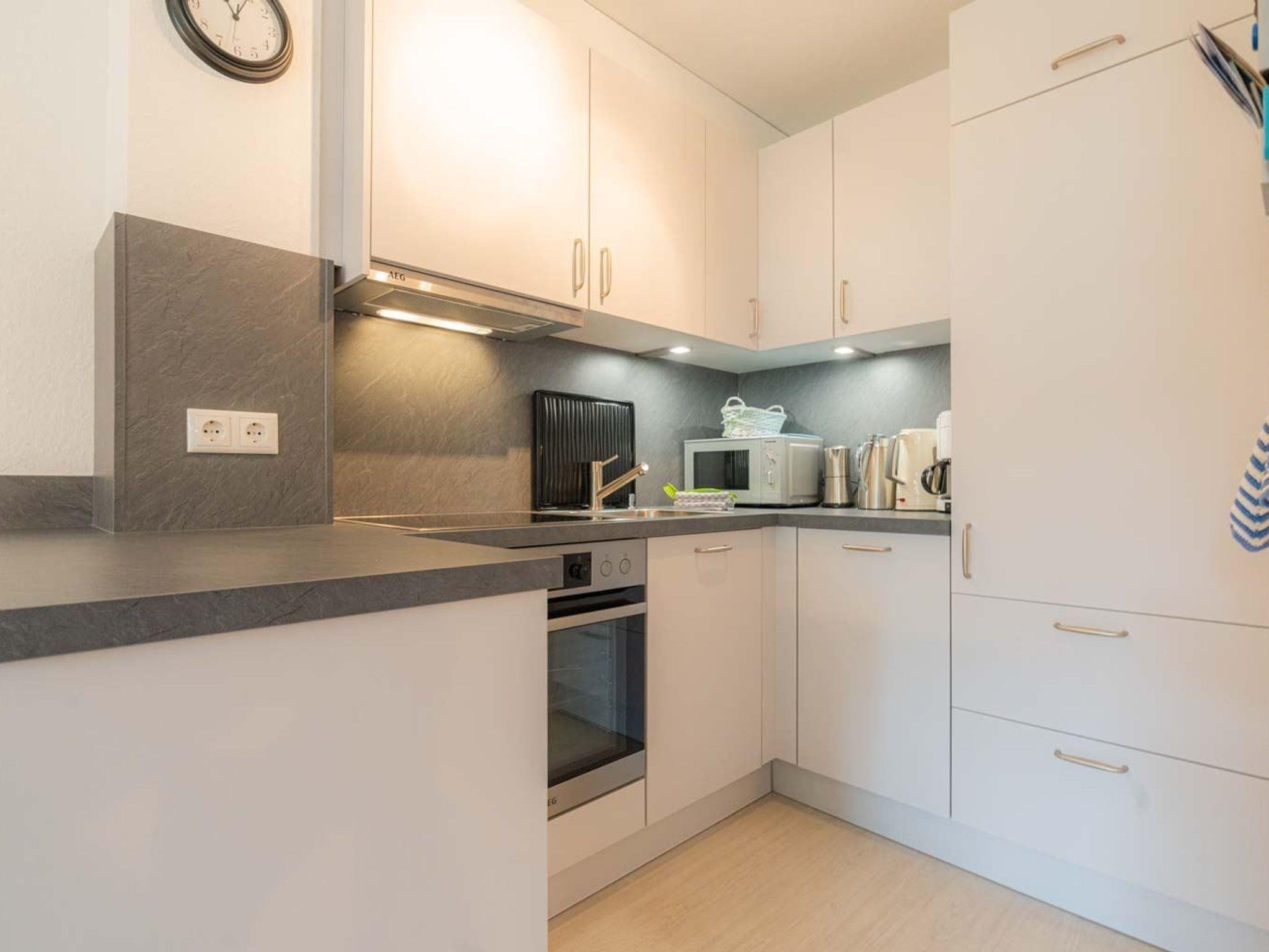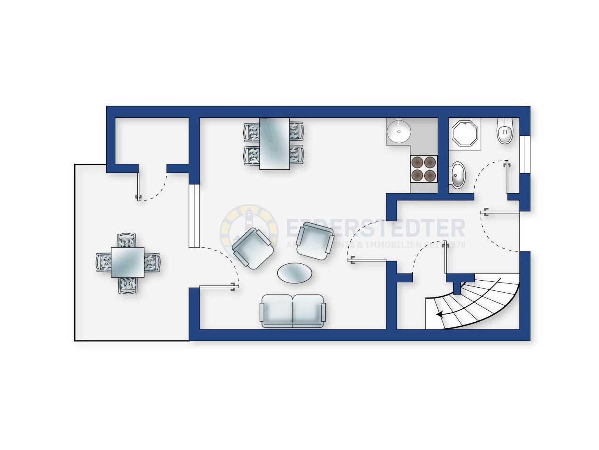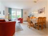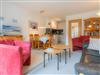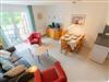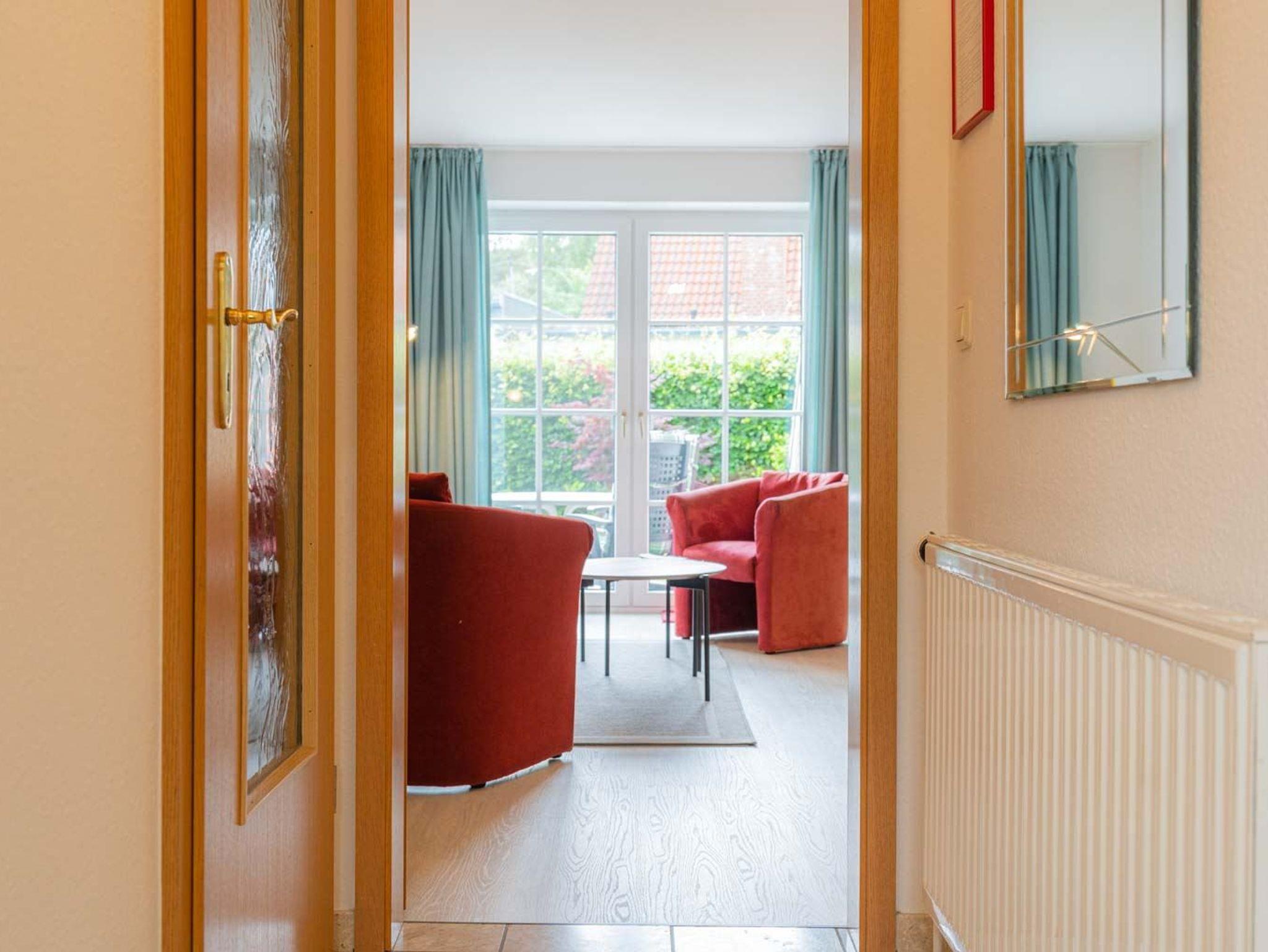 Wohnzimmer mit Sofa (3er), 2 Sesseln, TV (Kabel) und Esstisch mit 5 Stühlen. Direkter Zugang zur windgeschützten, möbierten Terrasse nach Süden mit gemeinschaftlichem Garten. Offene Küche mit Backofen, Mikrowelle, Kühlschrank mit Gefrierfach und Geschirrspüler.