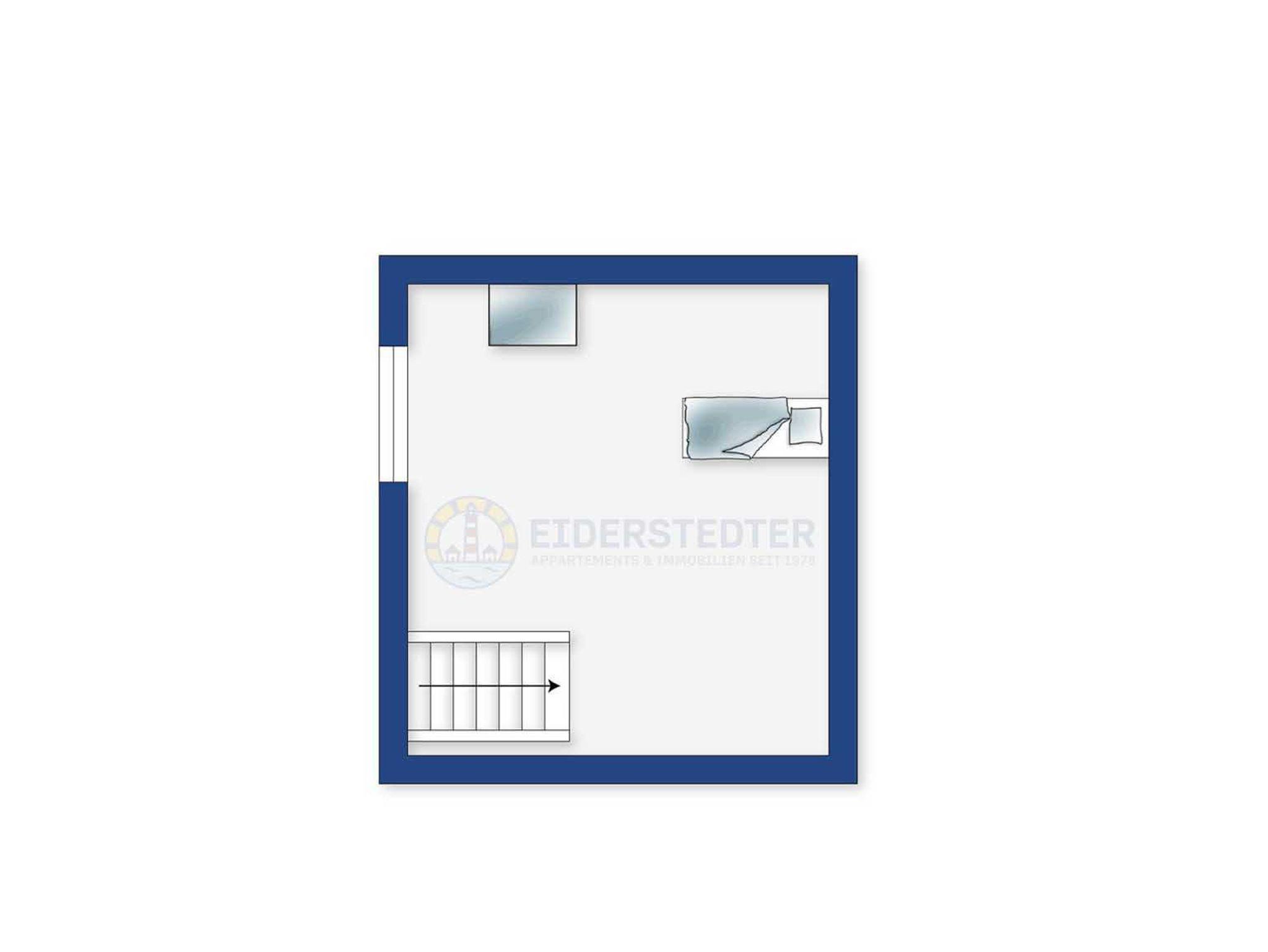 3. Schlafzimmer mit 1 Einzelbett (90x200cm), Sideboard, kleinem Schreibtisch, Stuhl und Sessel. Zugang über eine steile Treppe aus dem 2. Schlafzimmer.