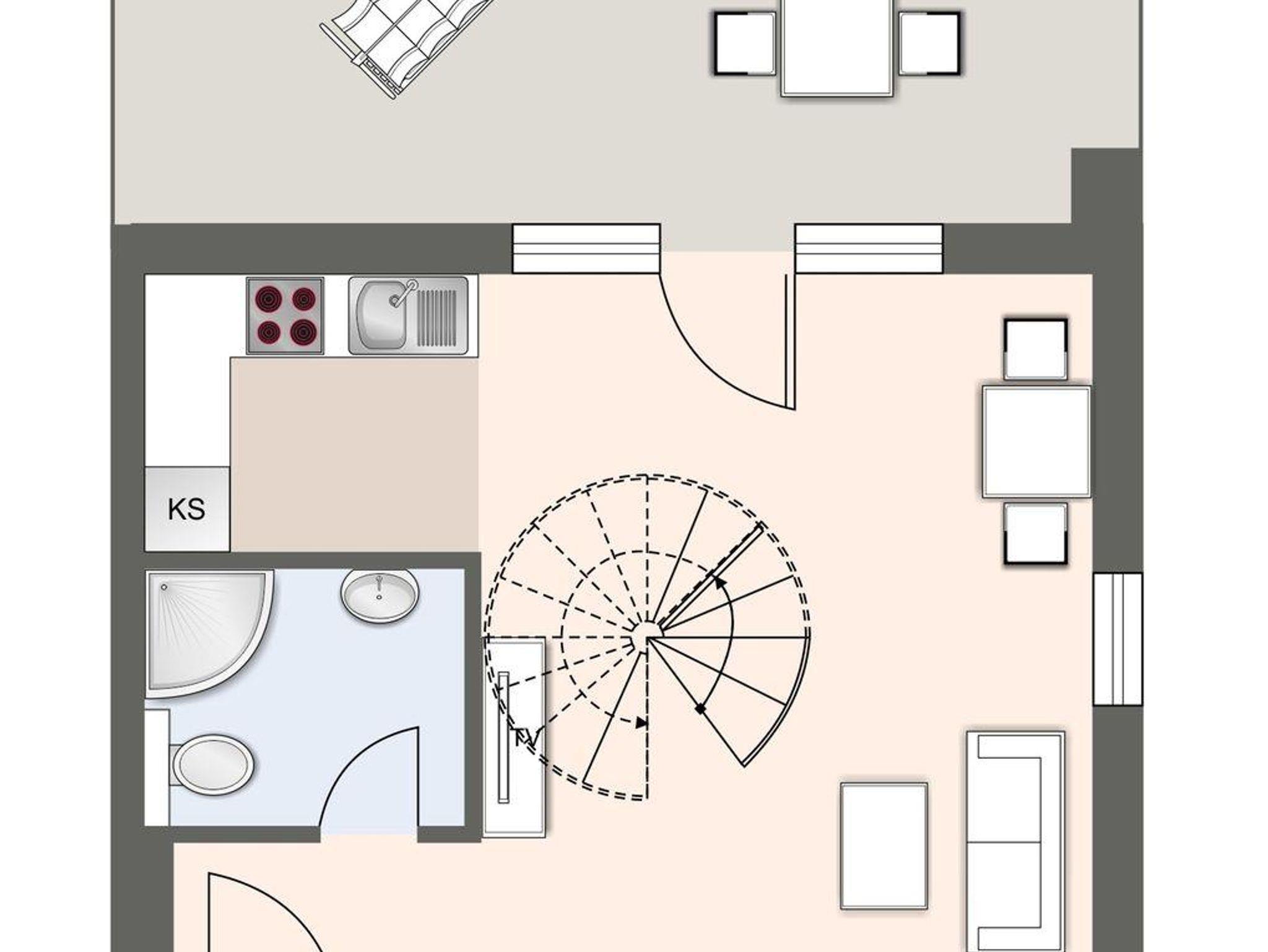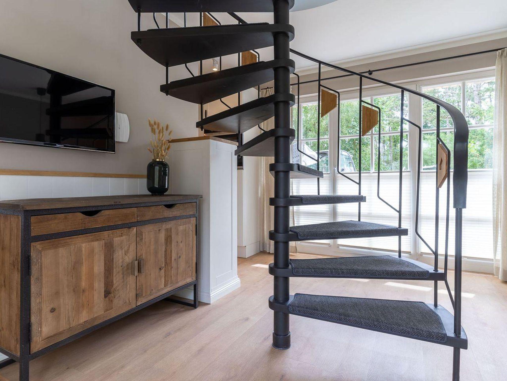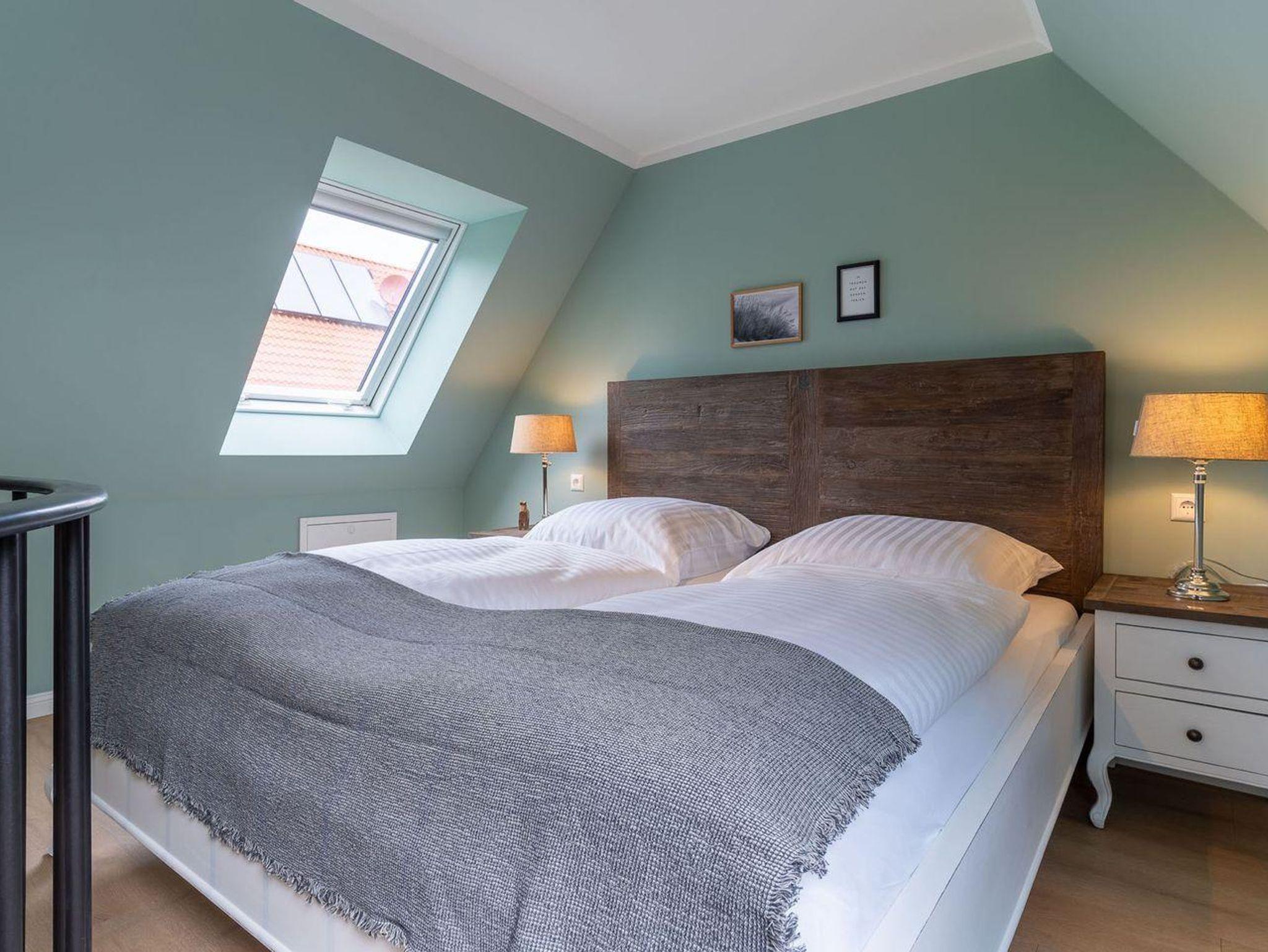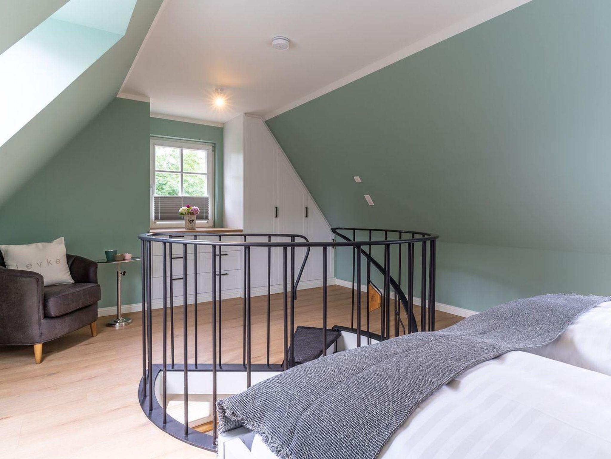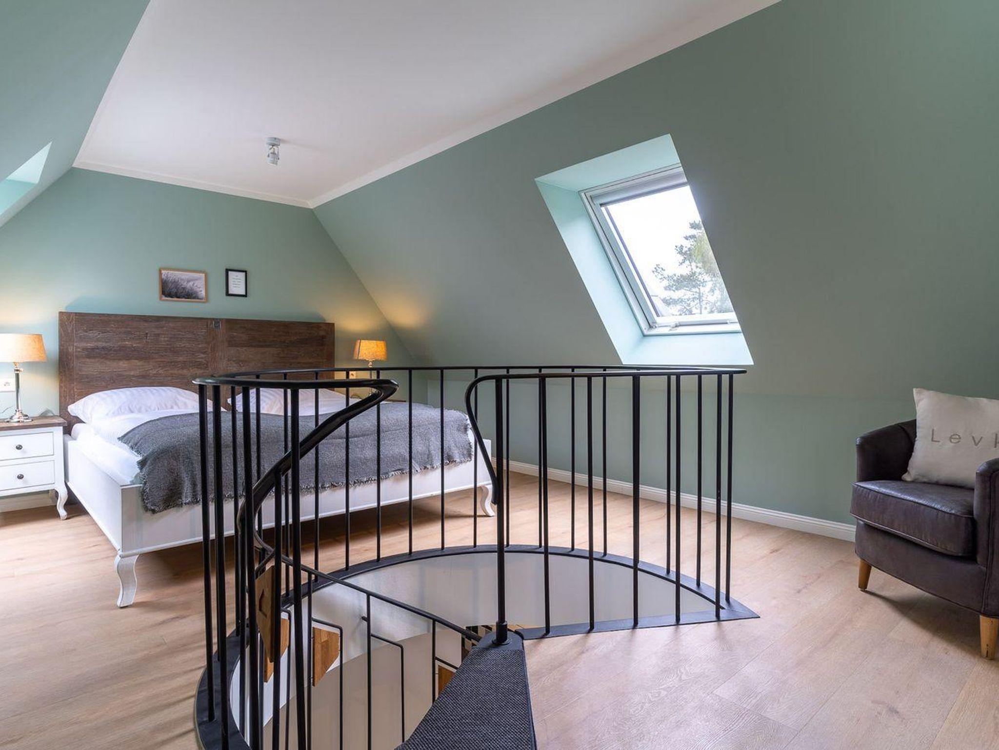 Über eine Wendeltreppe aus dem Wohnraum gelangt man in das Obergeschoss. Hier befindet sich das gemütliche Schlafzimmer, mit einem Doppelbett.