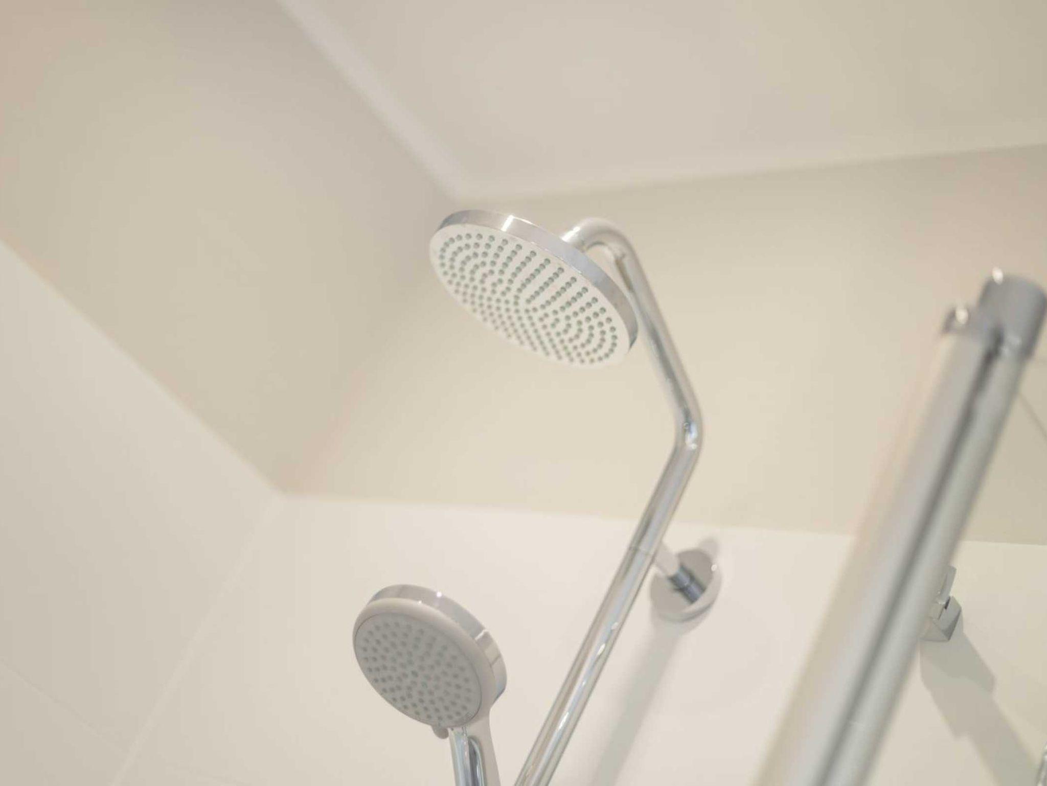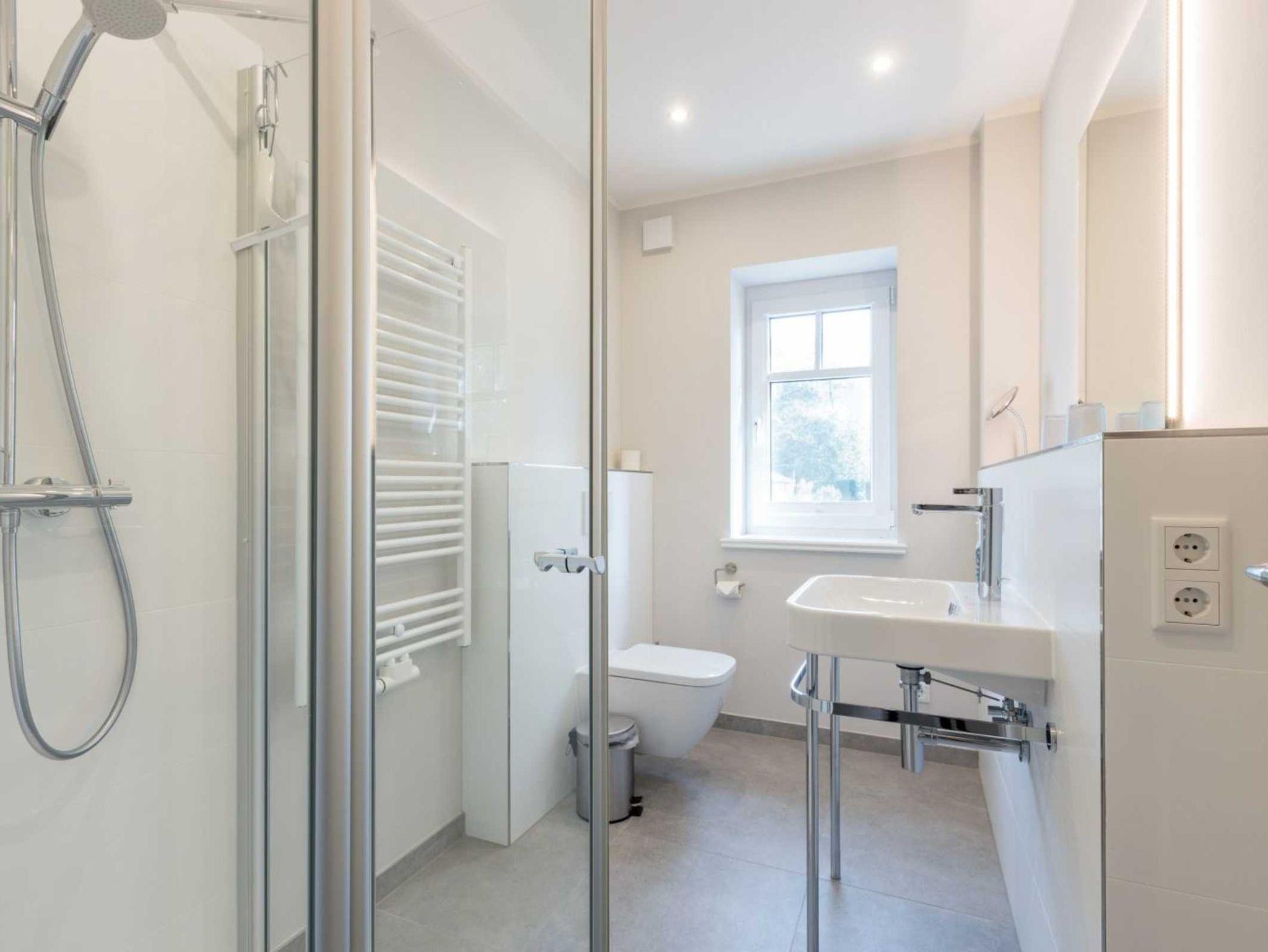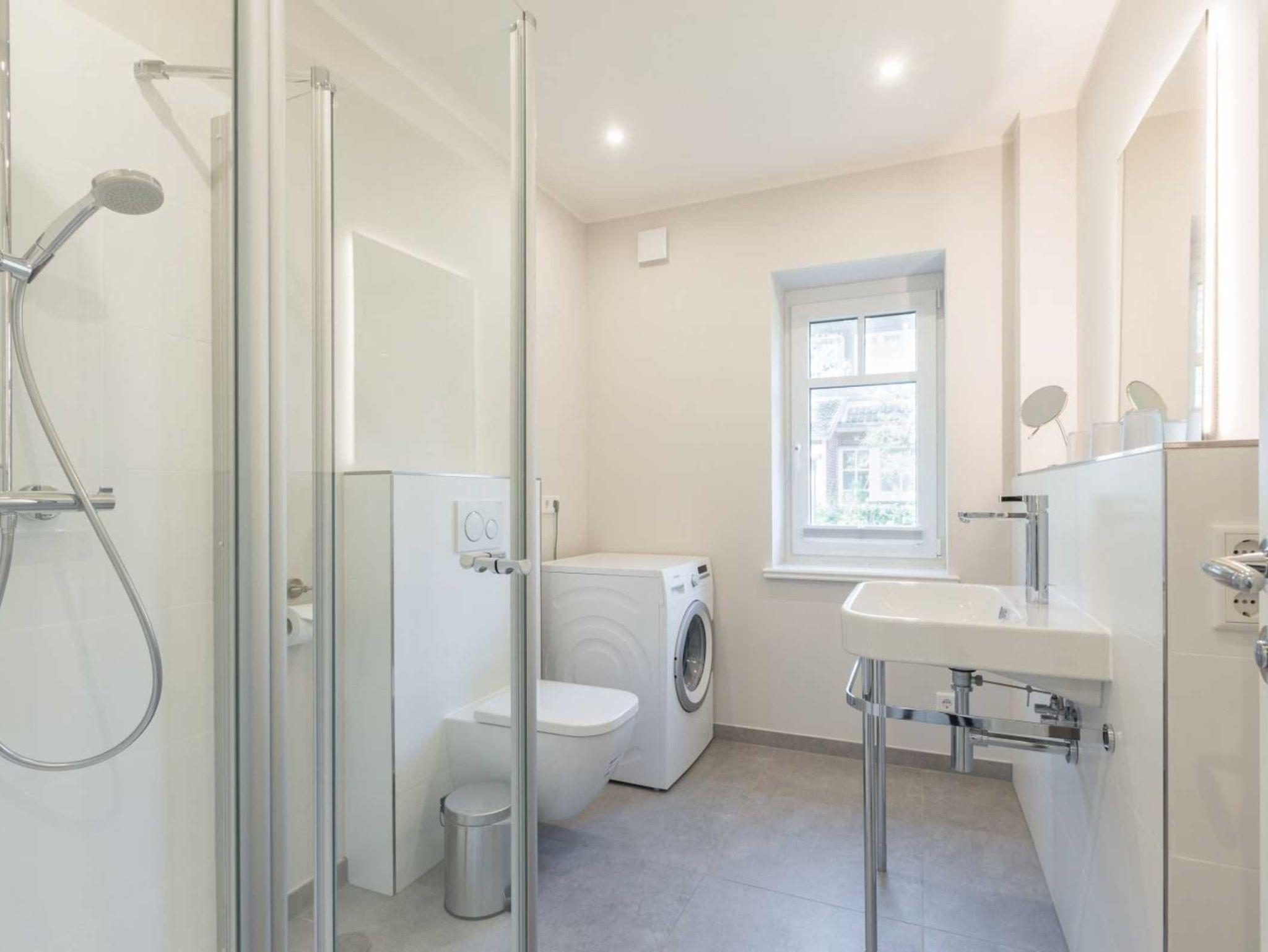 1. Badezimmer (Duschbad) mit bodengleicher Dusche, WC, Handtuchwärmer, Tageslicht, Kosmetikspiegel, Föhn und Waschmaschine.