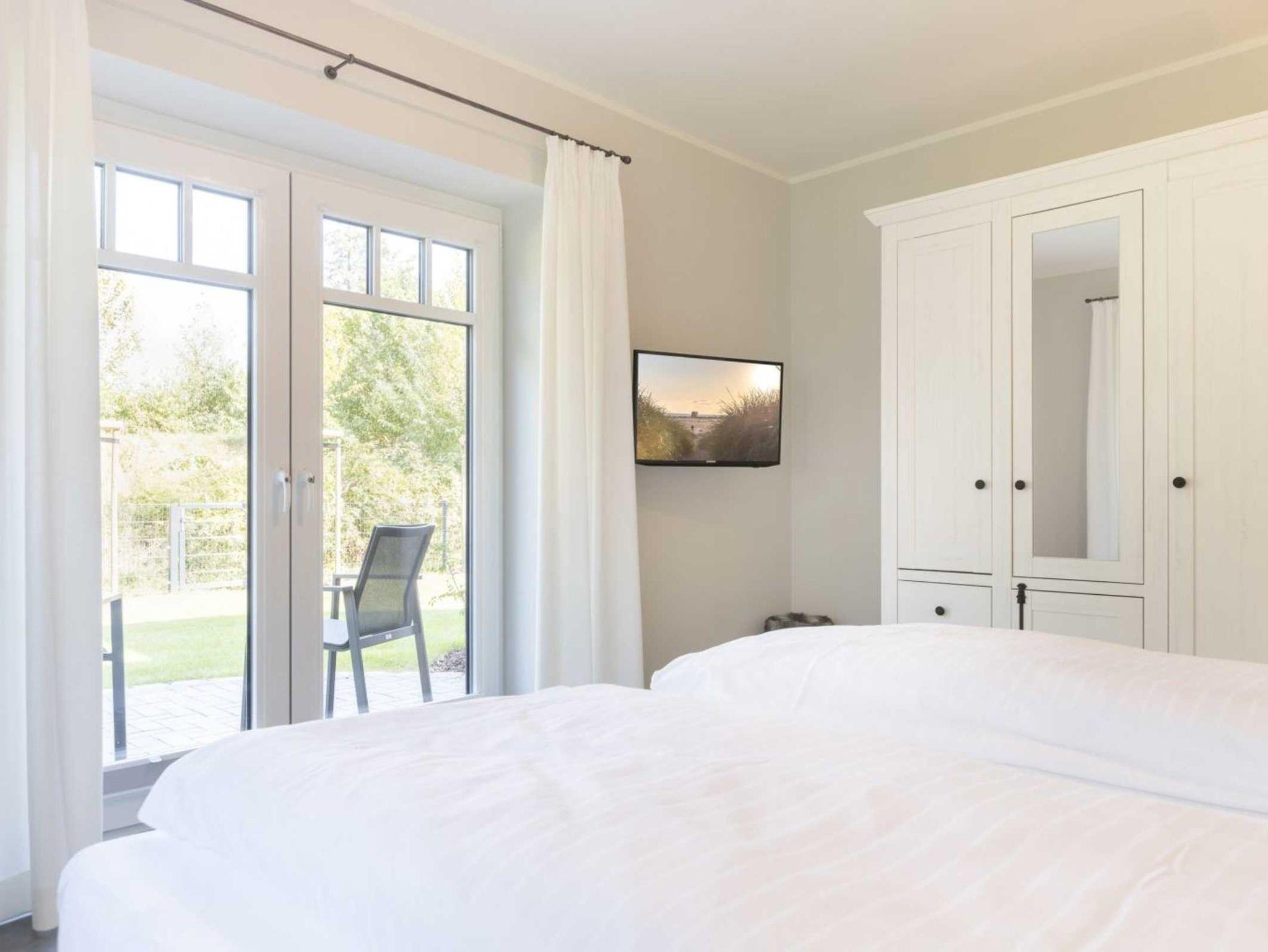 2. Schlafzimmer mit Doppelbett (2x 90x200cm), SMART-TV (Sat) und Austritt zur Gartenterrasse nach Südenwesten.