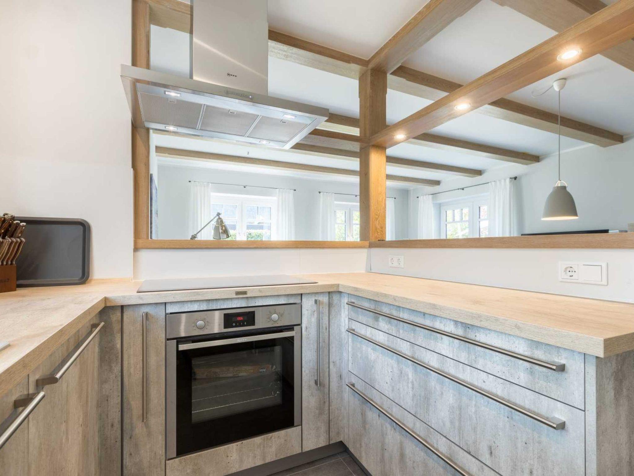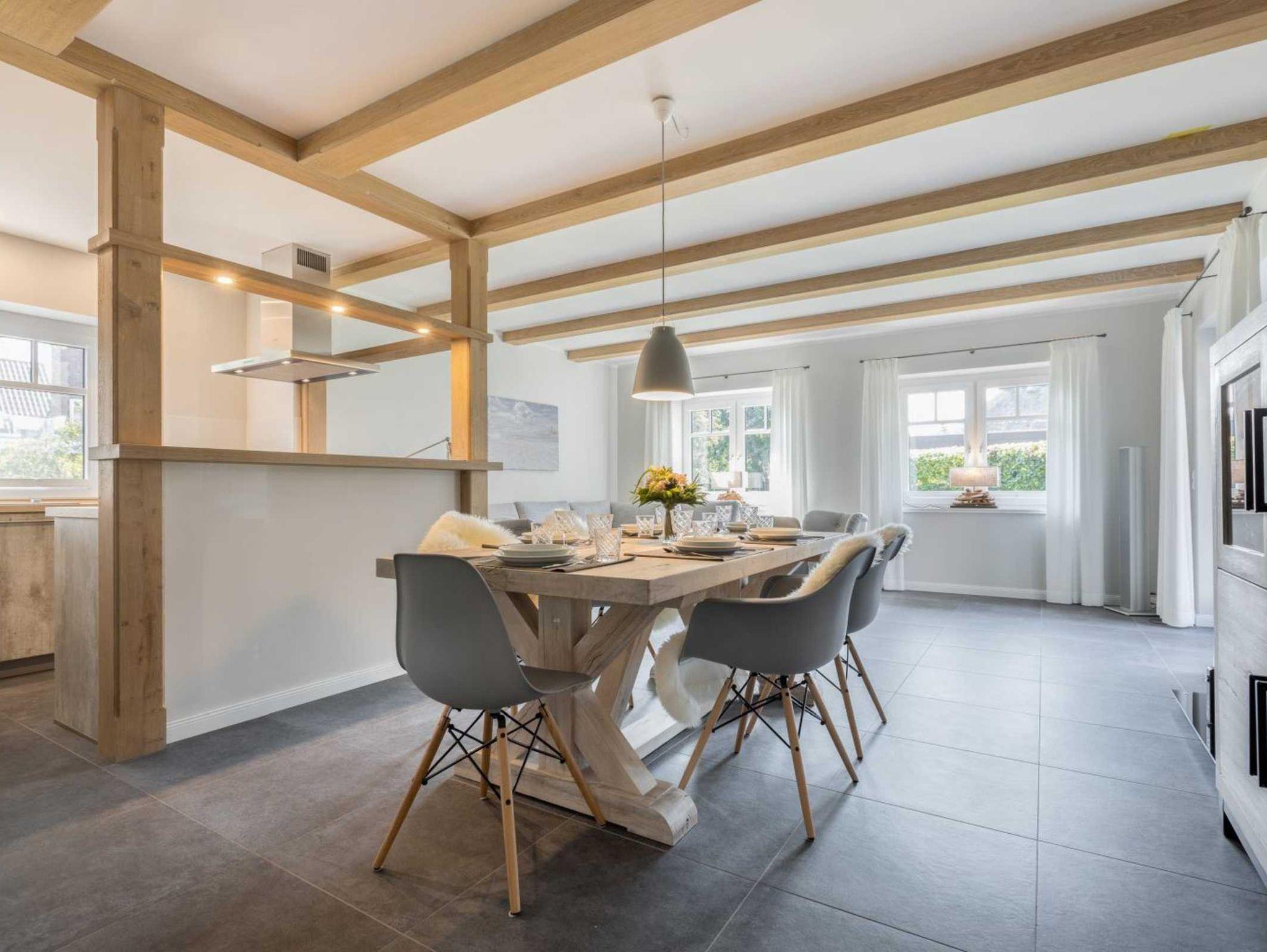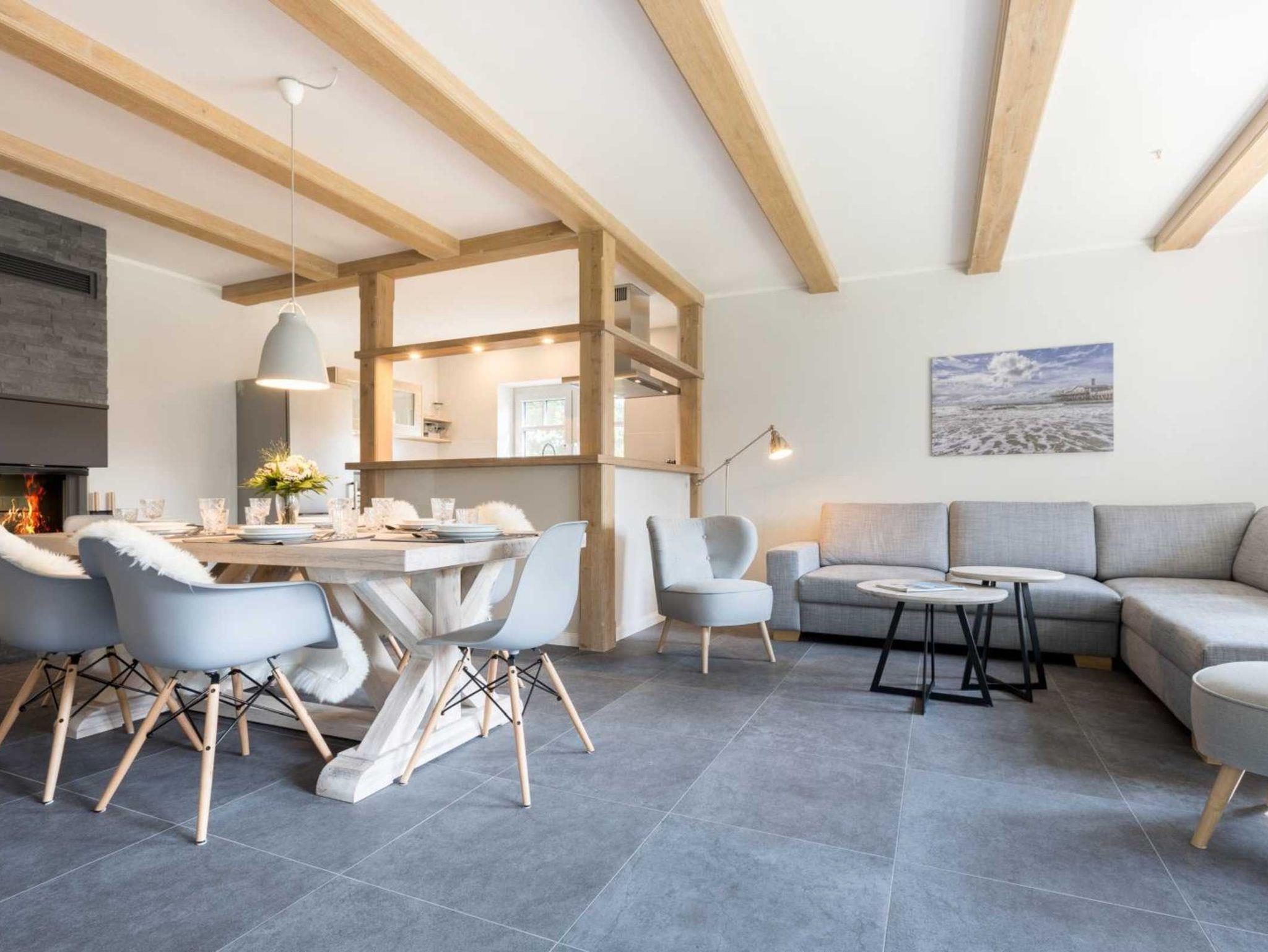 Wohnzimmer mit großem Ecksofa, Sesseln, SMART-TV (Sat), YAMAHA-Bluetooth-Soundsystem, gemütlichem Kaminofen, Esstisch für 6 Personen und Austritt zur schönen, möblierten Gartenterrasse nach Südwesten mit Strandkorb. Moderne, offene Küche mit Backofen, Mikrowelle, Geschirrspüler, Induktionskochfeld und Kühl-Gefrier-Kombination.