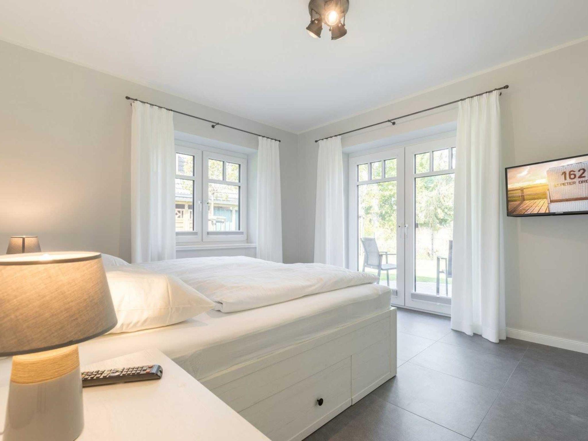 1. Schlafzimmer mit Doppelbett (2x 90x200cm), SMART-TV (Sat) und Austritt zur Gartenterrasse nach Norden.