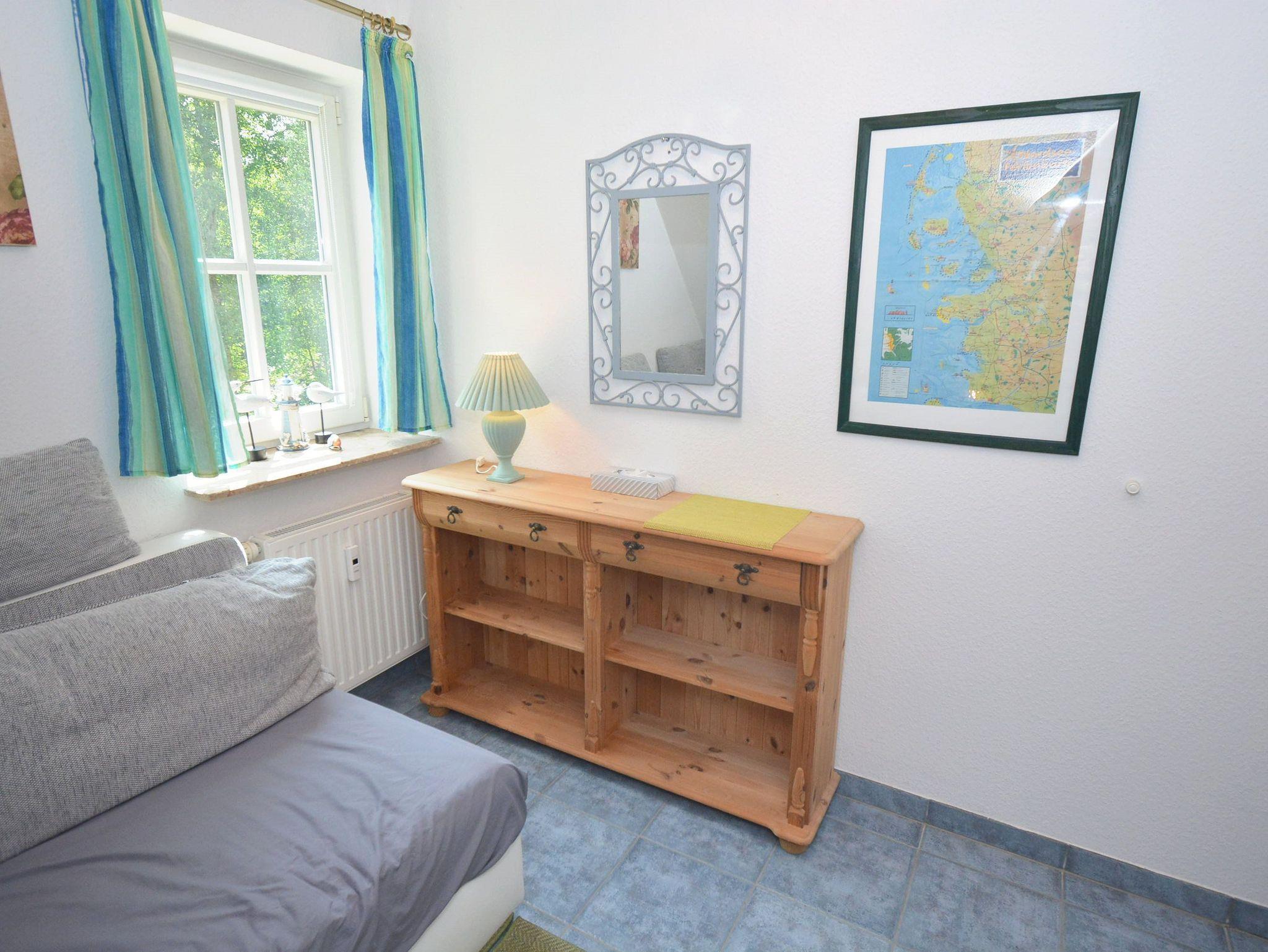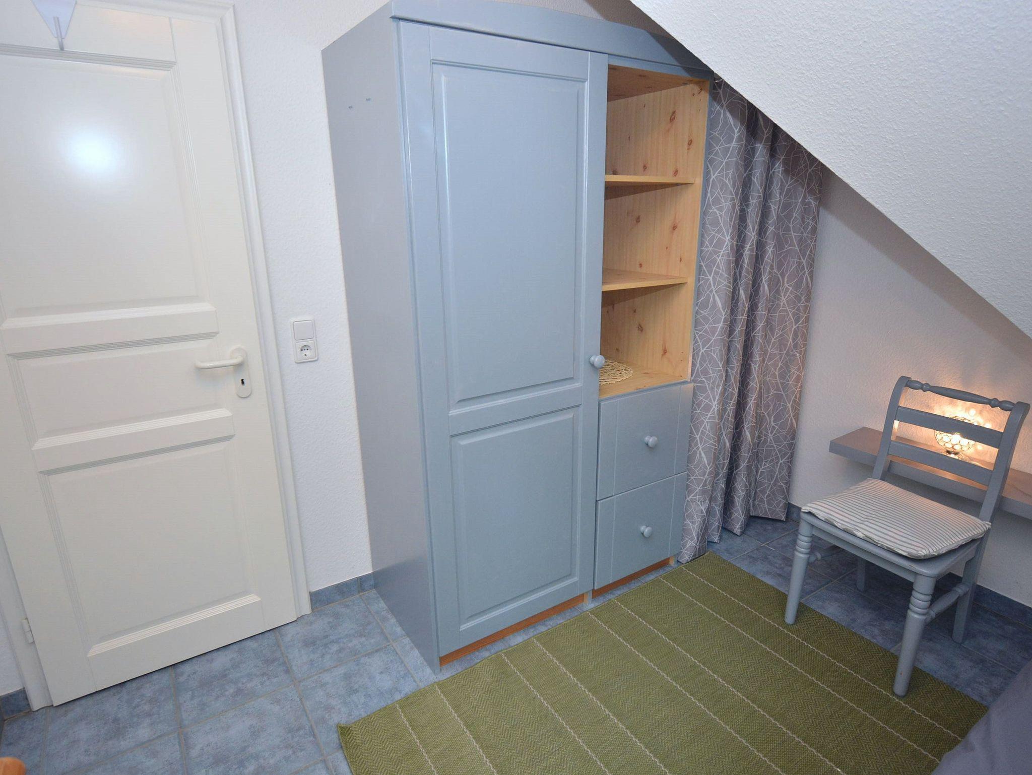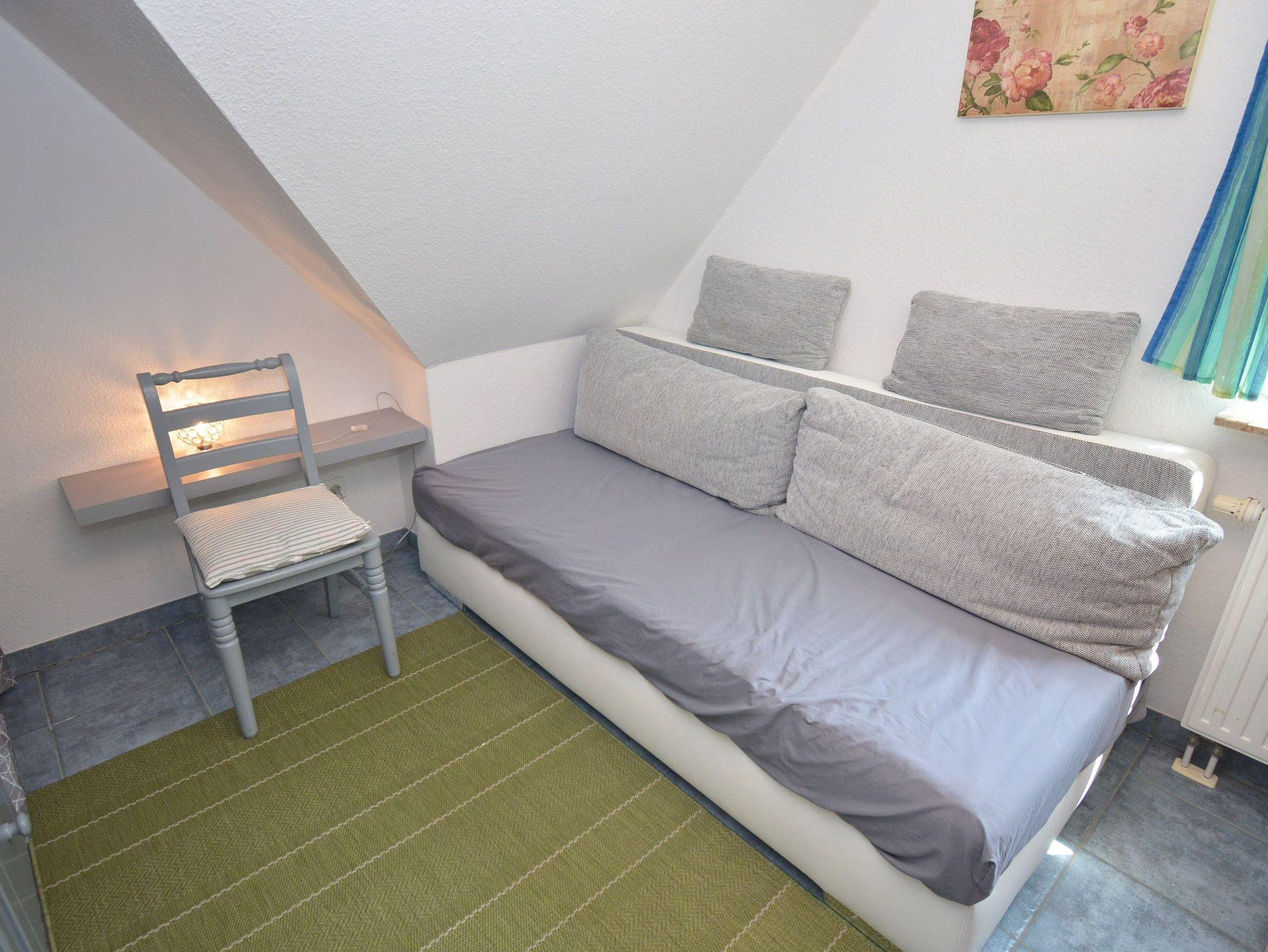 Schlafzimmer 2: Nachttisch, Schlafcouch, Schrank, Staubsauger, Stuhl, Wäschetruhe