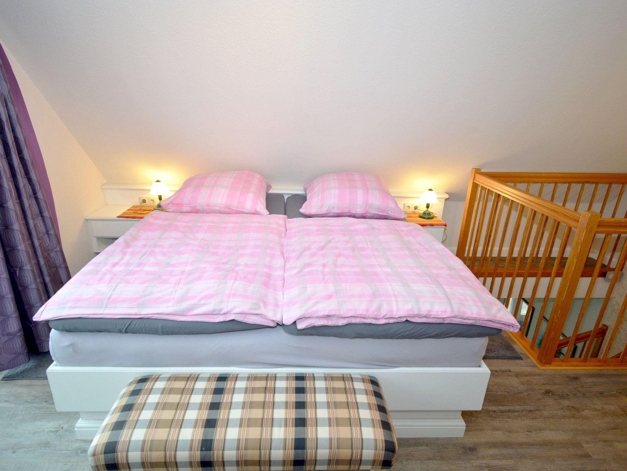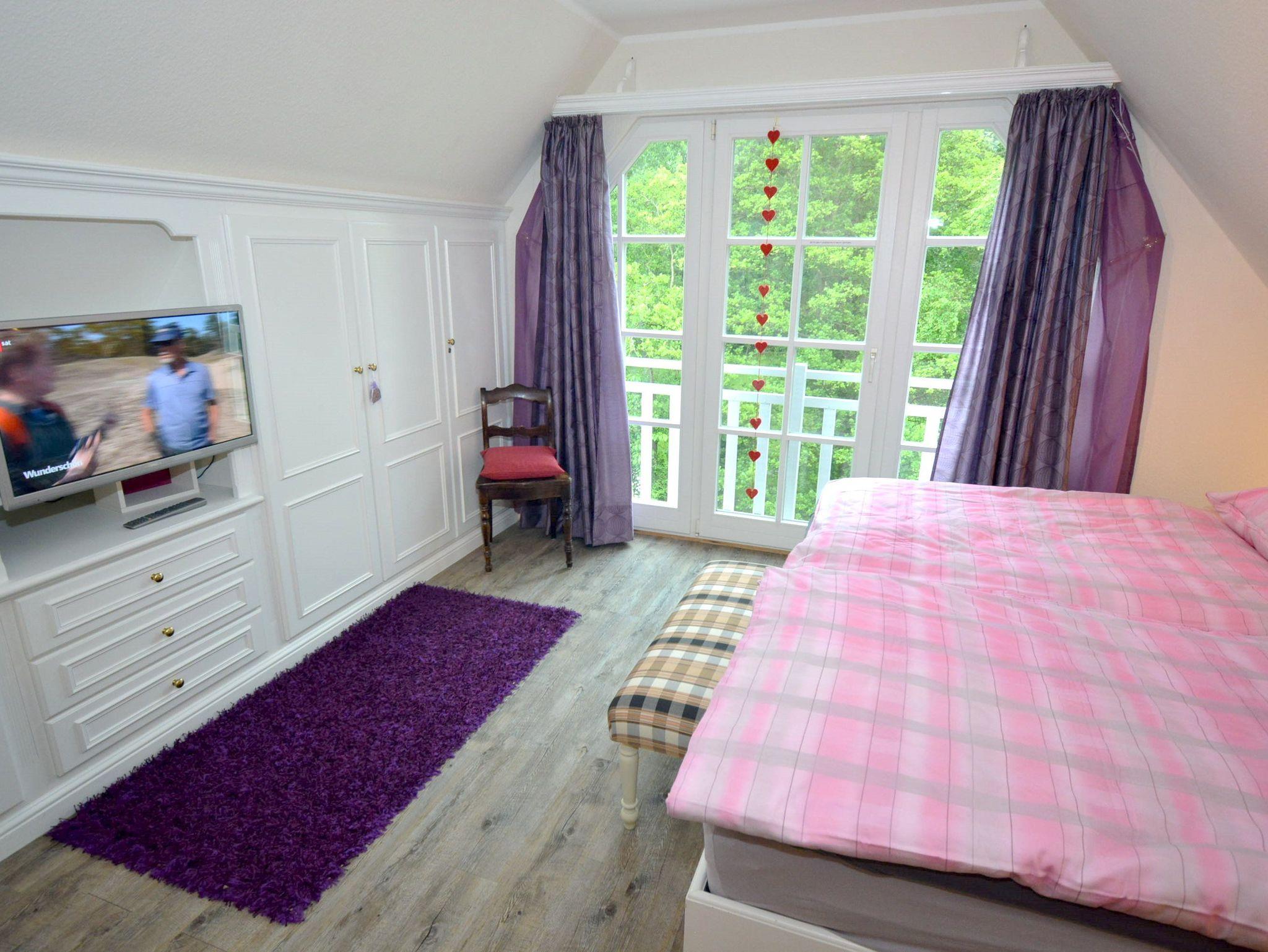 Schlafzimmer 1: 2 Nachttische, 2 Spiegel, Doppelbett 2,00 x 1,80 m, Einbaukleiderschrank, Flachbildschirm, Hocker, Sat-TV, Sessel, Treppe nach unten