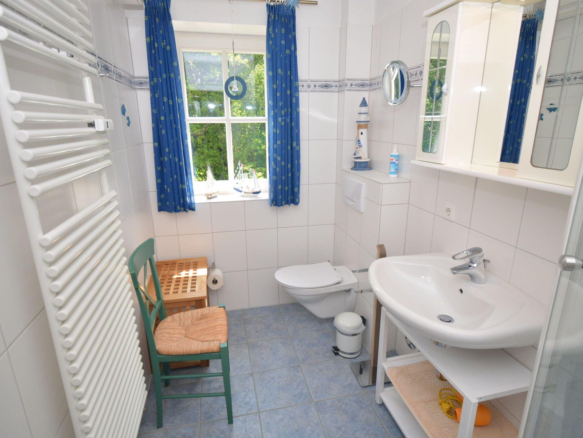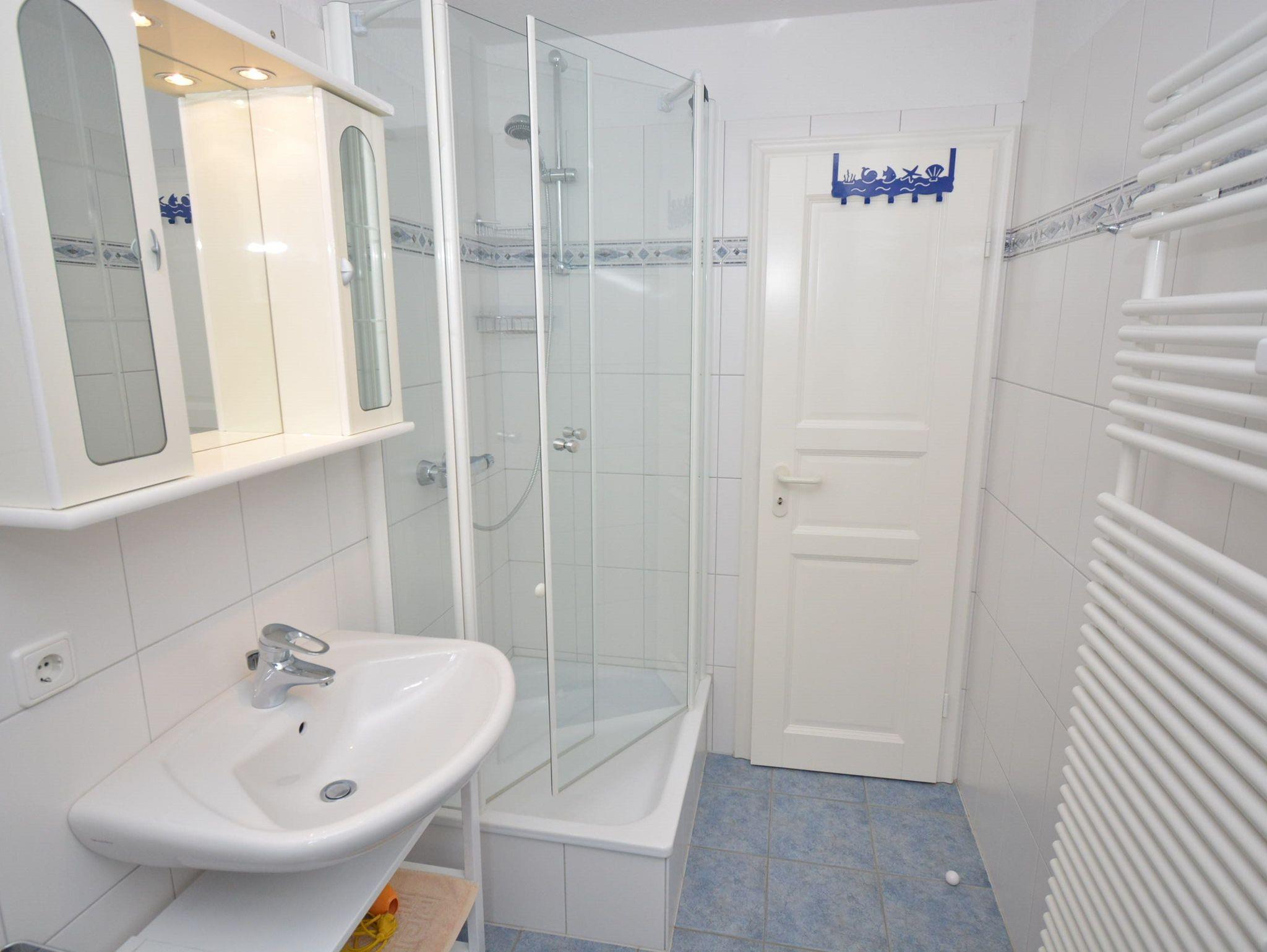 Bad: Bank, Dusche, Duschkabine, Fön, Handtuchheizkörper, Kosmetikspiegel, Spiegelschrank, Waschbecken, WC