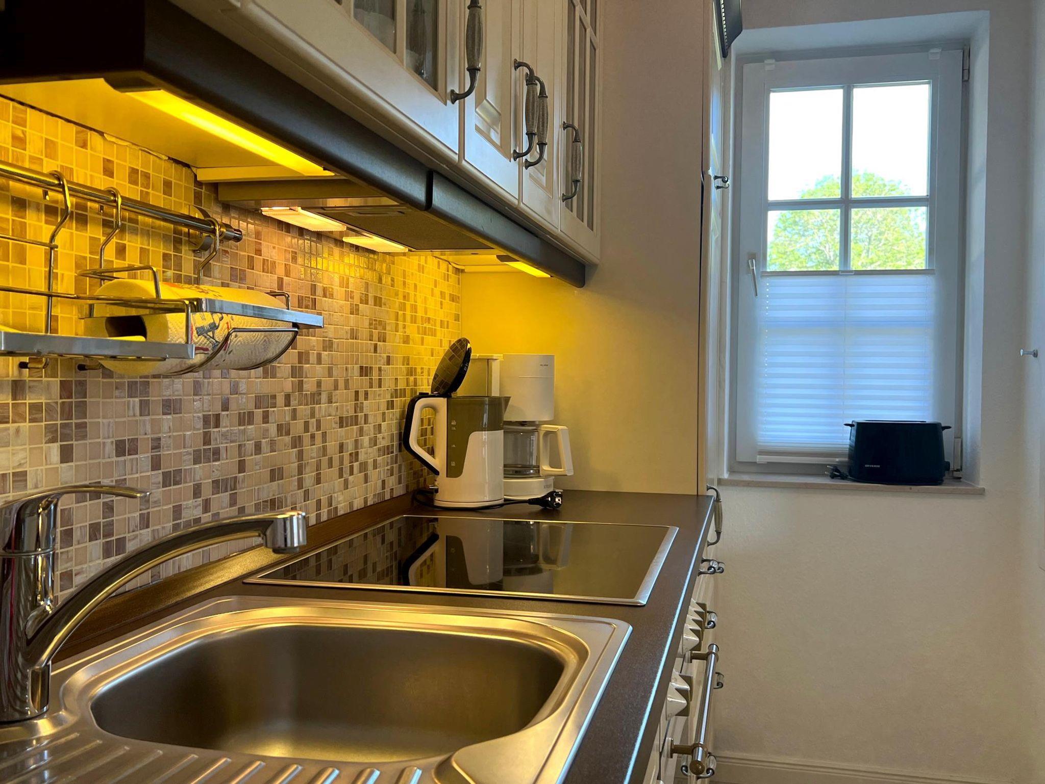 Küche: Einbauküche, 4 Plattenherd mit Ceranfeld und Backofen, Dunstabzugshaube, Kühlschrank mit Gefrierfach, Kaffeemaschine, Wasserkocher, Toaster, Mikrowelle, Handmixer, Geschirr, Kochtöpfe, Pfannen, Spring-Backform, Bügeleisen, Elektrogrill ( nur im Freien verwendbar )