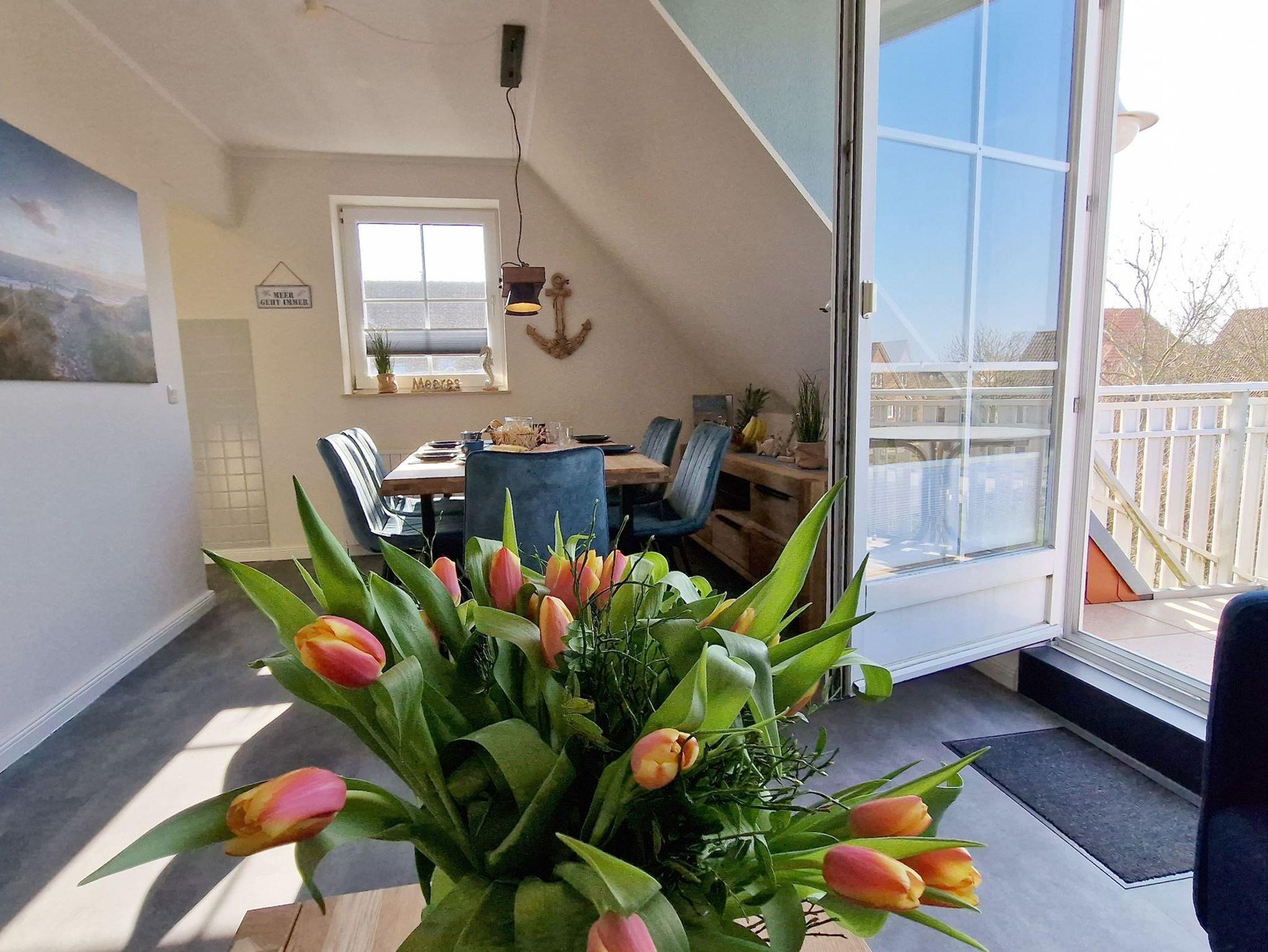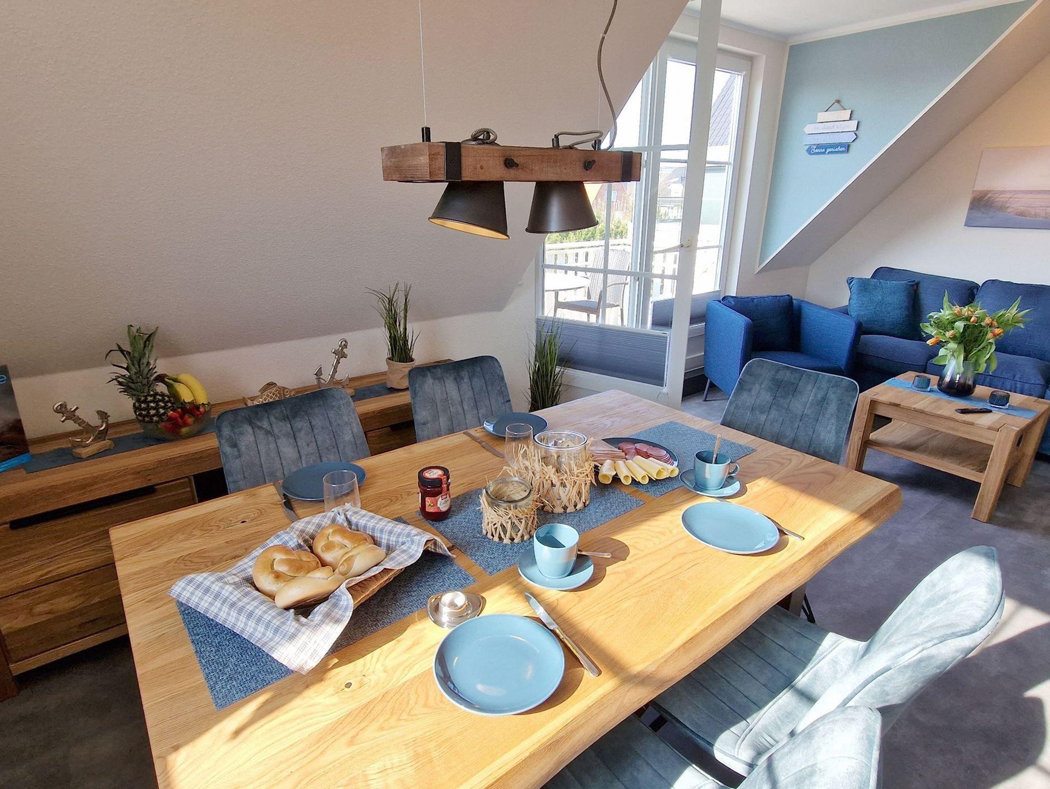 Moderne Einrichtung: Die Küchenzeile ist harmonisch im Wohn-Essbereich integriert und bietet direkten Zugang zum sonnigen Balkon, sodass Sie während Ihrer Mahlzeiten die frische Luft und den Blick auf den Nordseedeich genießen können.