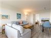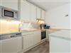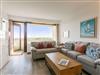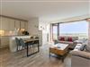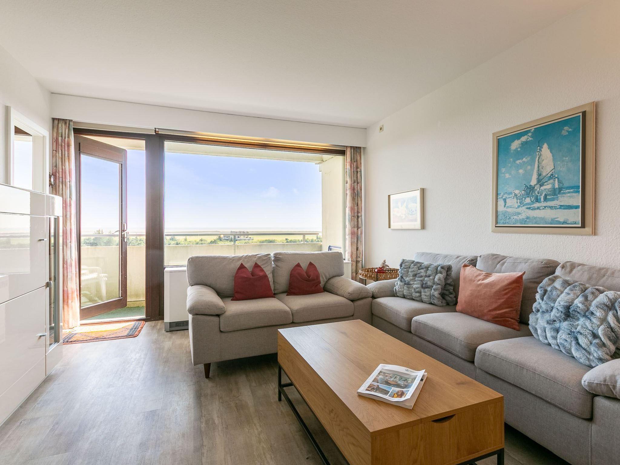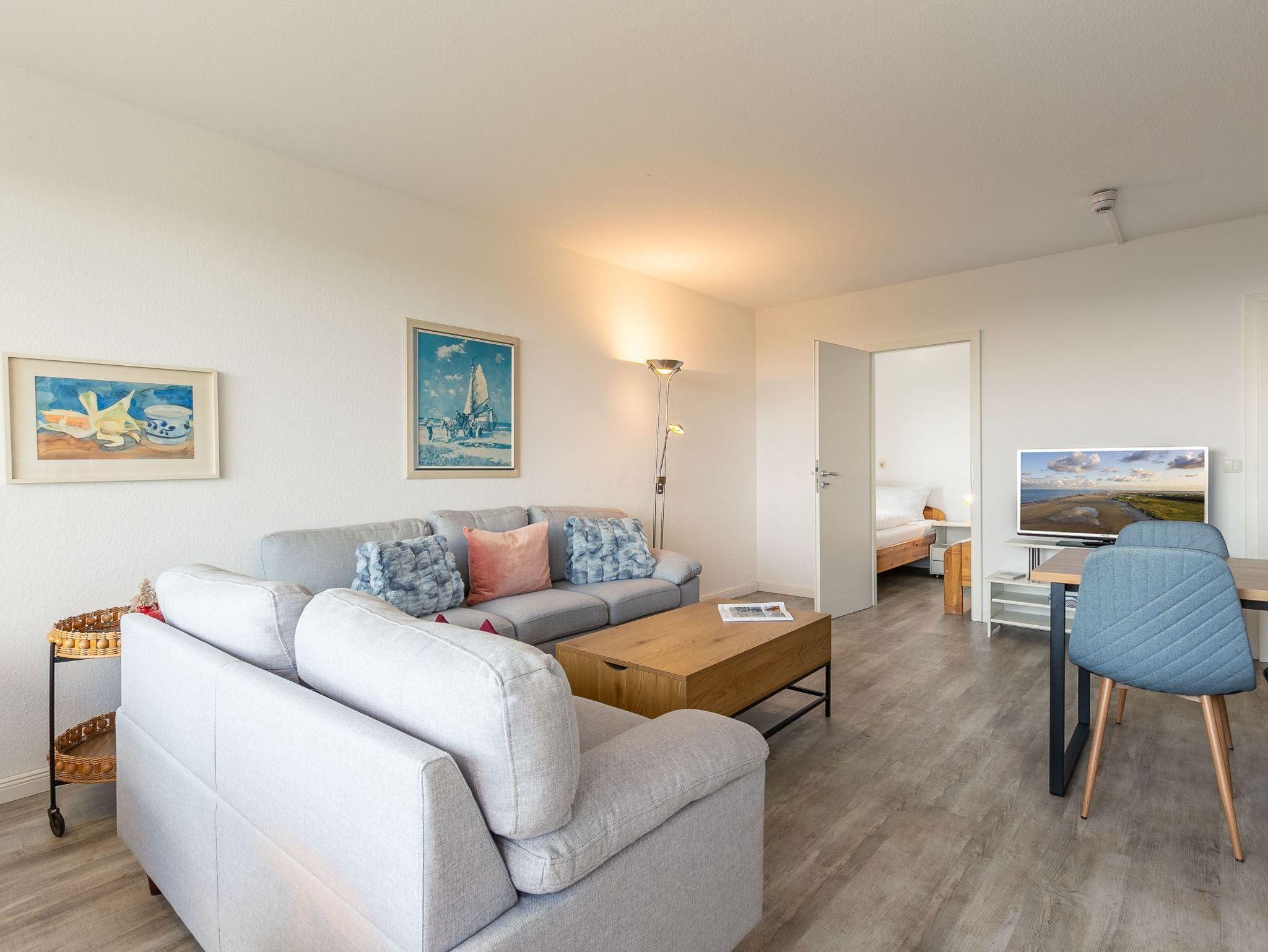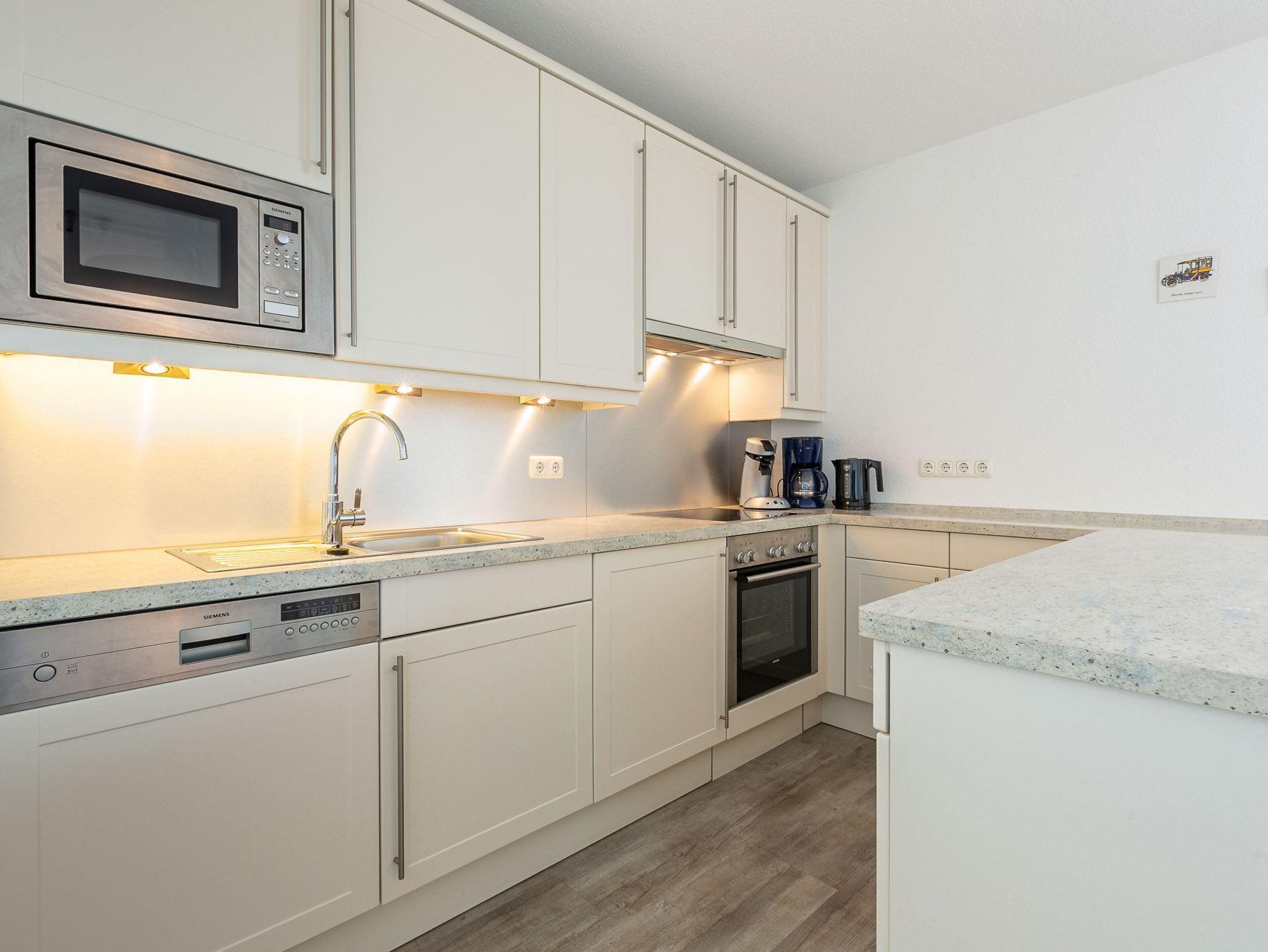 Wohnzimmer mit 2 Sofas, großem TV (Sat), Radio, Esstisch für 4 Personen und wunderschönem Meerblick. Direkter Zugang zum überdachten, möblierten Südwest-Balkon mit weitem Ausblick. Offene Küche mit Backofen, Mikrowelle, Geschirrspüler, Kühlschrank mit Gefrierfach und Philips Senseo Kaffeemaschine. Die Küche ist durch einen Tresen vom Wohnzimmer abgeteilt.